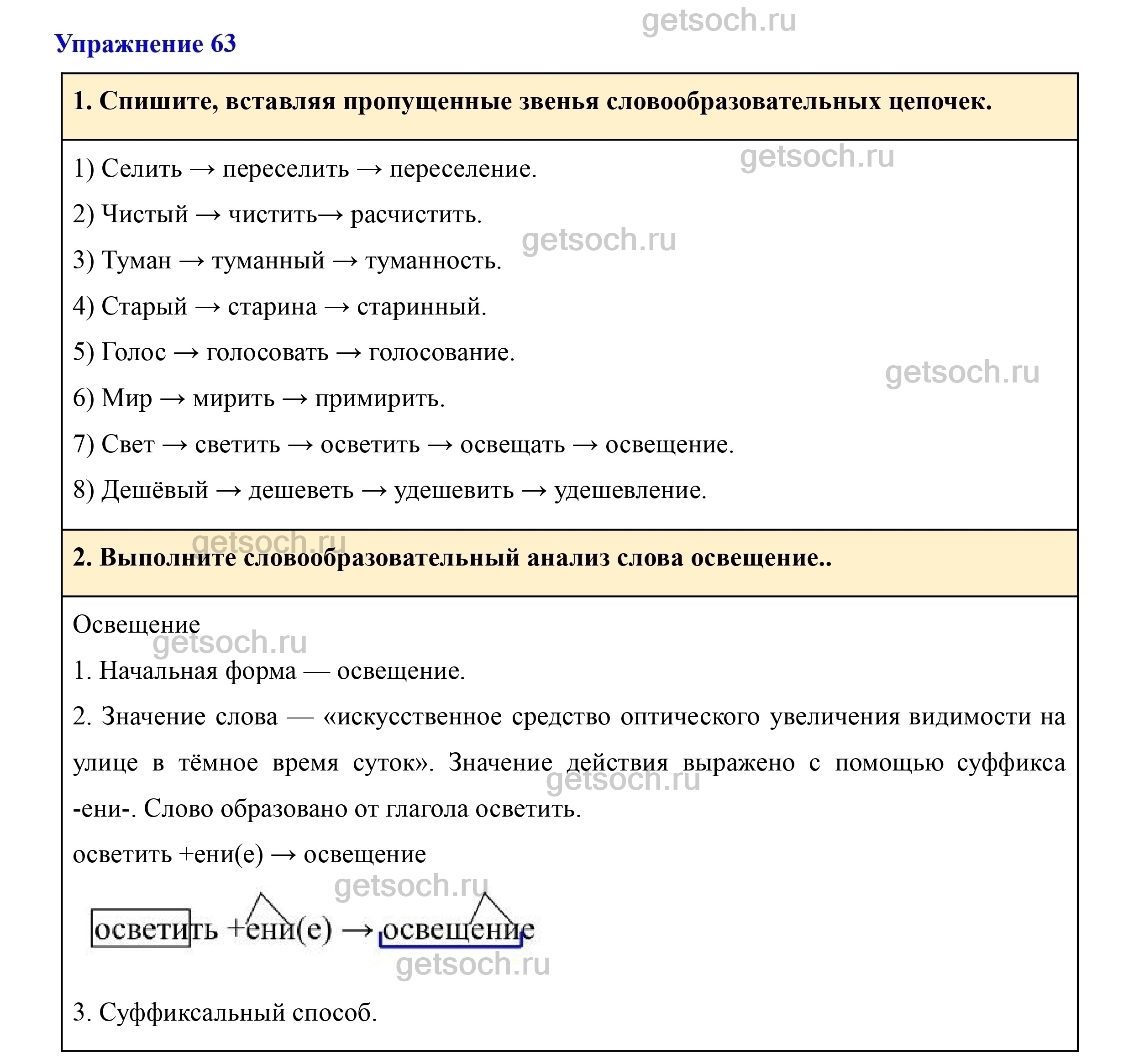 2. Выполните словообразовательный анализ слова освещение..