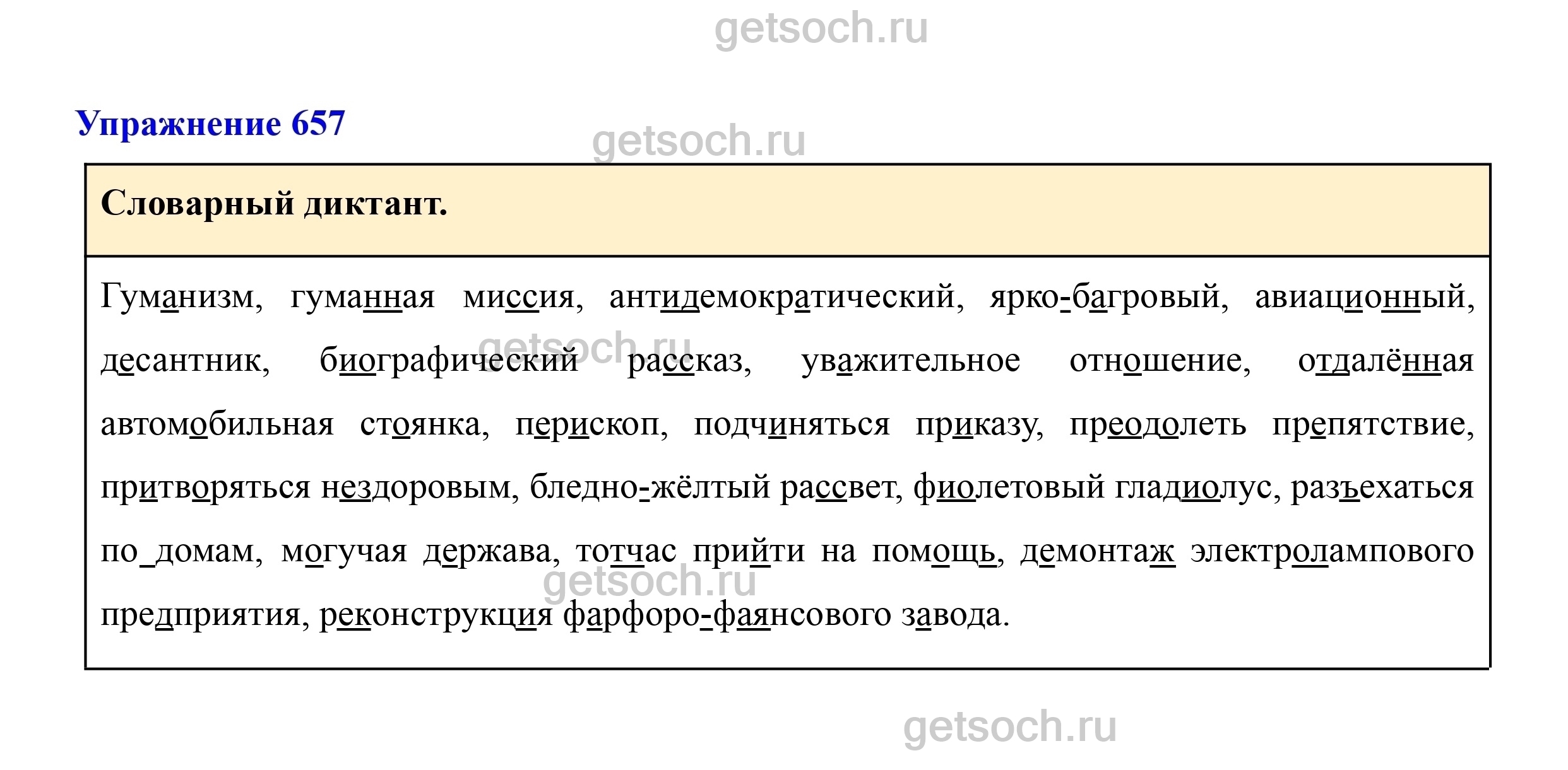 Гуманизм, гуманная миссия, антидемократический, ярко-багровый, авиационный, десантник, биографический рассказ, уважительное отношение, отдалённая автомобильная стоянка, перископ, подчиняться приказу, преодолеть препятствие, притворяться нездоровым, бледно-жёлтый рассвет, фиолетовый гладиолус, разъехаться по домам, могучая держава, тотчас прийти на помощь, демонтаж электролампового предприятия, реконструкция фарфоро-фаянсового завода.