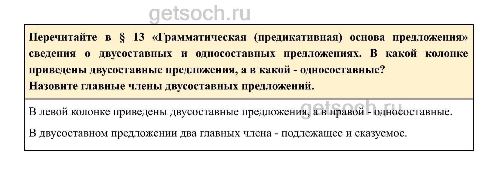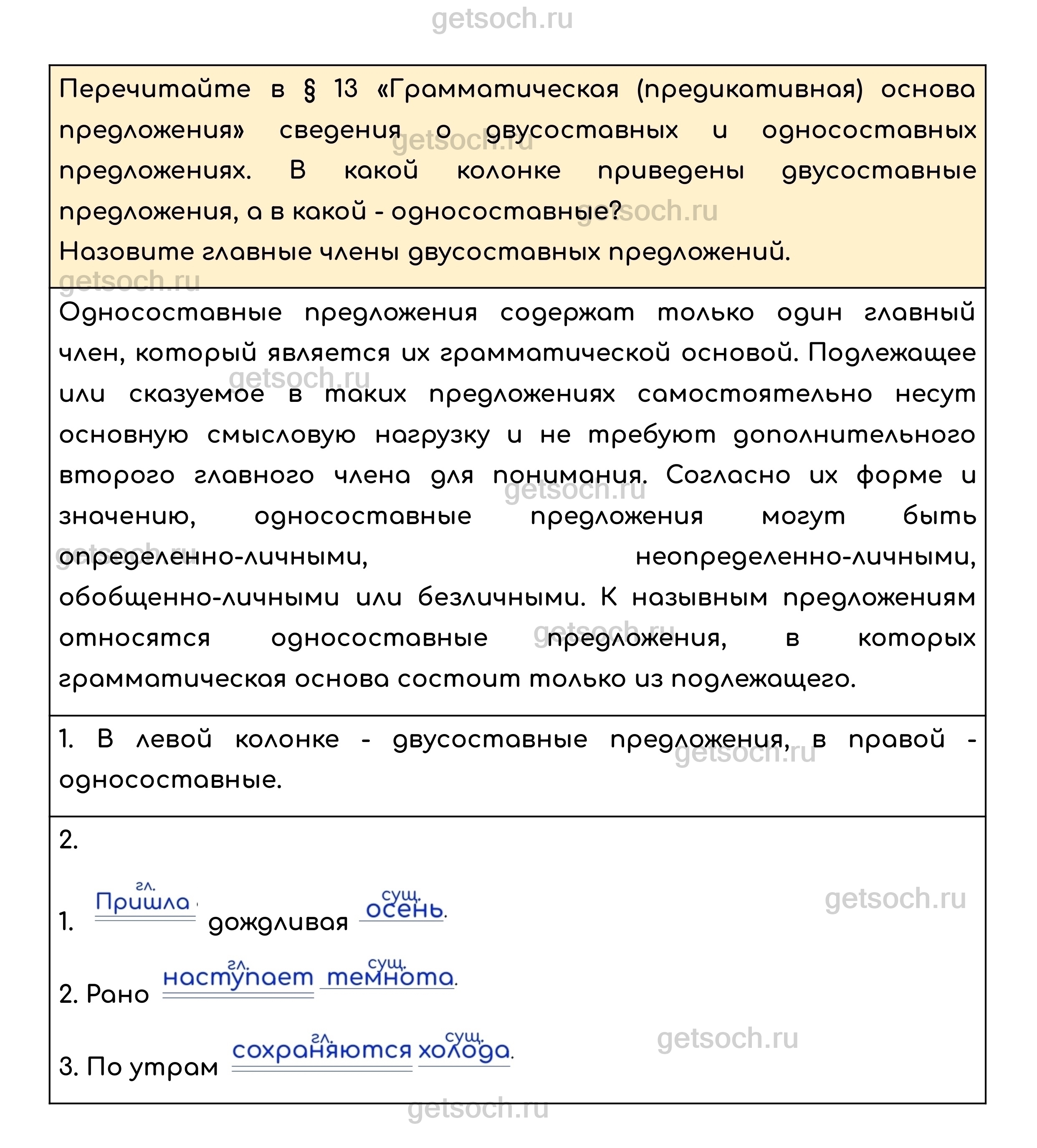 Перечитайте в § 13 «Грамматическая (предикативная) основа предложения» сведения о двусоставных и односоставных предложениях. В какой колонке приведены двусоставные предложения, а в какой – односоставные?