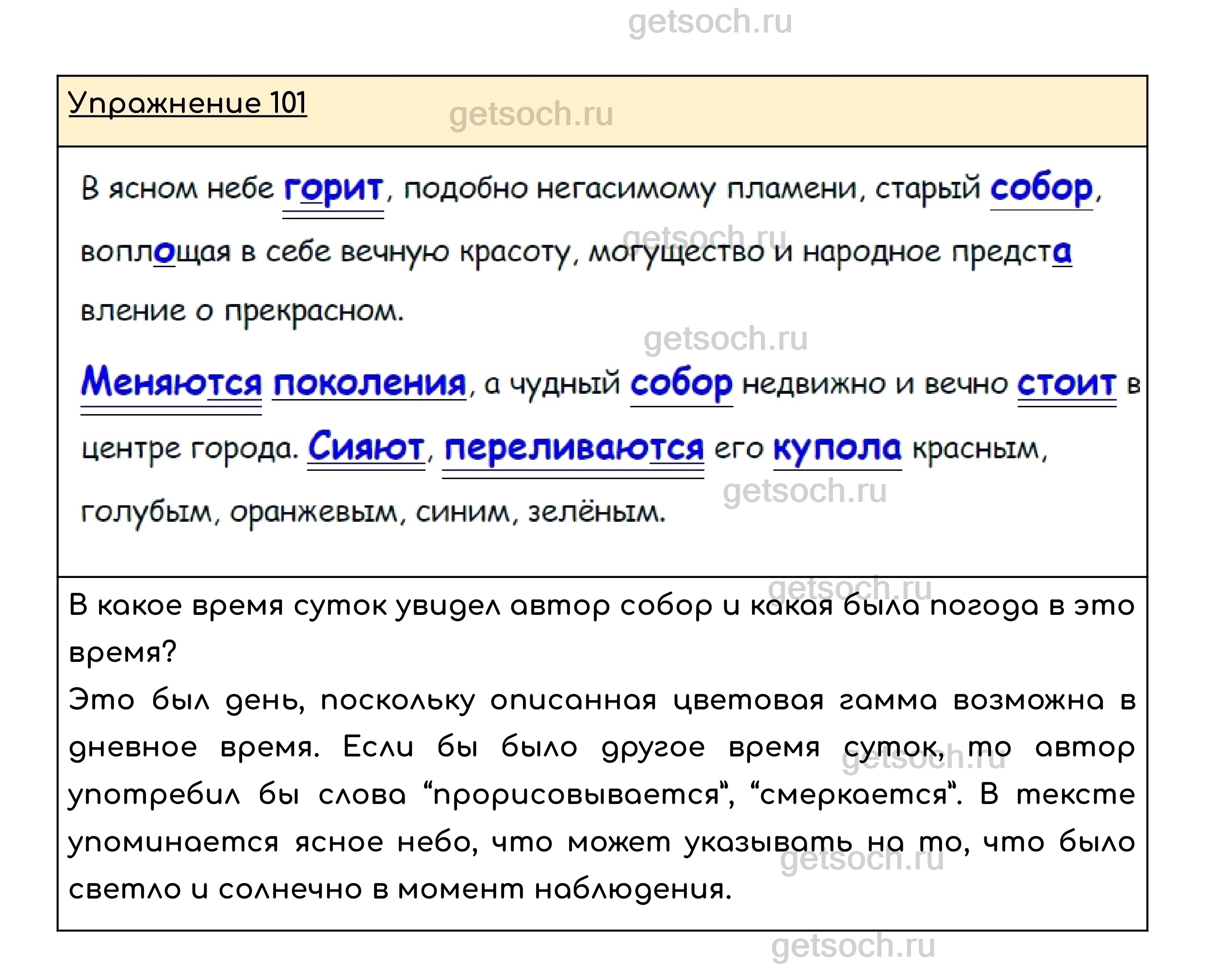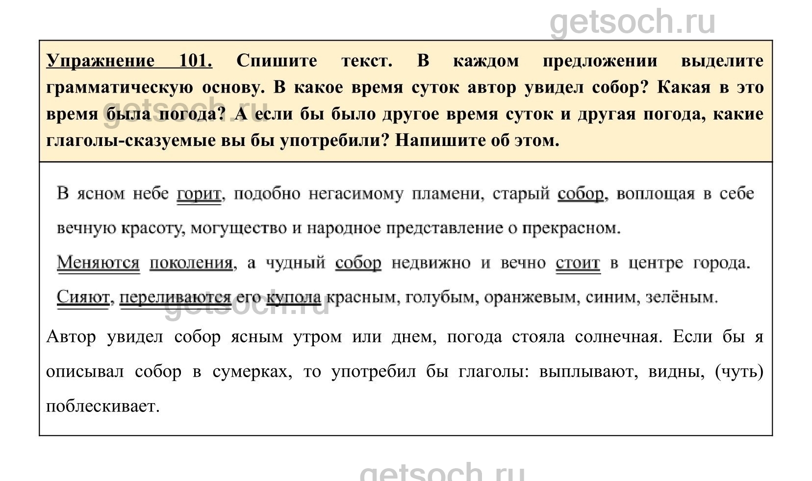 Упражнение 101. Спишите текст. В каждом предложении выделите грамматическую основу. В какое время суток автор увидел собор? Какая в это время была погода? А если бы было другое время суток и другая погода, какие глаголы-сказуемые вы бы употребили? Напишите об этом.