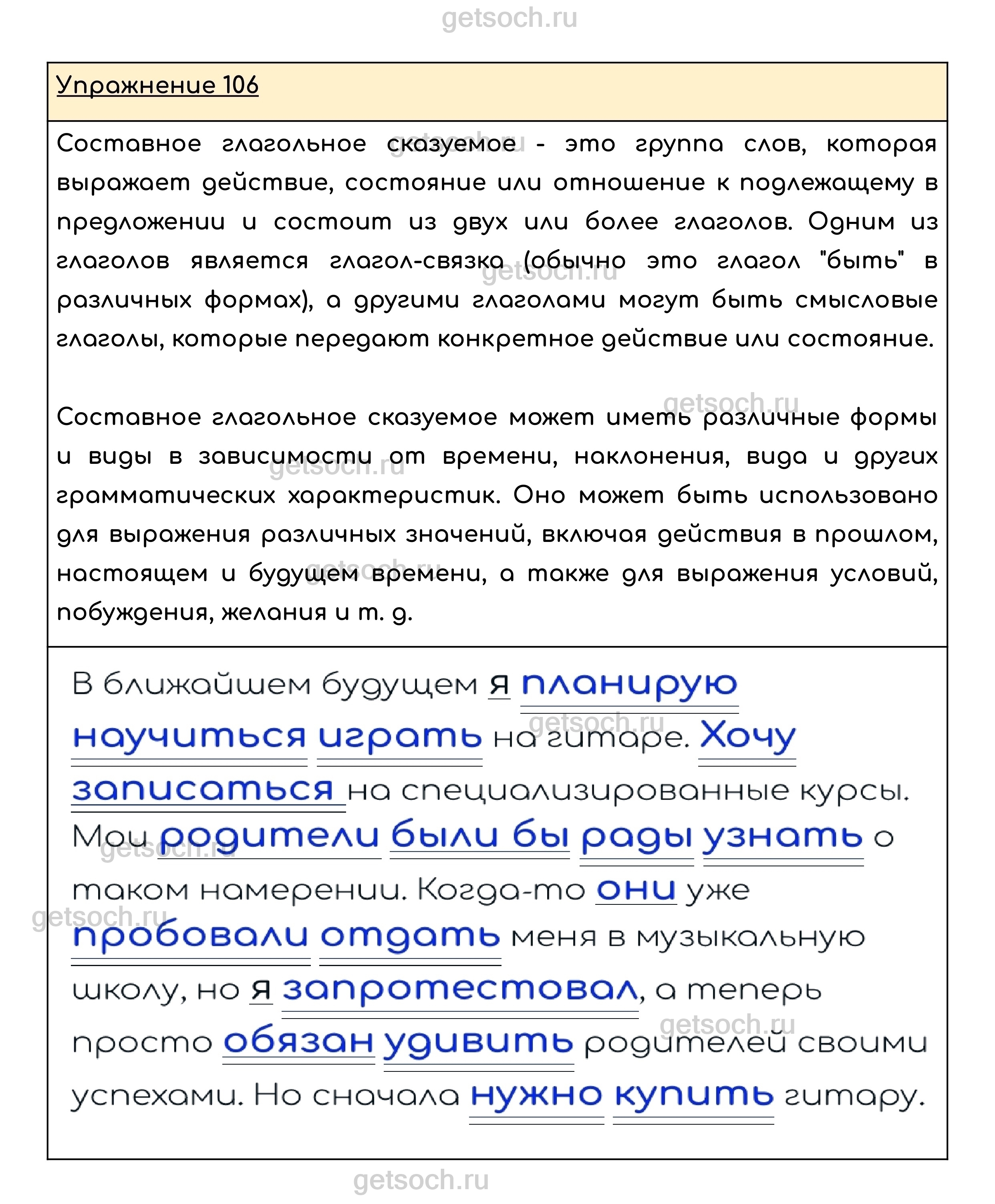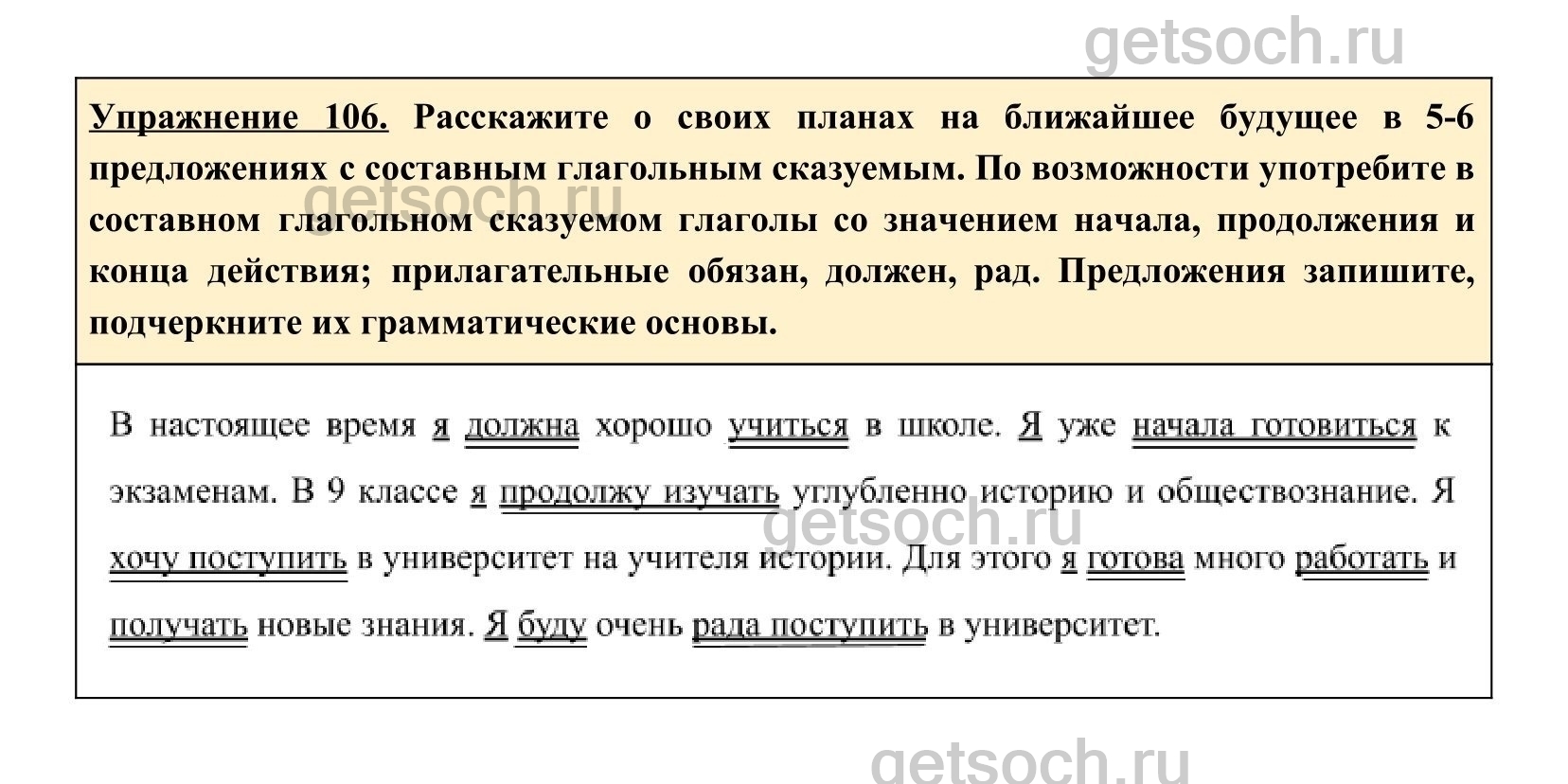 Упражнение 106. Расскажите о своих планах на ближайшее будущее в 5-6 предложениях с составным глагольным сказуемым. По возможности употребите в составном глагольном сказуемом глаголы со значением начала, продолжения и конца действия; прилагательные обязан, должен, рад. Предложения запишите, подчеркните их грамматические основы.