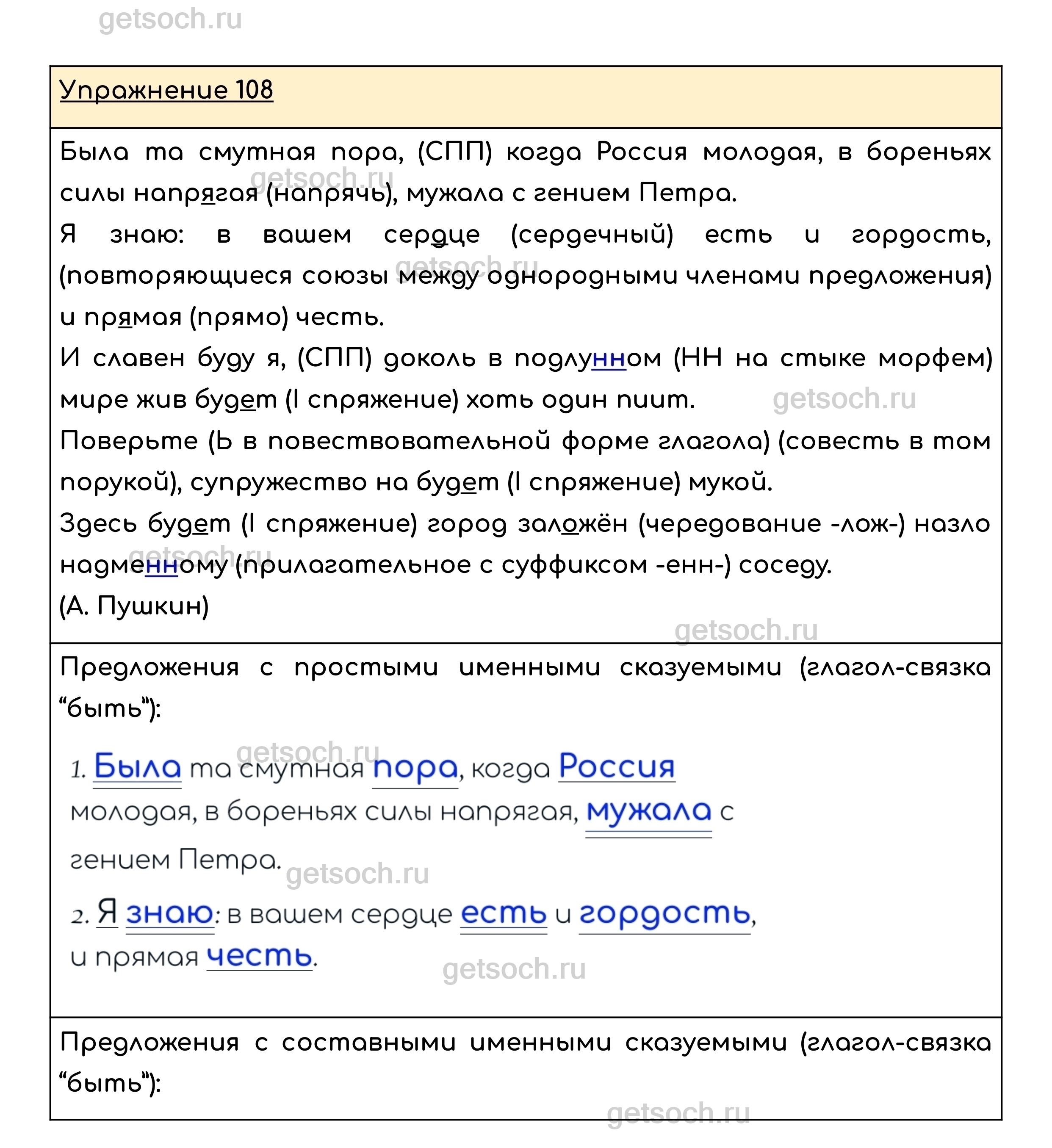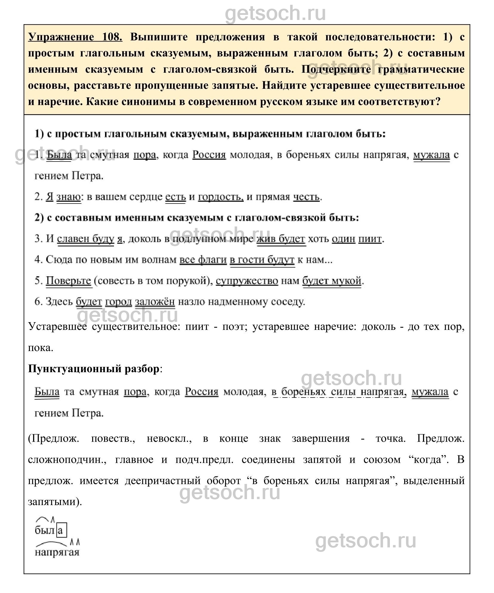 Упражнение 108. Выпишите предложения в такой последовательности: 1) с простым глагольным сказуемым, выраженным глаголом быть; 2) с составным именным сказуемым с глаголом-связкой быть. Подчеркните грамматические основы, расставьте пропущенные запятые. Найдите устаревшее существительное и наречие. Какие синонимы в современном русском языке им соответствуют?