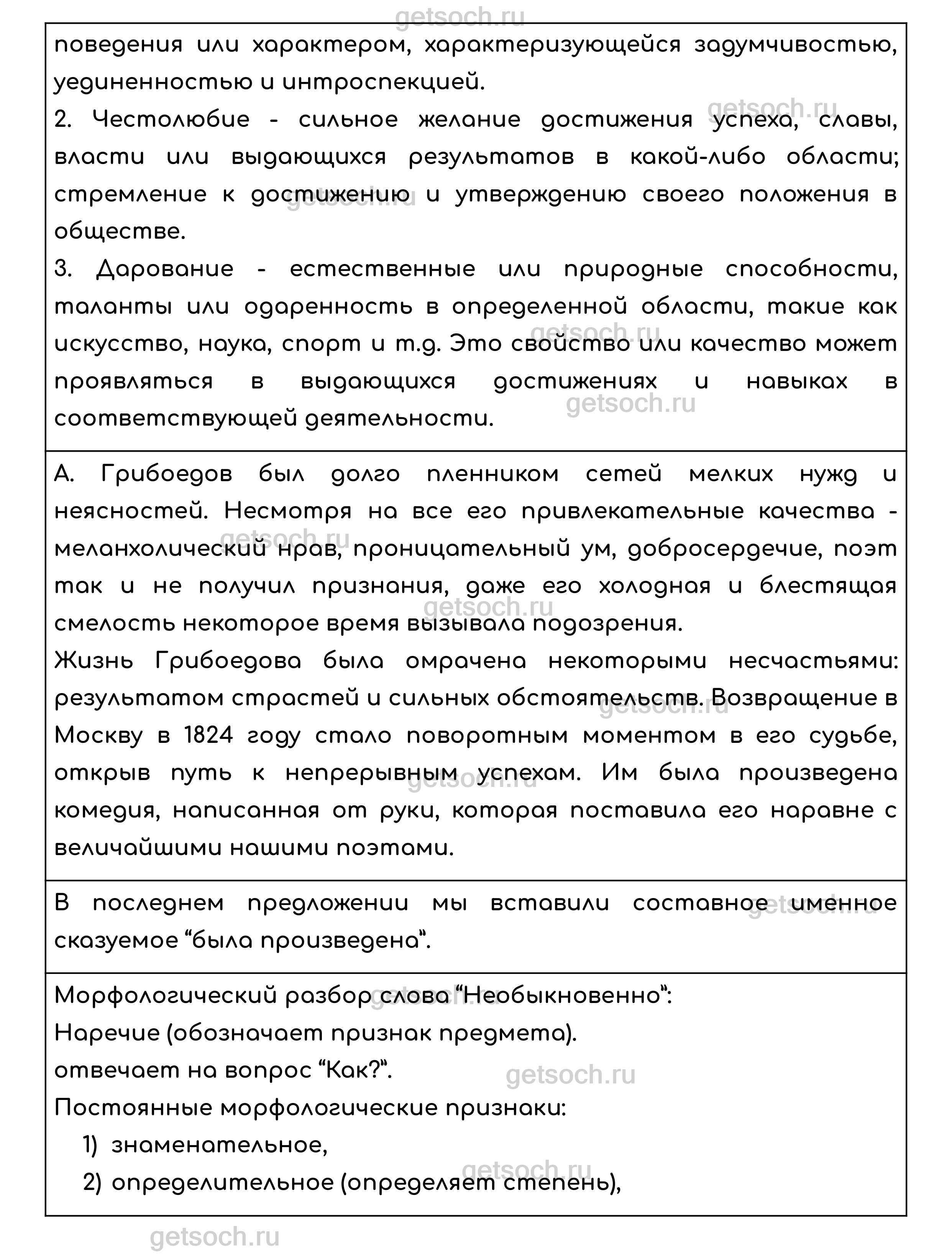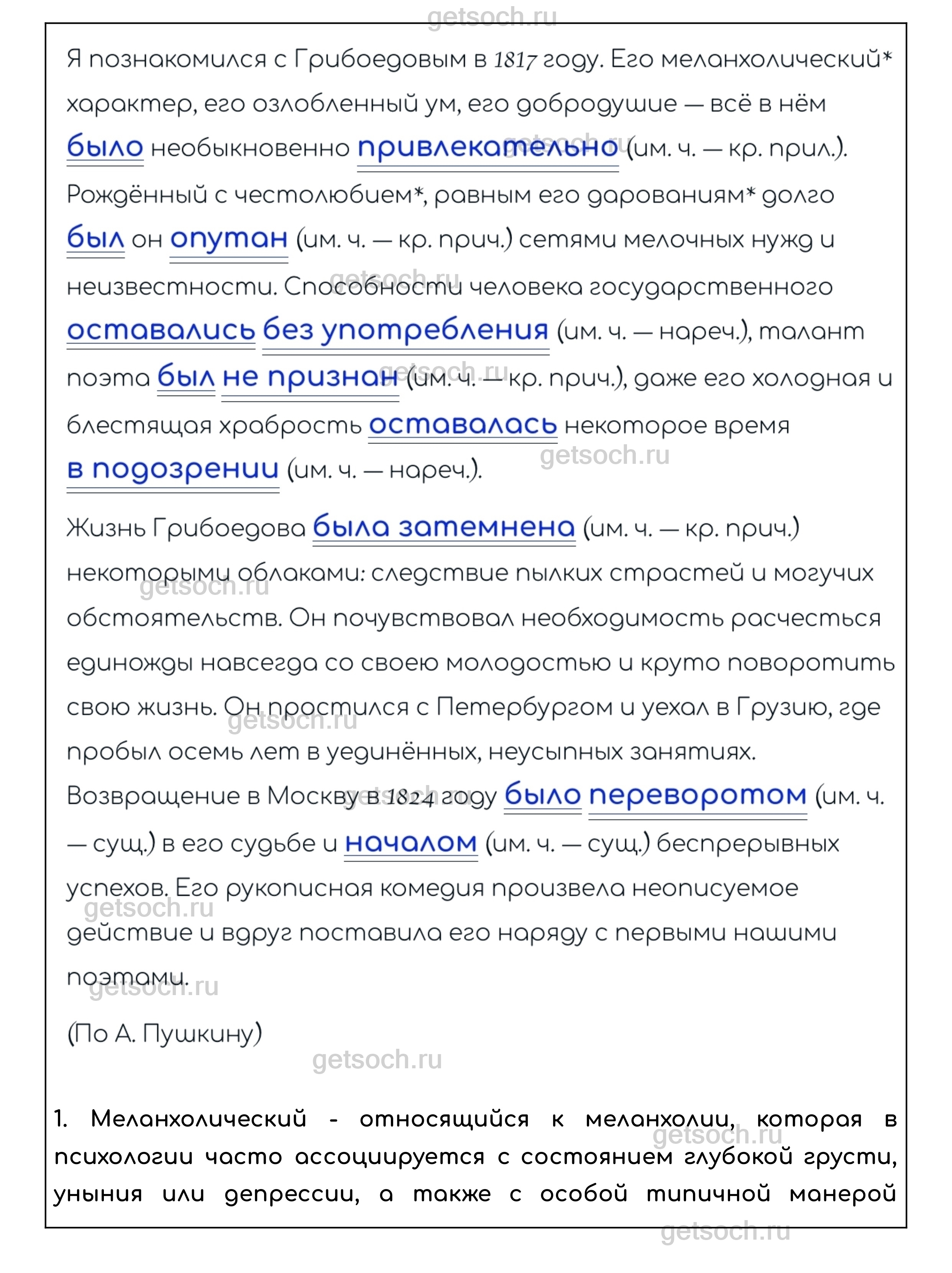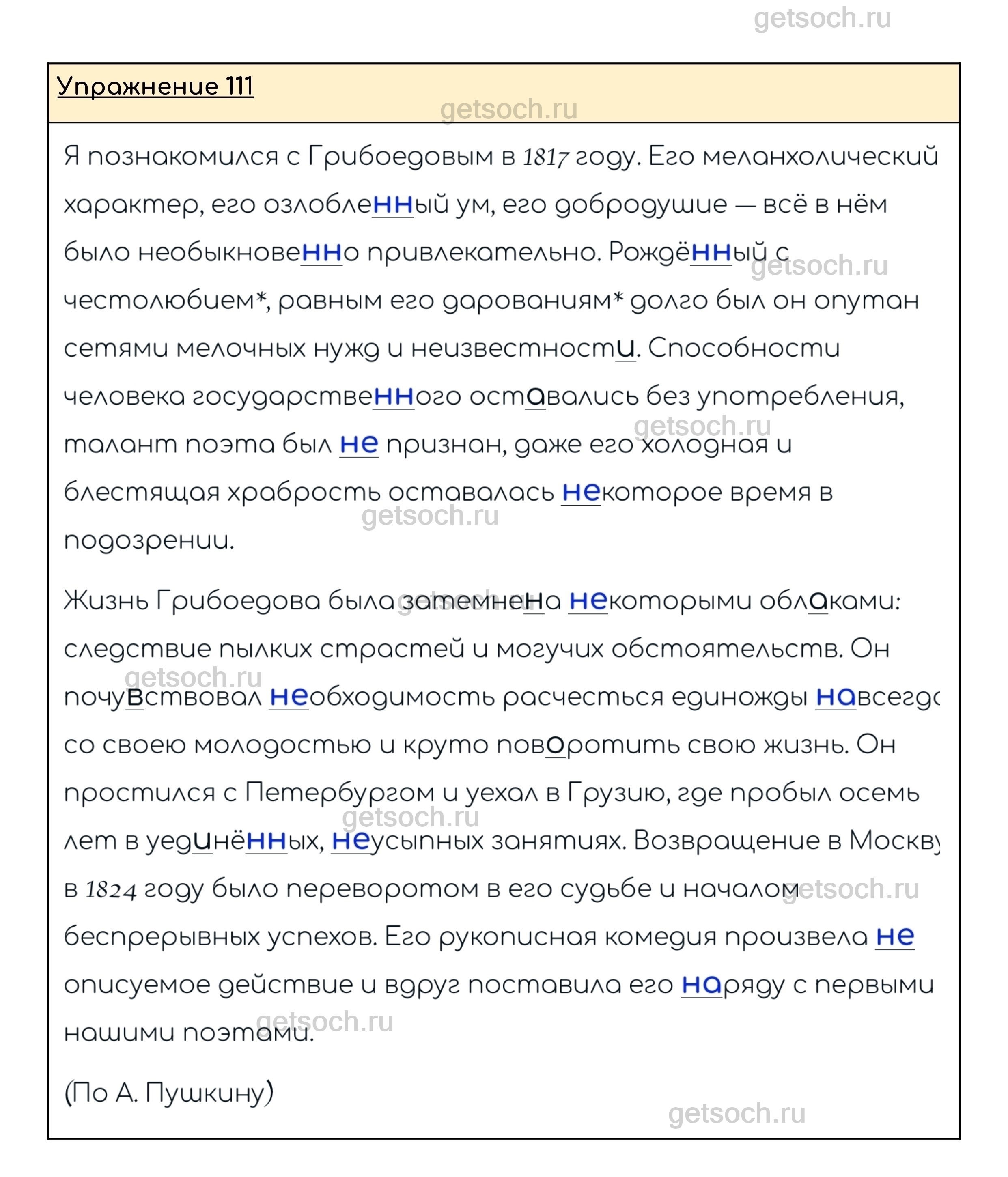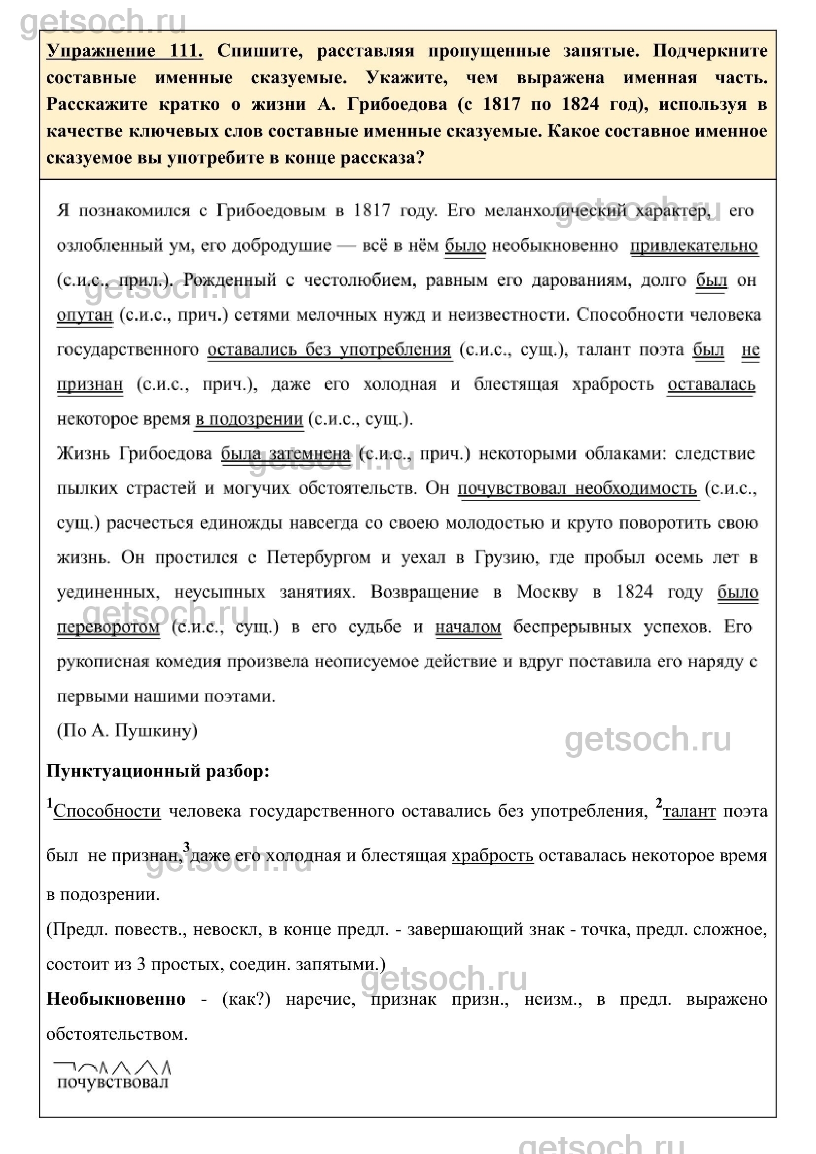 Упражнение 111. Спишите, расставляя пропущенные запятые. Подчеркните составные именные сказуемые. Укажите, чем выражена именная часть. Расскажите кратко о жизни А. Грибоедова (с 1817 по 1824 год), используя в качестве ключевых слов составные именные сказуемые. Какое составное именное сказуемое вы употребите в конце рассказа?