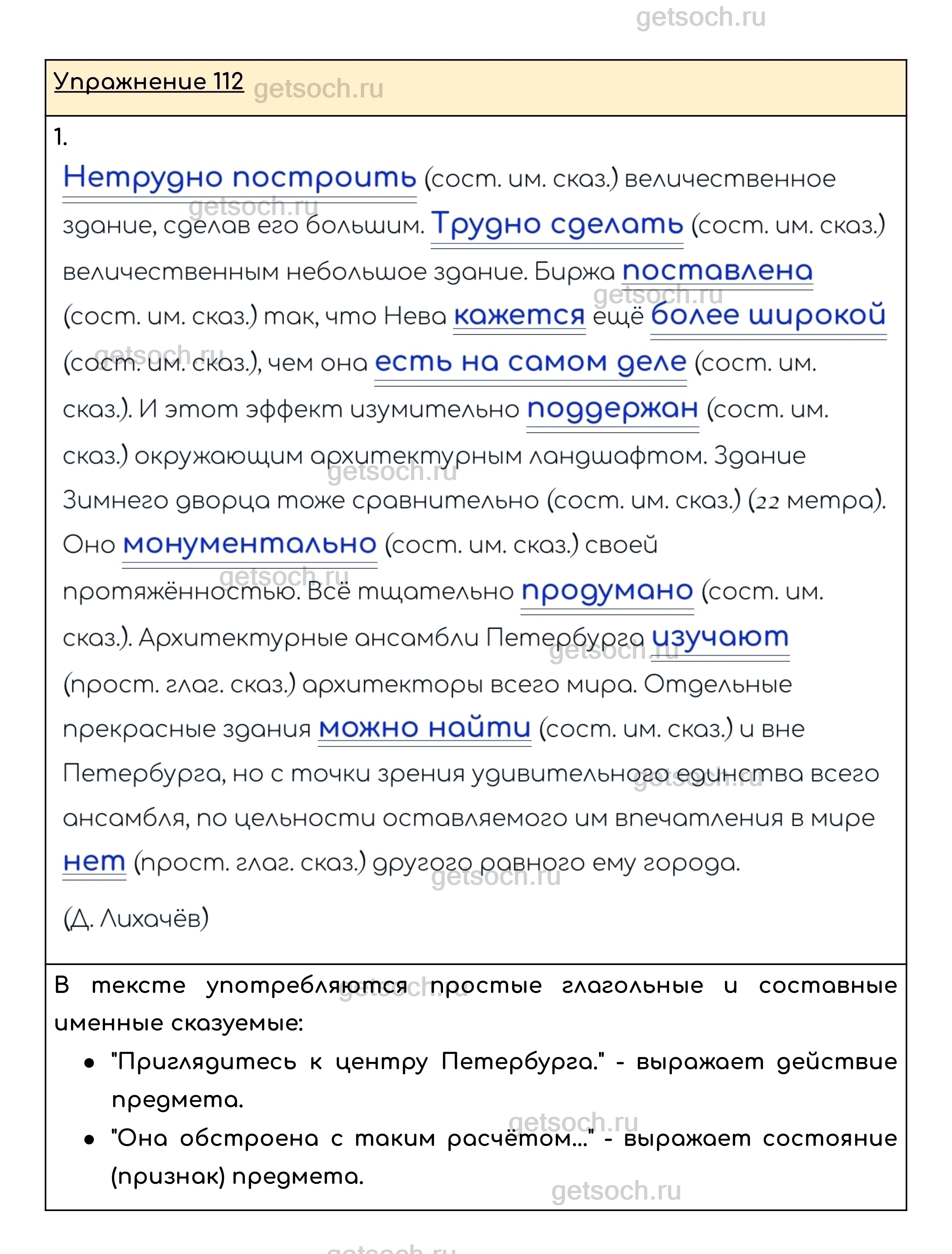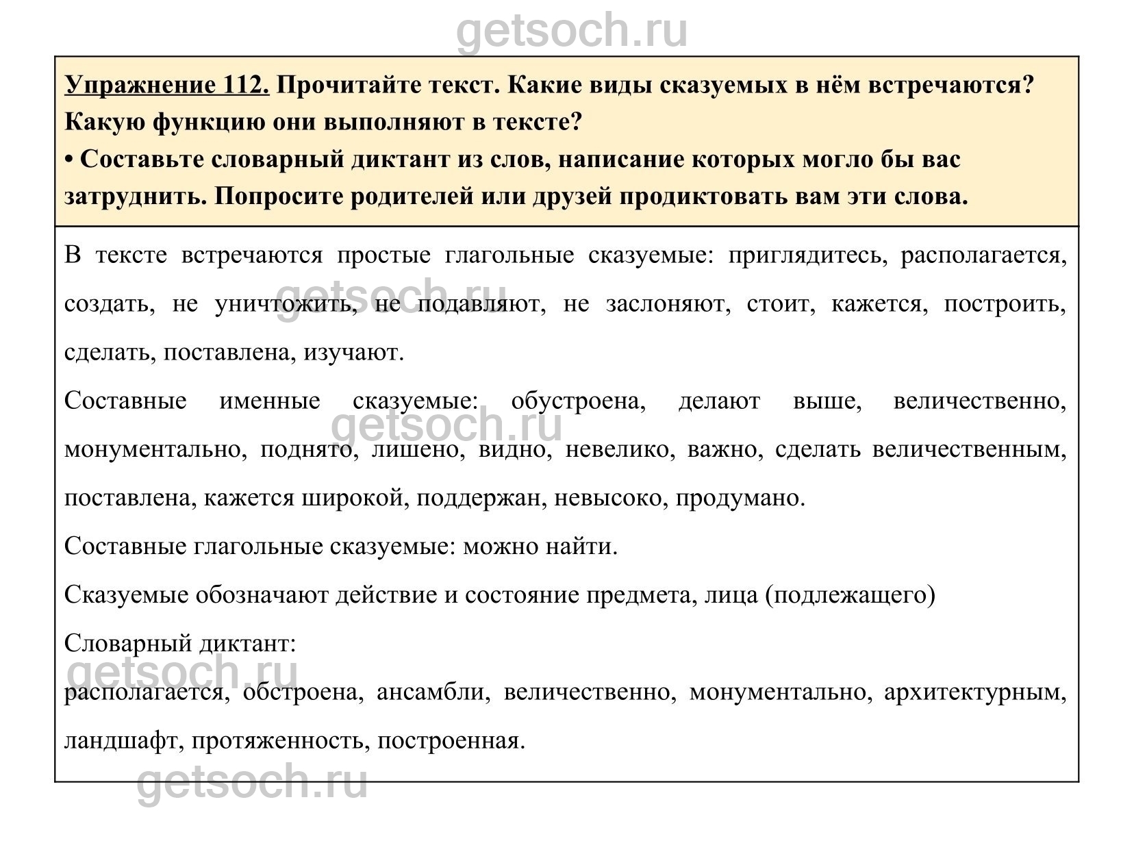 Упражнение 112. Прочитайте текст. Какие виды сказуемых в нём встречаются? Какую функцию они выполняют в тексте?