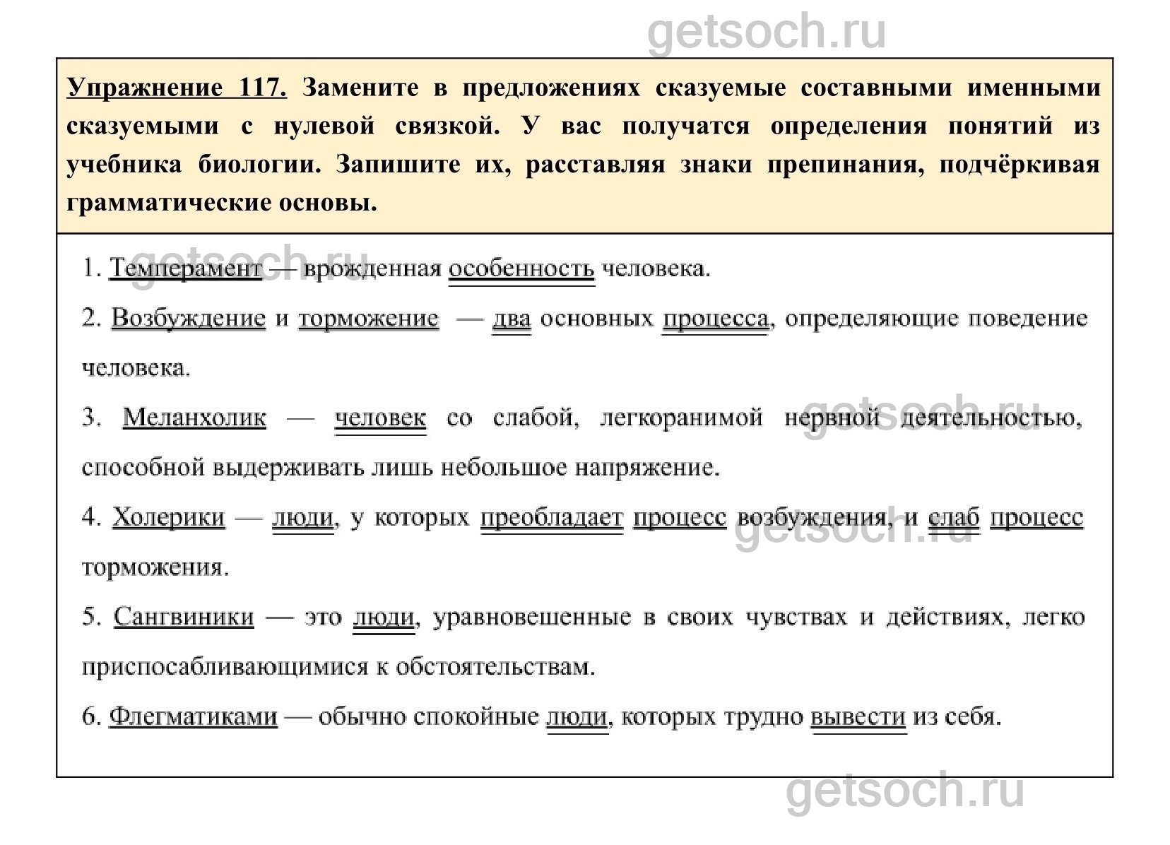 Упражнение 117. Замените в предложениях сказуемые составными именными сказуемыми с нулевой связкой. У вас получатся определения понятий из учебника биологии. Запишите их, расставляя знаки препинания, подчёркивая грамматические основы.