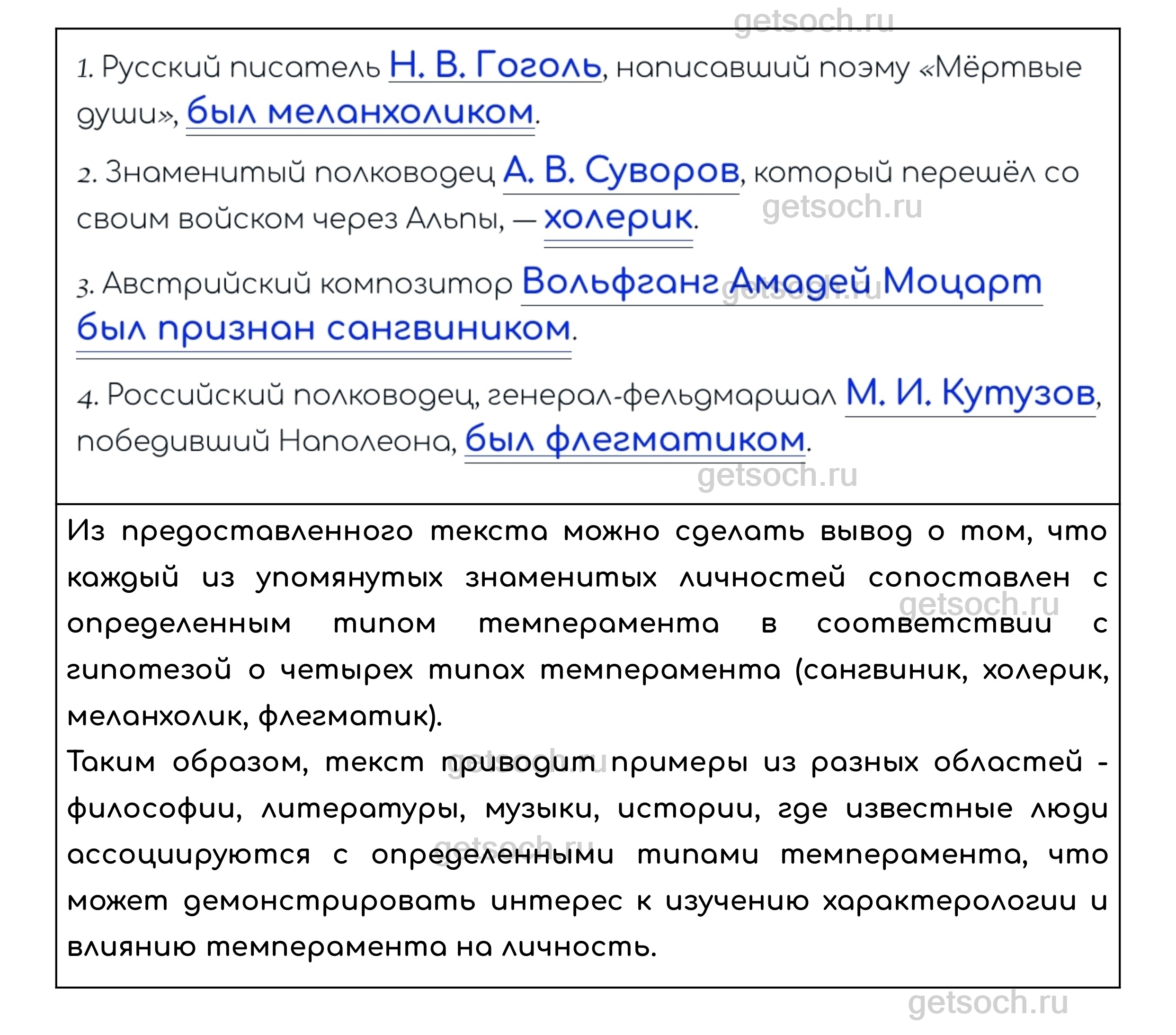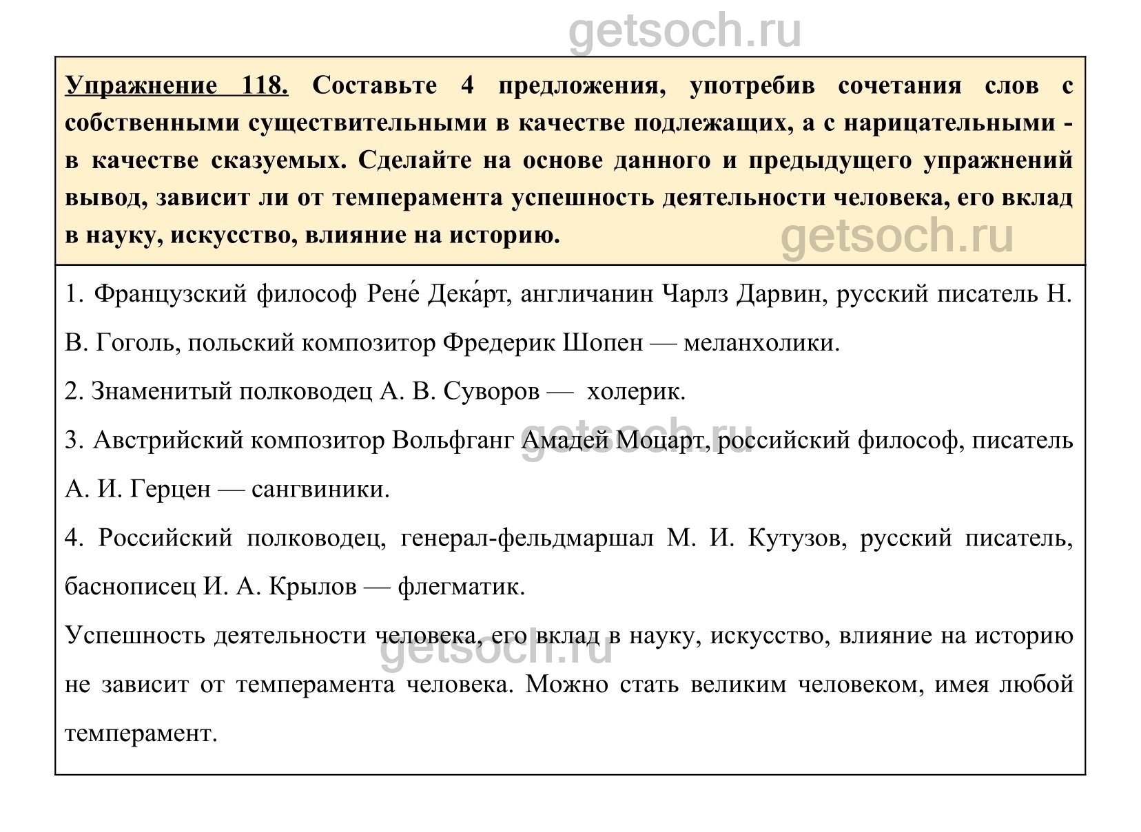 Упражнение 118. Составьте 4 предложения, употребив сочетания слов с собственными существительными в качестве подлежащих, а с нарицательными – в качестве сказуемых. Сделайте на основе данного и предыдущего упражнений вывод, зависит ли от темперамента успешность деятельности человека, его вклад в науку, искусство, влияние на историю.