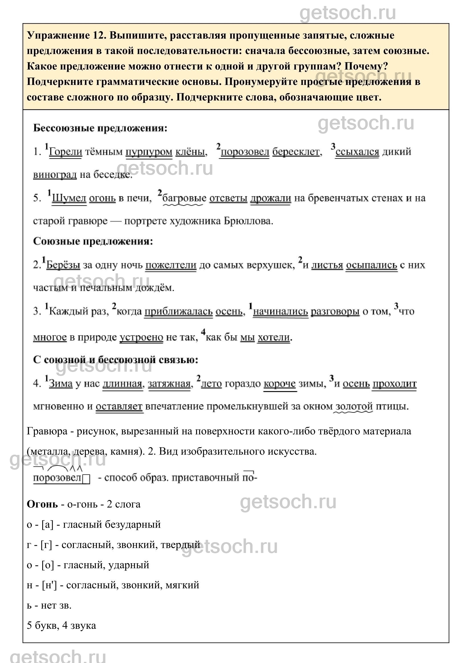 Упражнение 12. Выпишите, расставляя пропущенные запятые, сложные предложения в такой последовательности: сначала бессоюзные, затем союзные. Какое предложение можно отнести к одной и другой группам? Почему? Подчеркните грамматические основы. Пронумеруйте простые предложения в составе сложного по образцу. Подчеркните слова, обозначающие цвет.