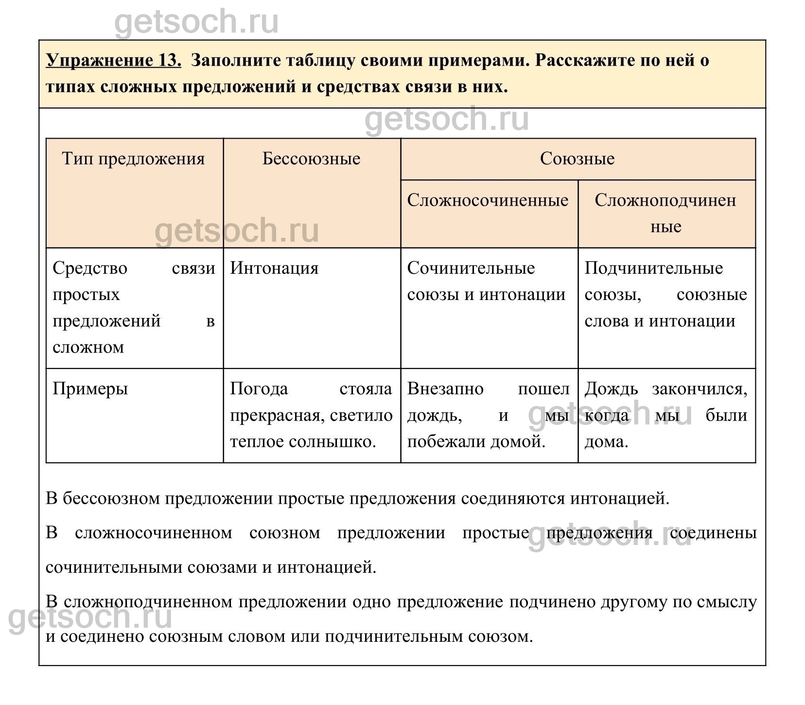 Упражнение 13. Заполните таблицу своими примерами. Расскажите по ней о типах сложных предложений и средствах связи в них.