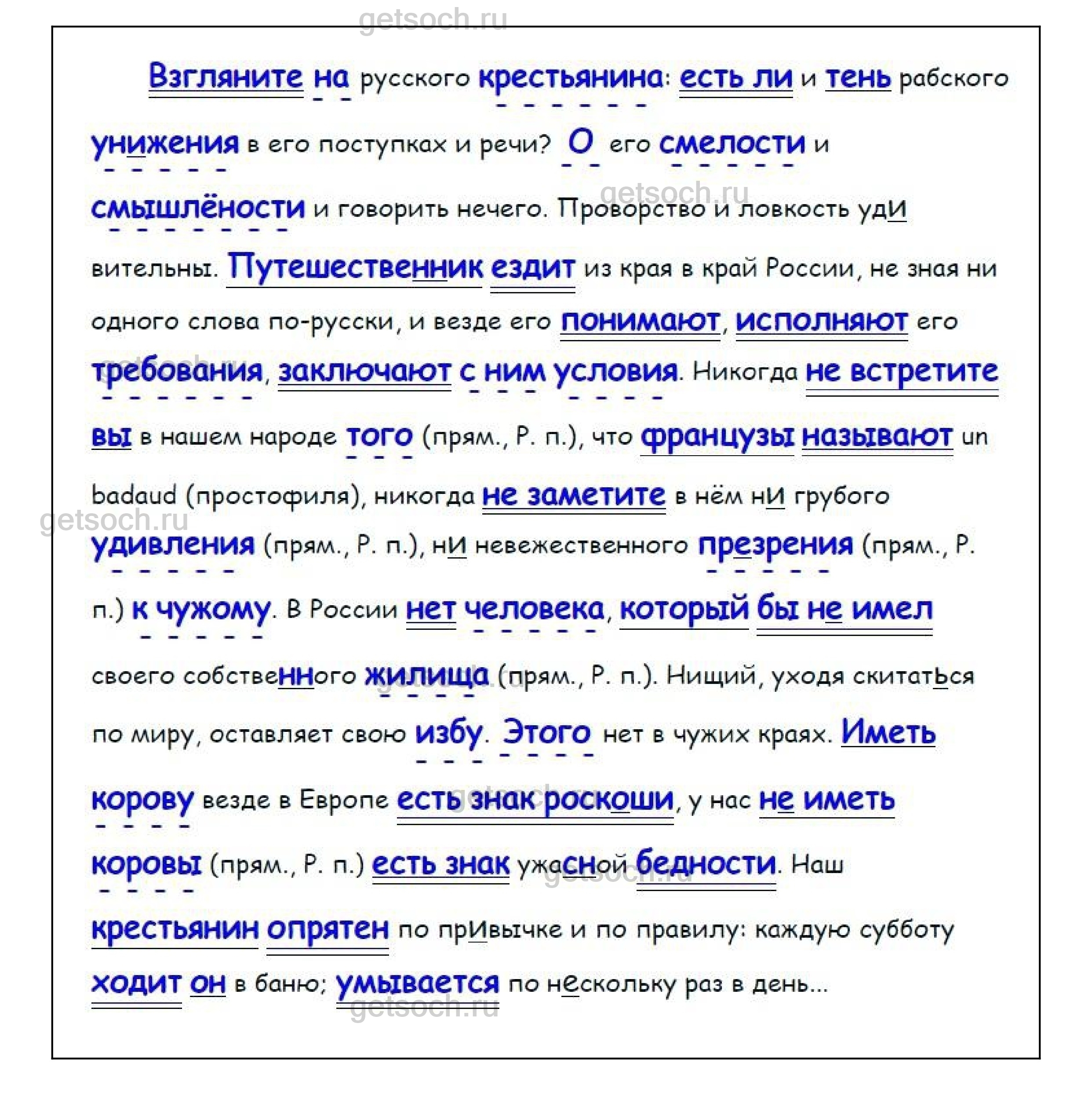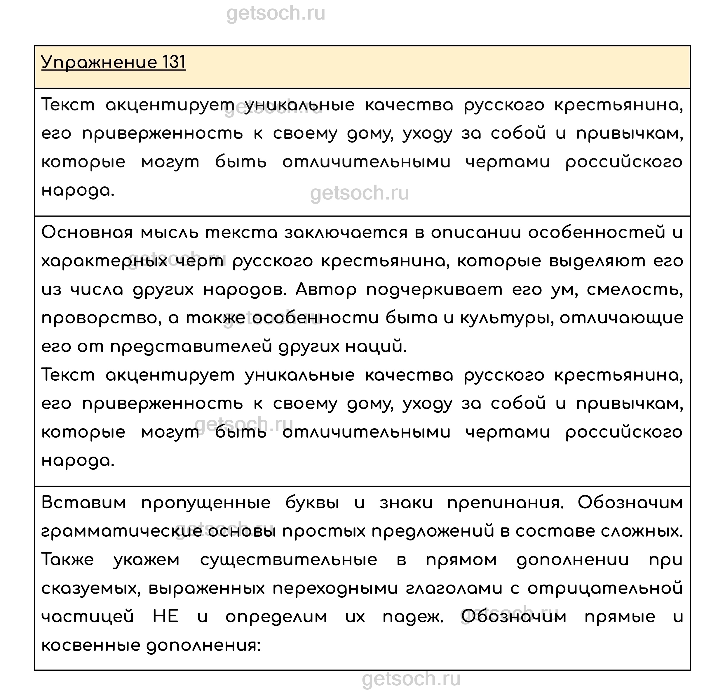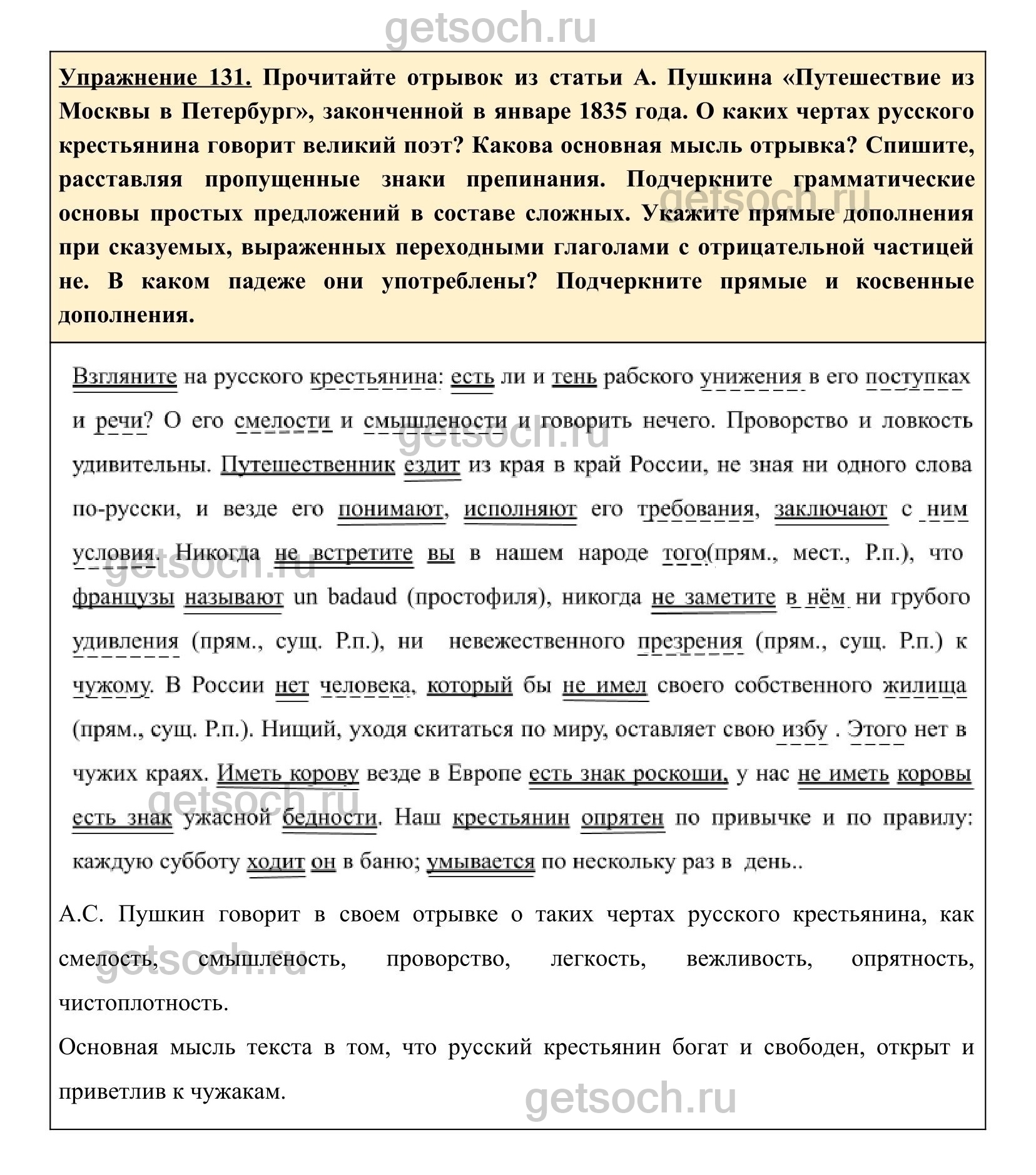 Упражнение 131. Прочитайте отрывок из статьи А. Пушкина «Путешествие из Москвы в Петербург», законченной в январе 1835 года. О каких чертах русского крестьянина говорит великий поэт? Какова основная мысль отрывка? Спишите, расставляя пропущенные знаки препинания. Подчеркните грамматические основы простых предложений в составе сложных. Укажите прямые дополнения при сказуемых, выраженных переходными глаголами с отрицательной частицей не. В каком падеже они употреблены? Подчеркните прямые и косвенные дополнения.
