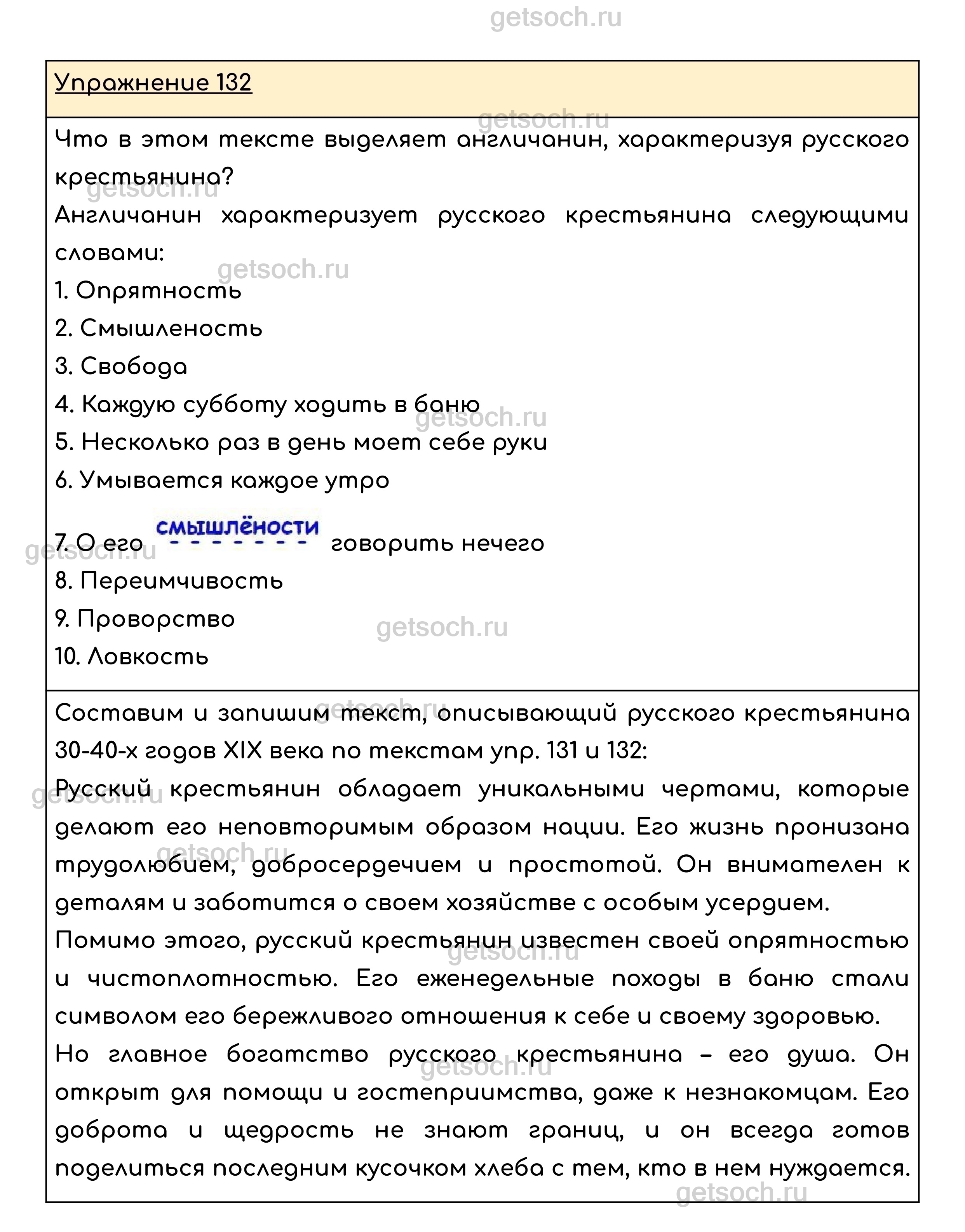 Охарактеризуйте русского крестьянина 30-40-х годов XIX века по текстам упр. 131 и 132. Выделите в обоих текстах общее при характеристике духовных качеств, ума, физического облика, отношения к чужеземному. Запишите составленный вами текст.