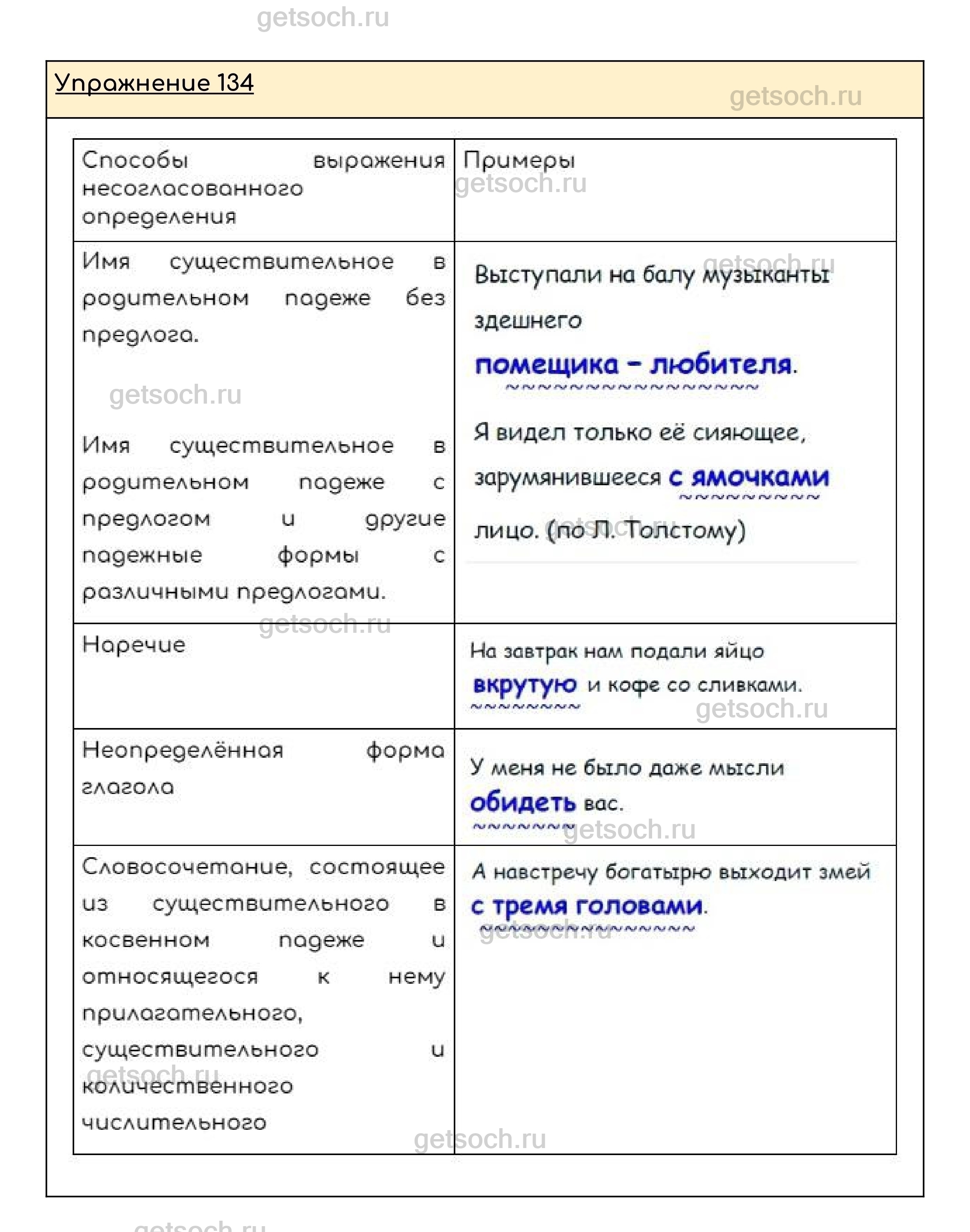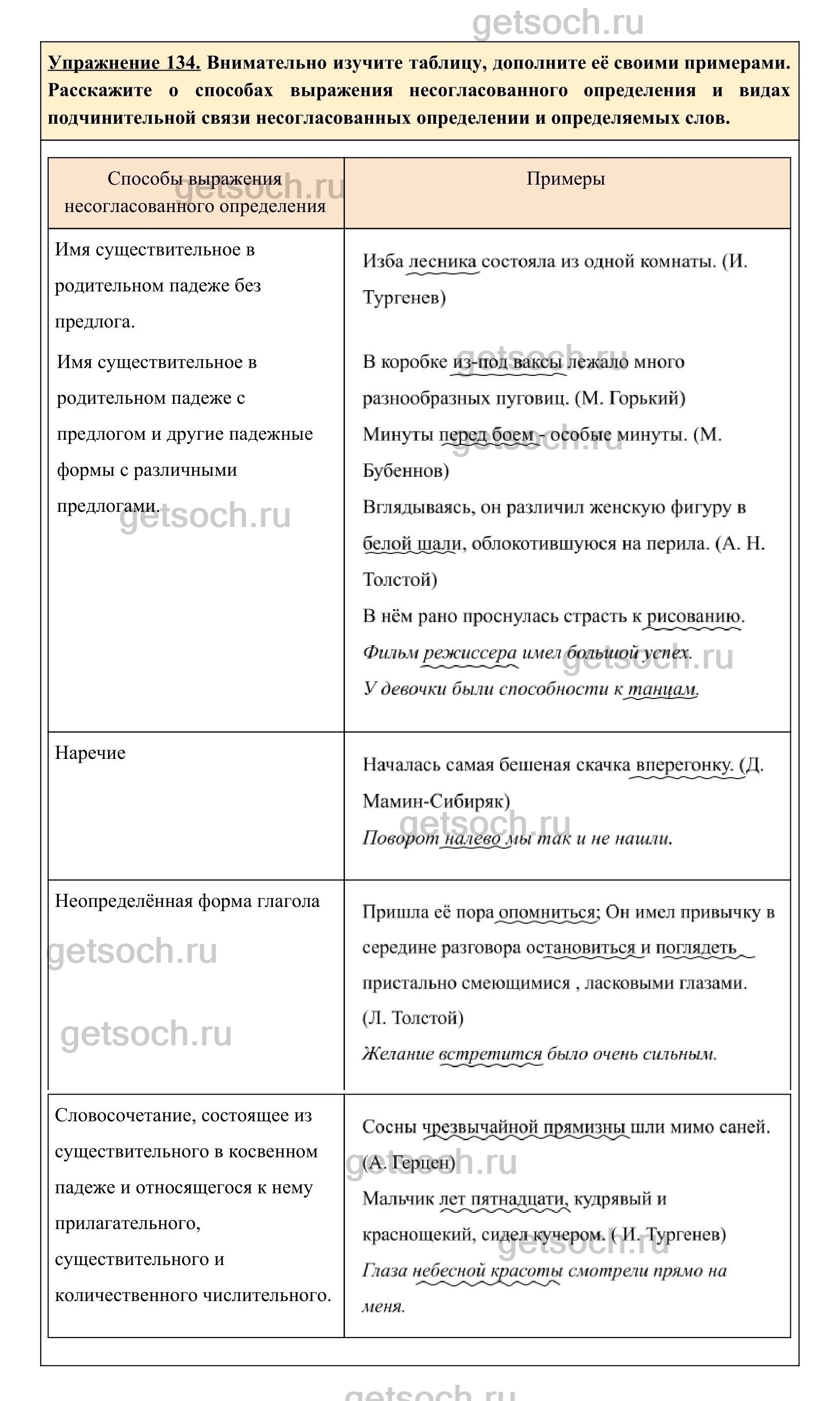 Упражнение 134. Внимательно изучите таблицу, дополните её своими примерами. Расскажите о способах выражения несогласованного определения и видах подчинительной связи несогласованных определении и определяемых слов.