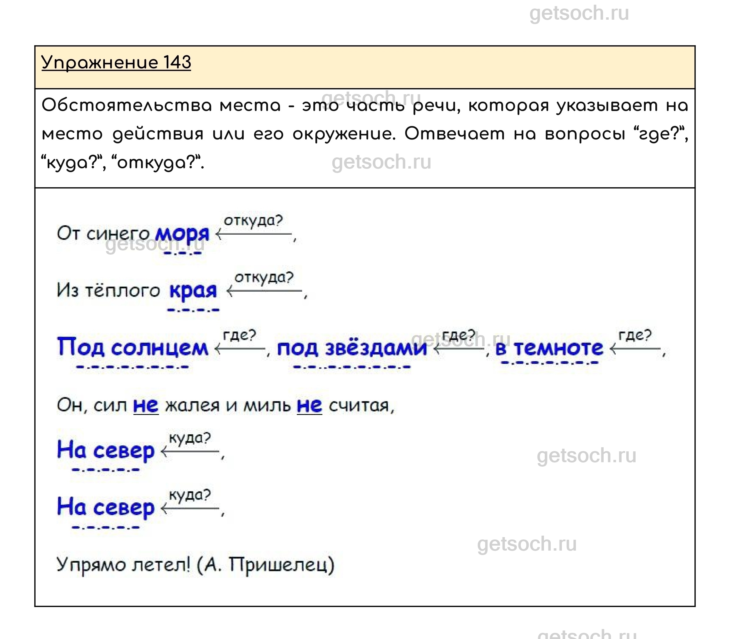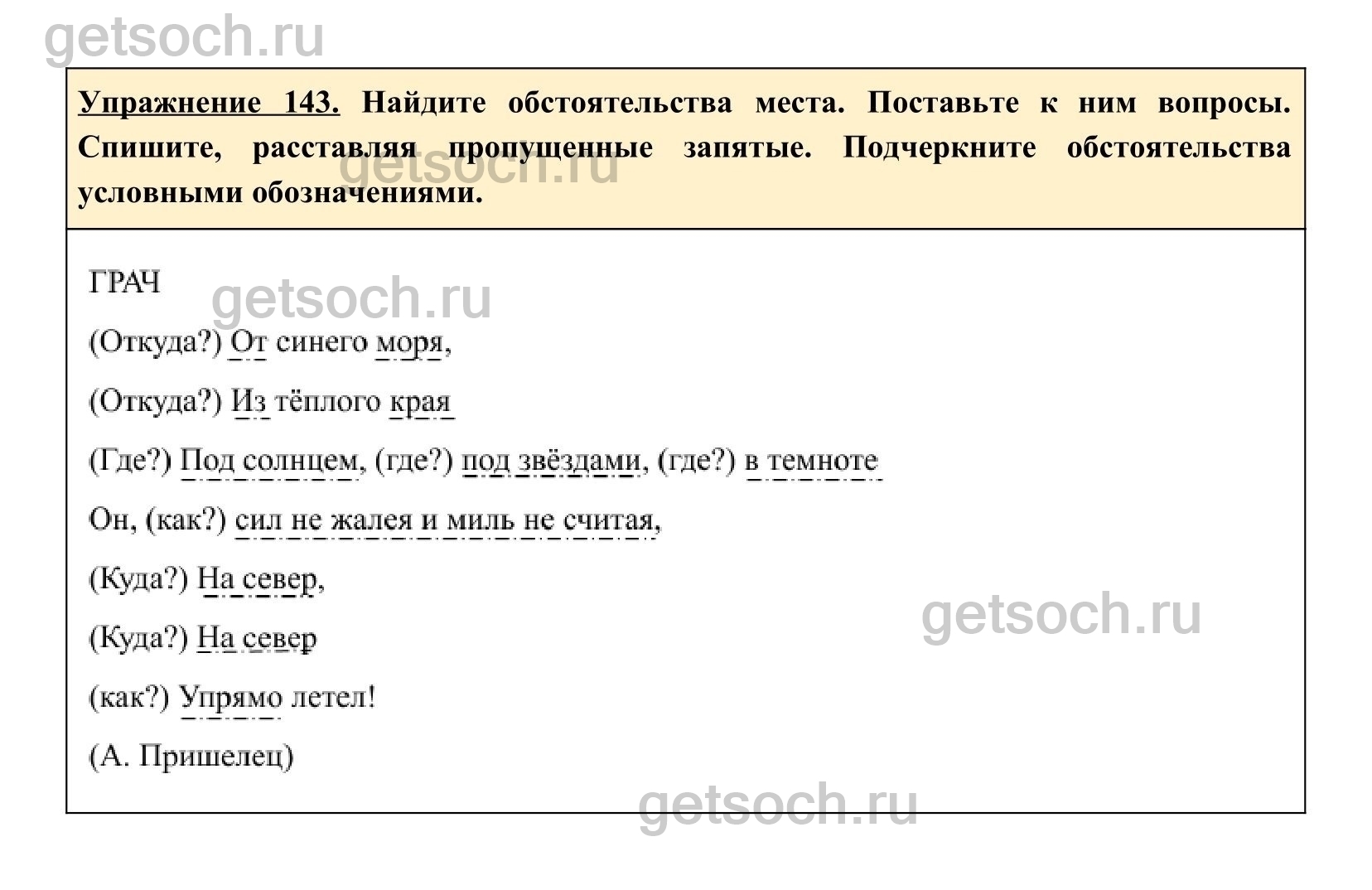 Упражнение 143. Найдите обстоятельства места. Поставьте к ним вопросы. Спишите, расставляя пропущенные запятые. Подчеркните обстоятельства условными обозначениями.