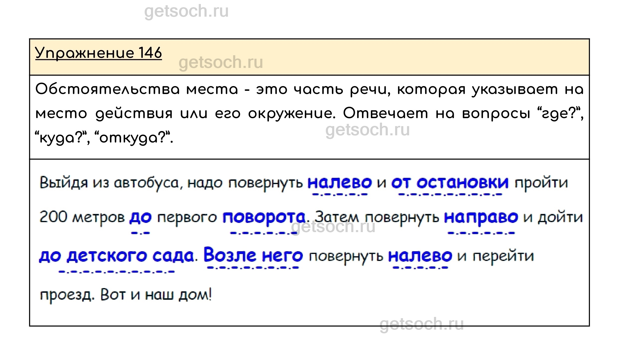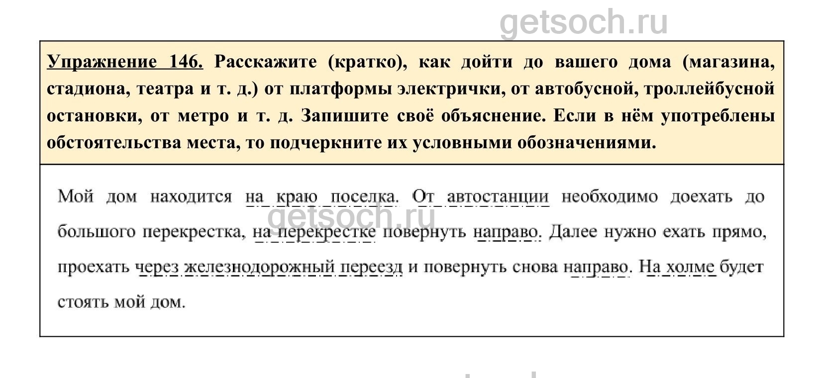 Упражнение 146. Расскажите (кратко), как дойти до вашего дома (магазина, стадиона, театра и т. д.) от платформы электрички, от автобусной, троллейбусной остановки, от метро и т. д. Запишите своё объяснение. Если в нём употреблены обстоятельства места, то подчеркните их условными обозначениями.