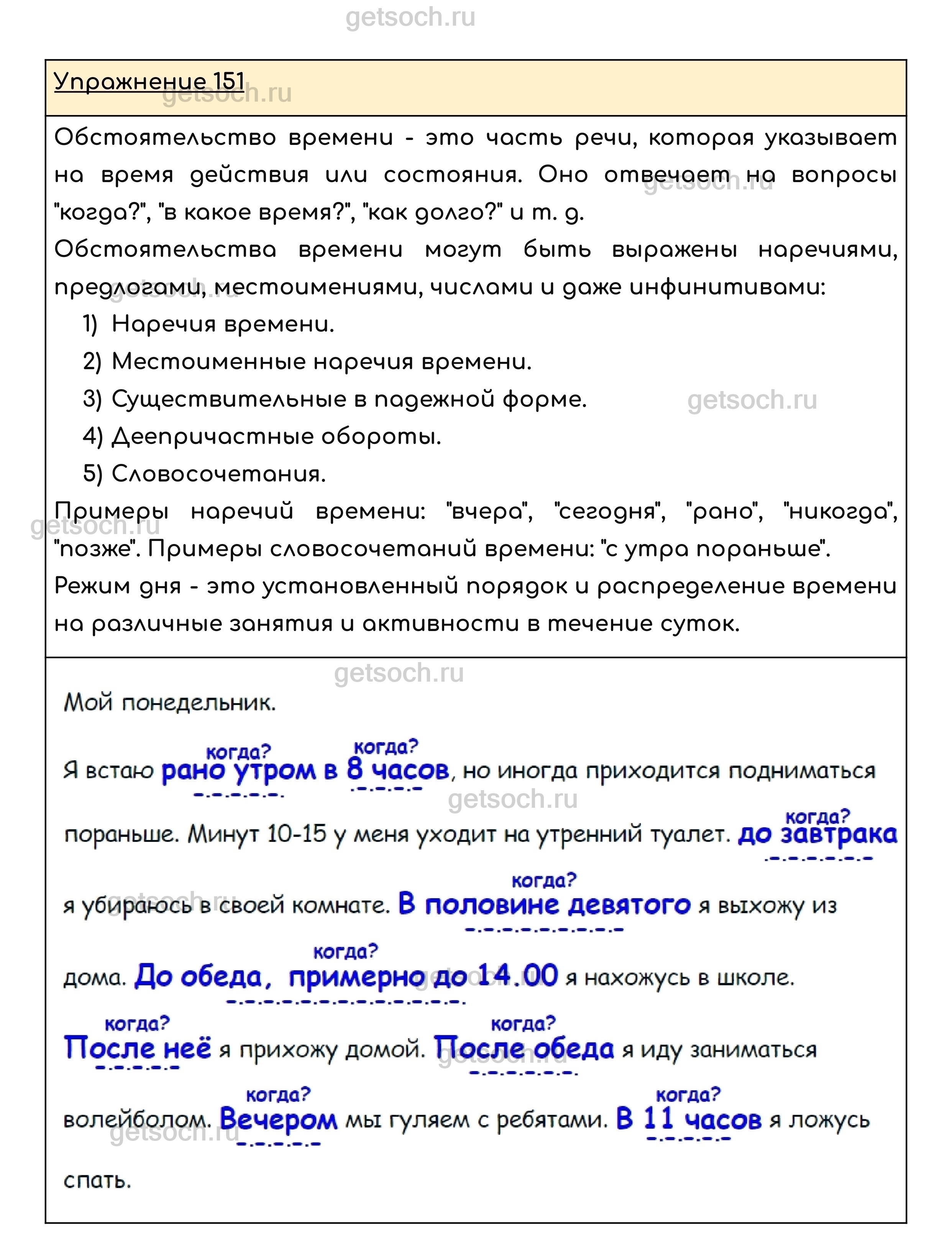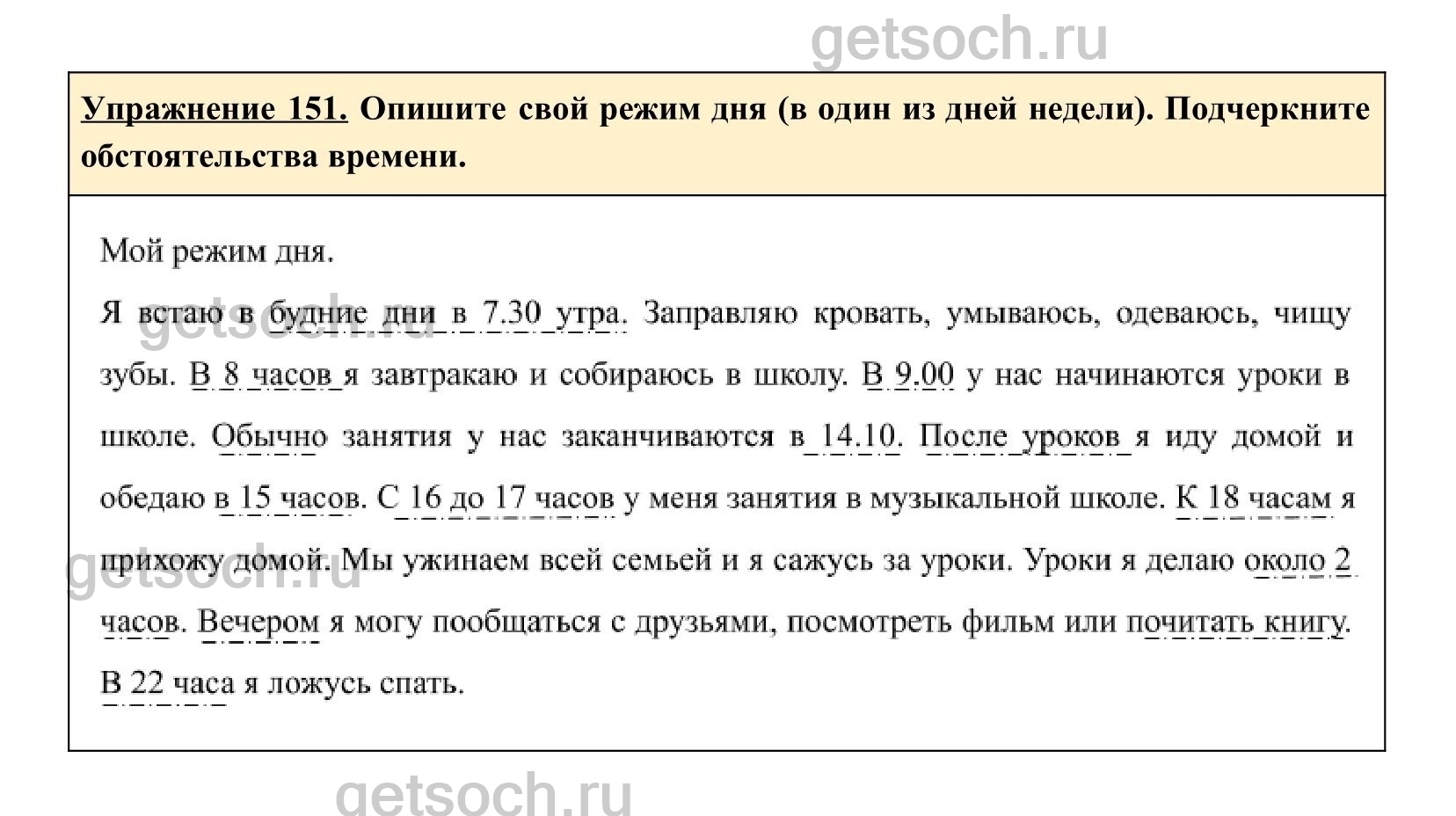 Упражнение 151. Опишите свой режим дня (в один из дней недели). Подчеркните обстоятельства времени.