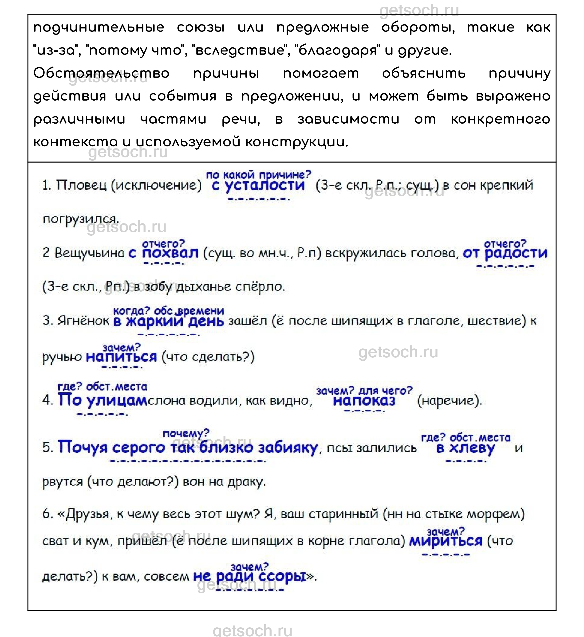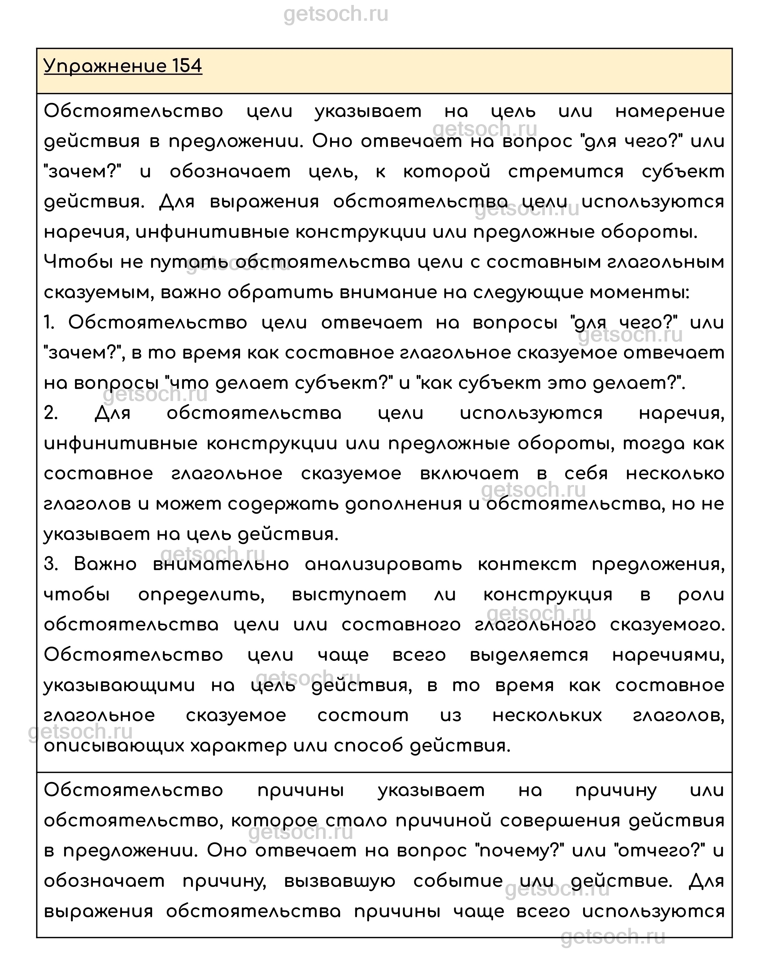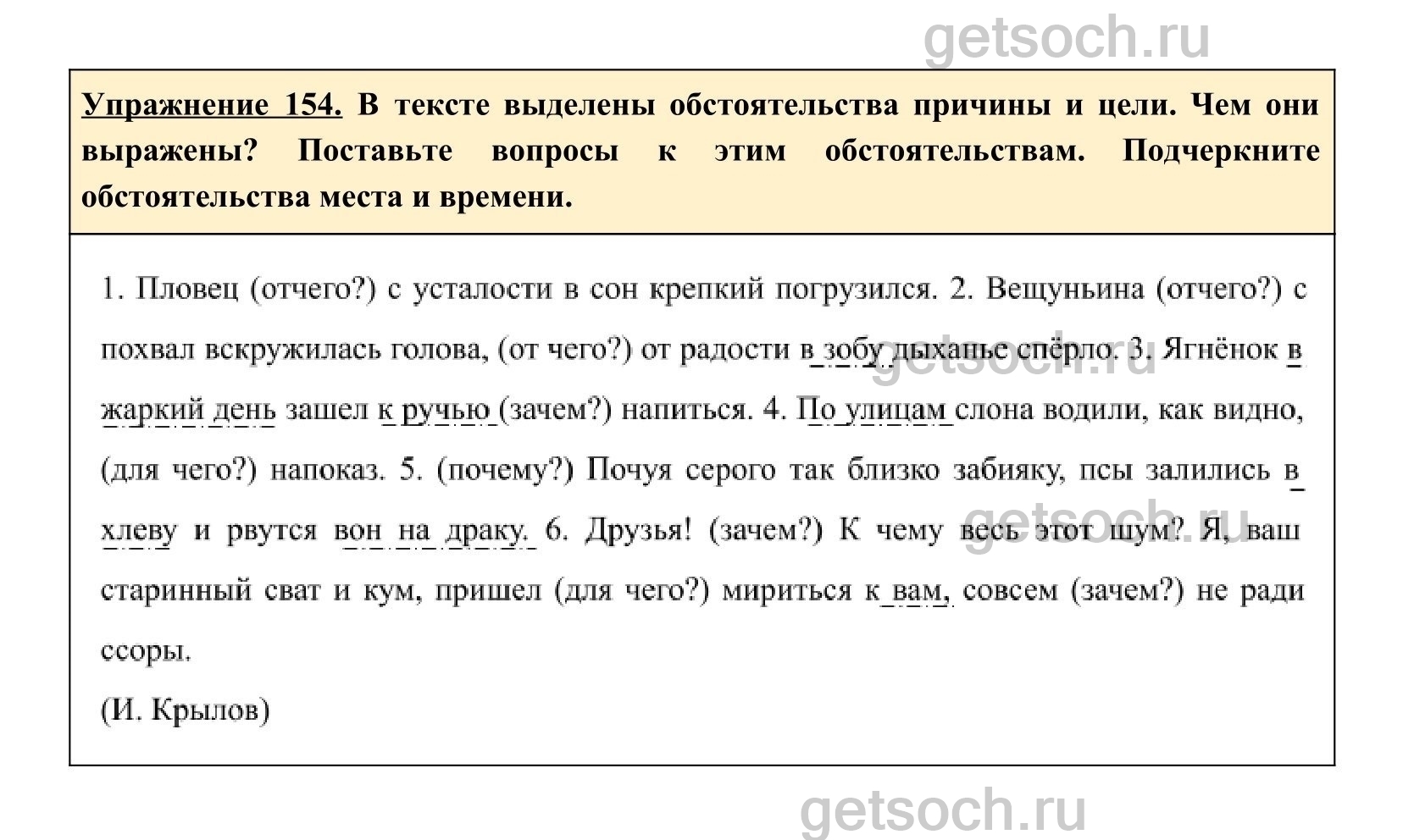 Упражнение 154. В тексте выделены обстоятельства причины и цели. Чем они выражены? Поставьте вопросы к этим обстоятельствам. Подчеркните обстоятельства места и времени.