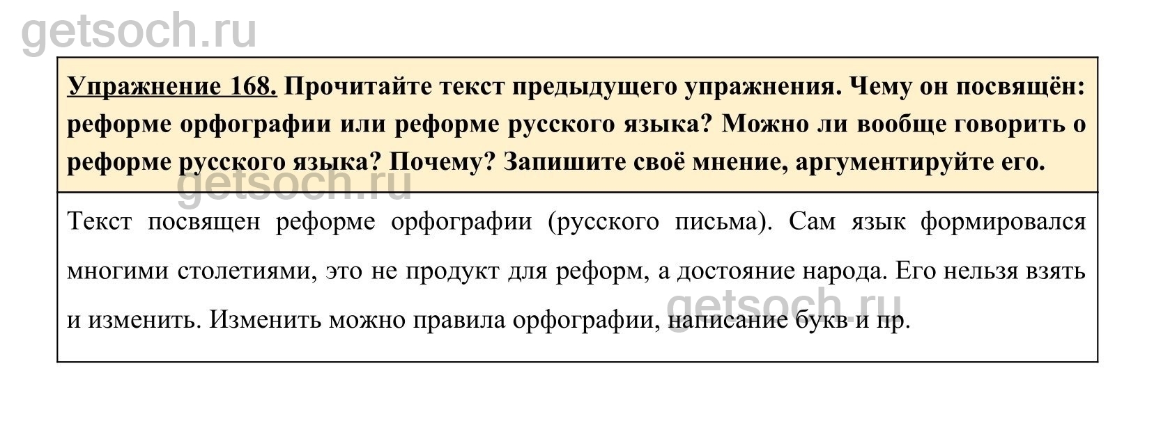Упражнение 168. Прочитайте текст предыдущего упражнения. Чему он посвящён: реформе орфографии или реформе русского языка? Можно ли вообще говорить о реформе русского языка? Почему? Запишите своё мнение, аргументируйте его.