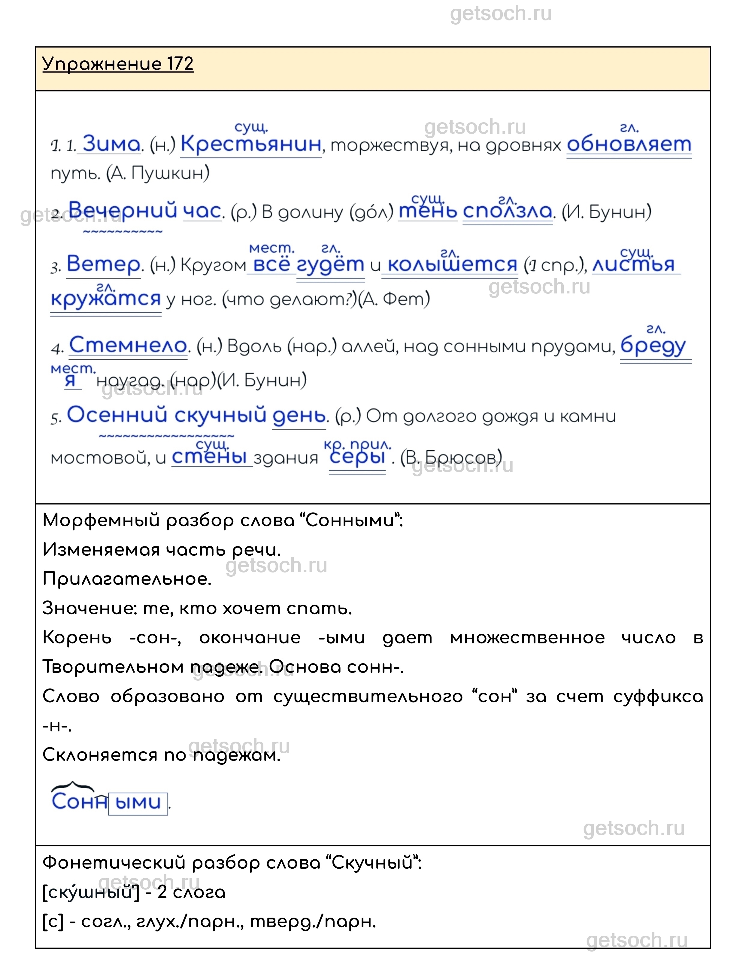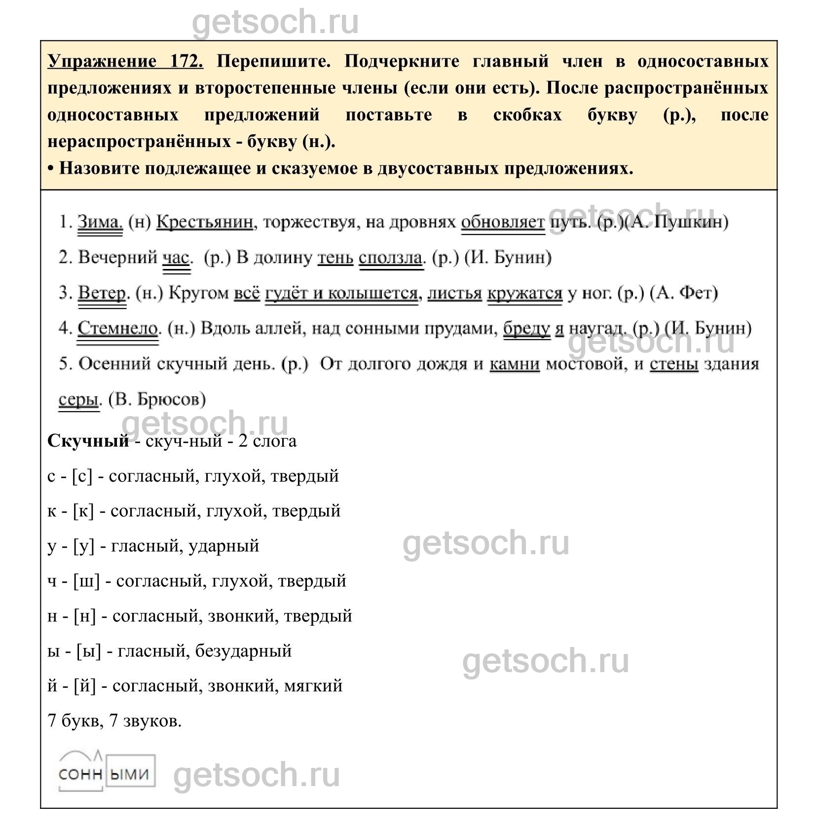 Упражнение 172. Перепишите. Подчеркните главный член в односоставных предложениях и второстепенные члены (если они есть). После распространённых односоставных предложений поставьте в скобках букву (р.), после нераспространённых – букву (н.).