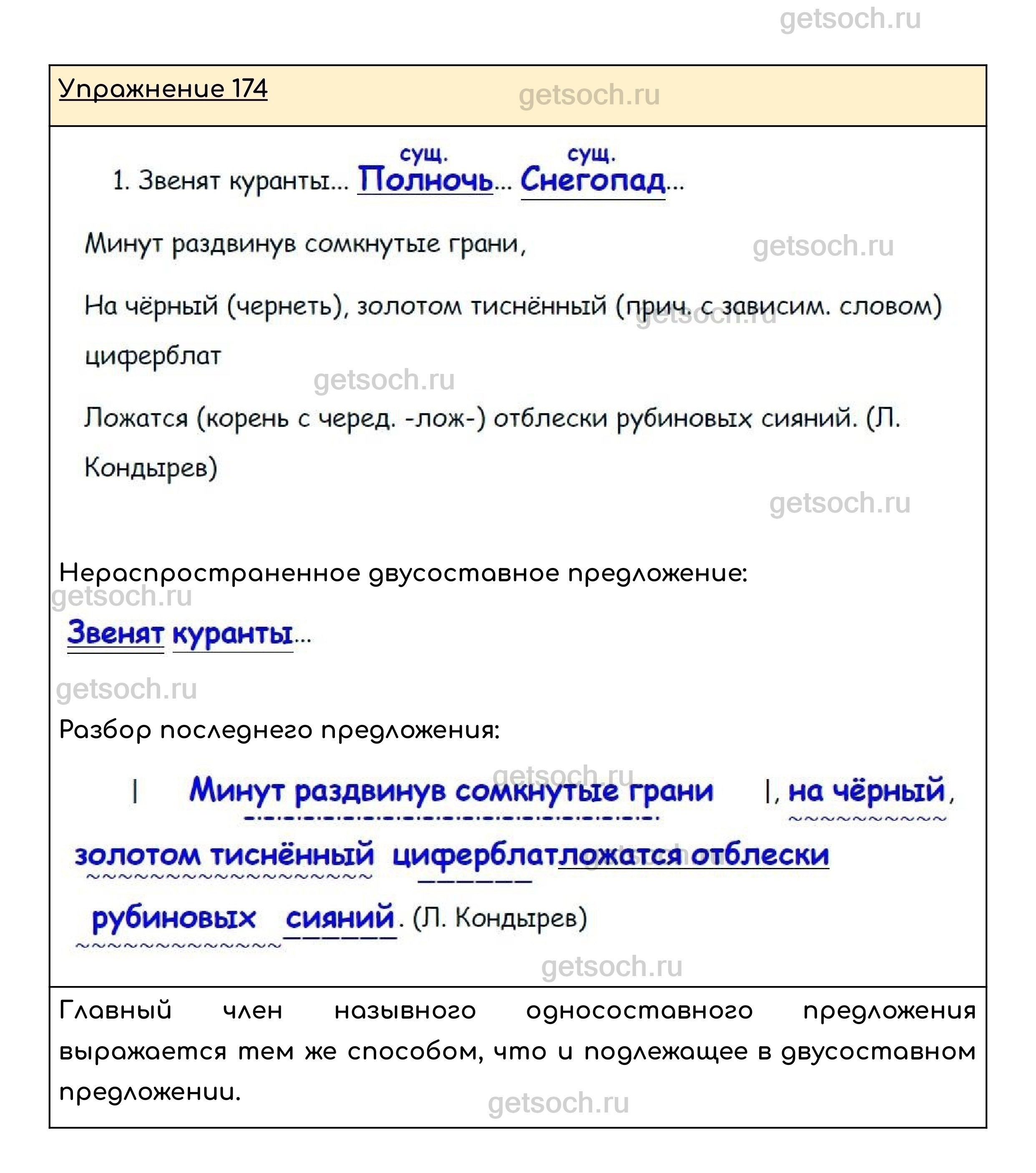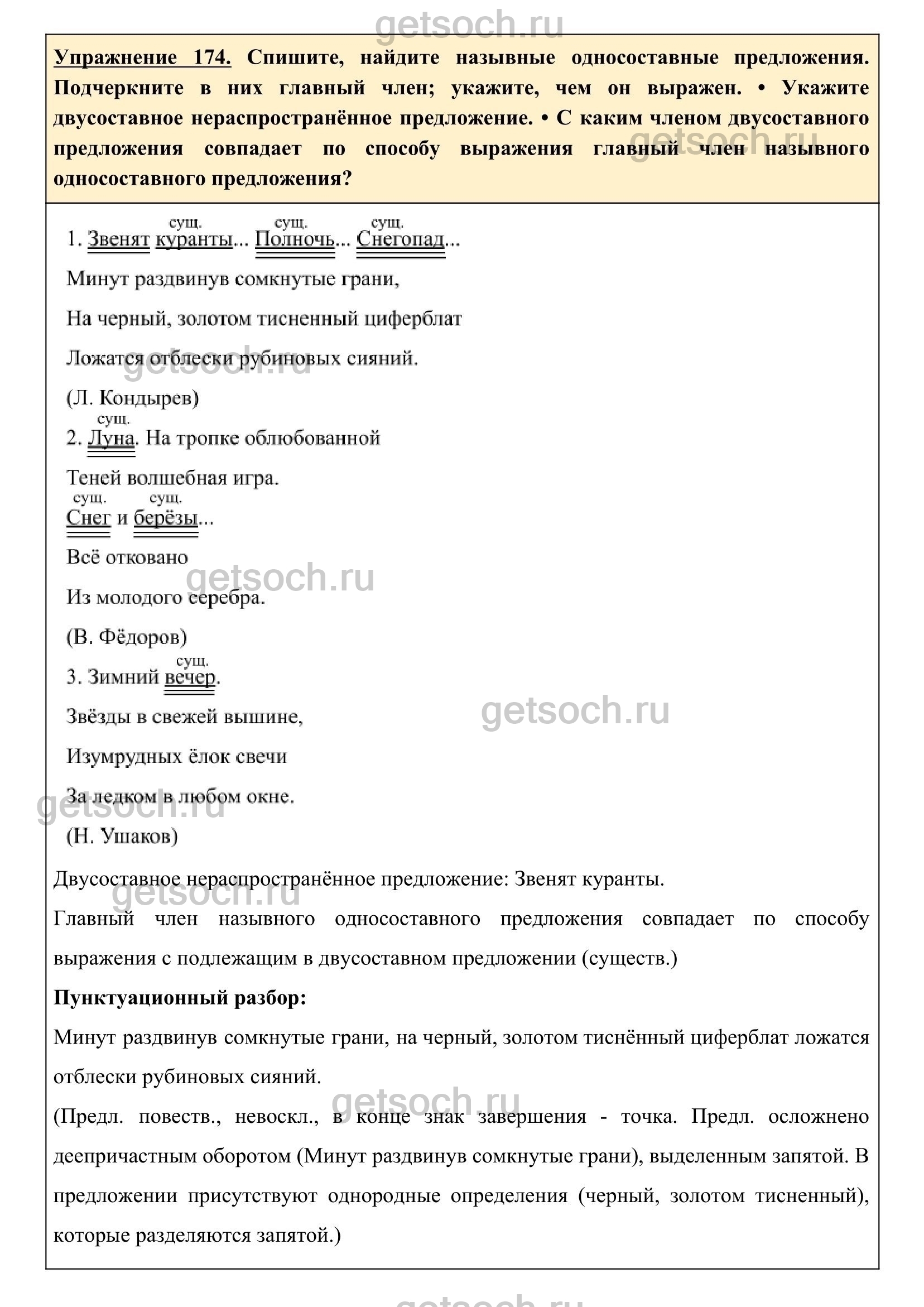 Упражнение 174. Спишите, найдите назывные односоставные предложения. Подчеркните в них главный член; укажите, чем он выражен. • Укажите двусоставное нераспространённое предложение. • С каким членом двусоставного предложения совпадает по способу выражения главный член назывного односоставного предложения?
