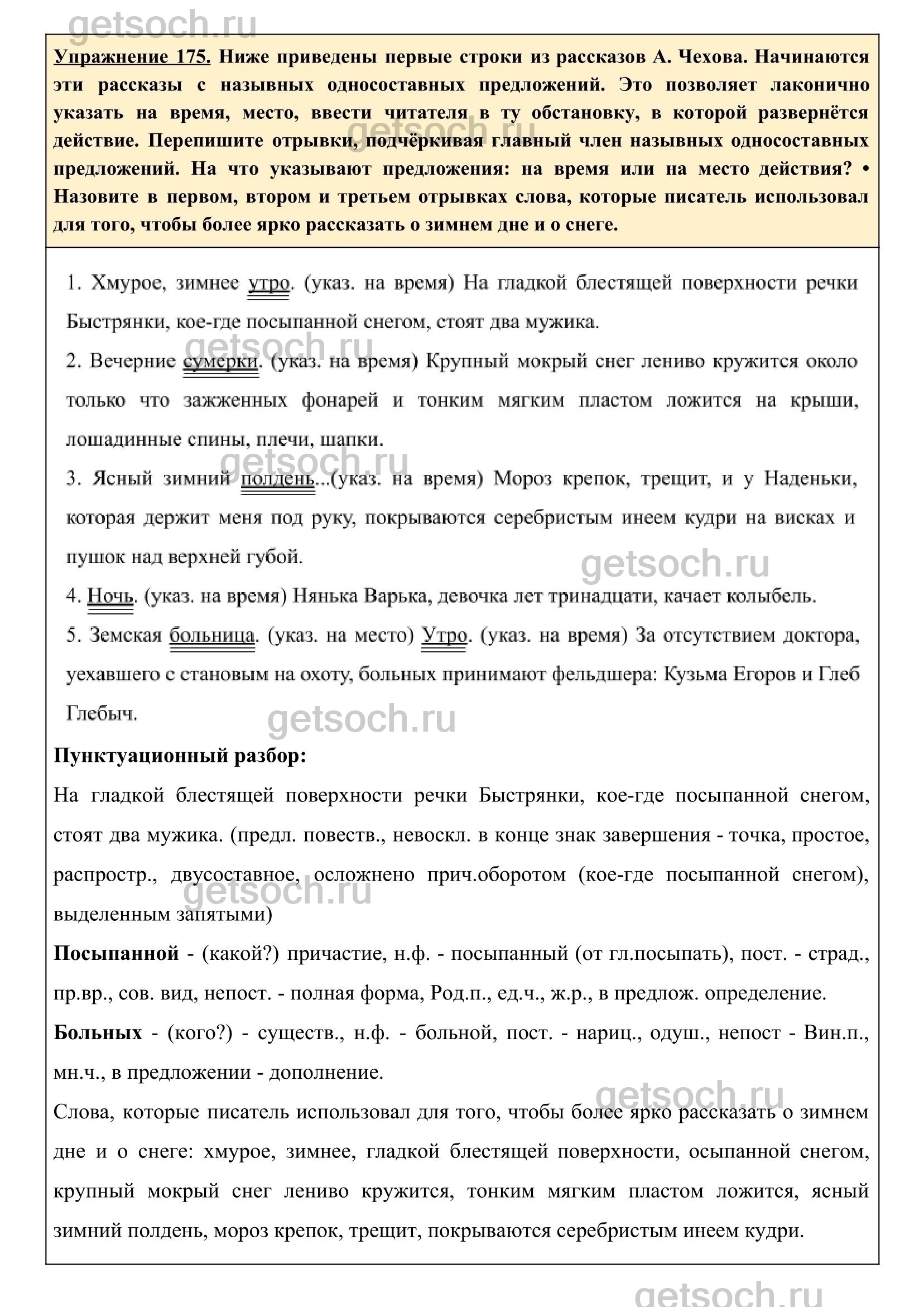 Упражнение 175. Ниже приведены первые строки из рассказов А. Чехова. Начинаются эти рассказы с назывных односоставных предложений. Это позволяет лаконично указать на время, место, ввести читателя в ту обстановку, в которой развернётся действие. Перепишите отрывки, подчёркивая главный член назывных односоставных предложений. На что указывают предложения: на время или на место действия? • Назовите в первом, втором и третьем отрывках слова, которые писатель использовал для того, чтобы более ярко рассказать о зимнем дне и о снеге.