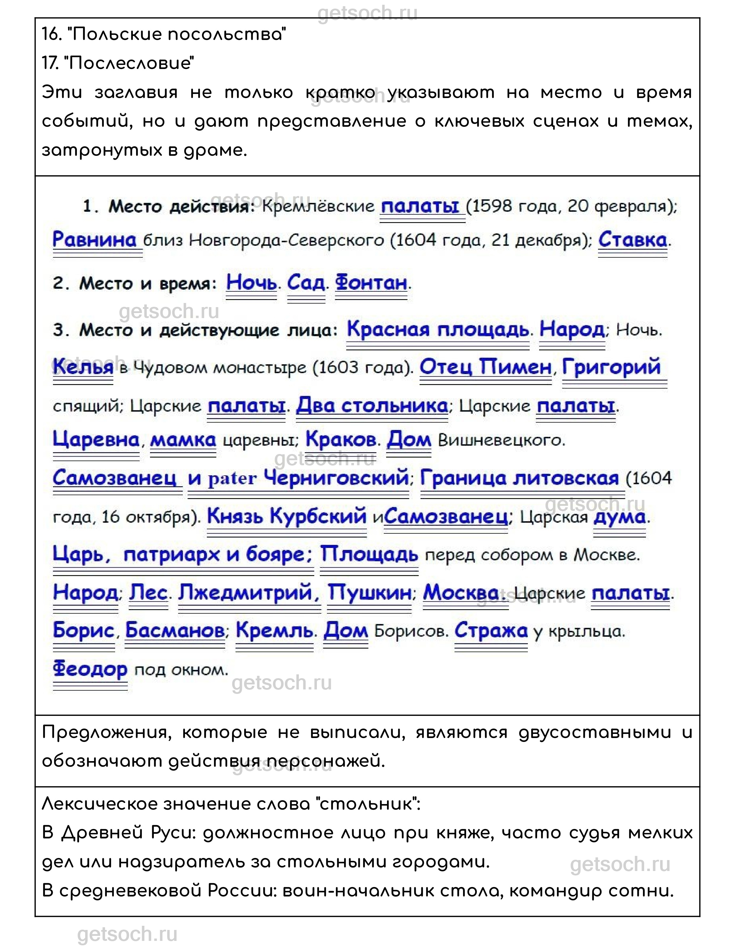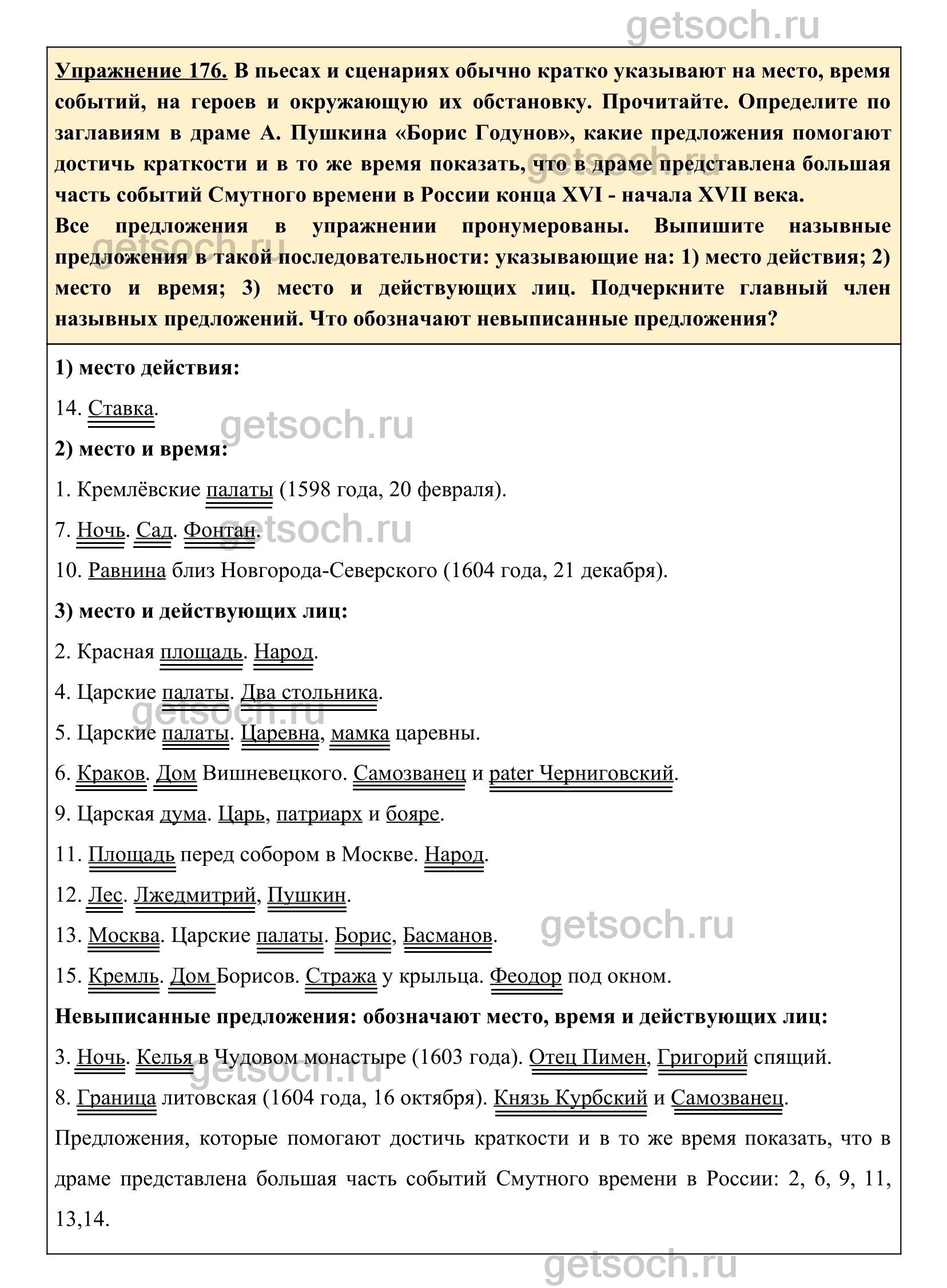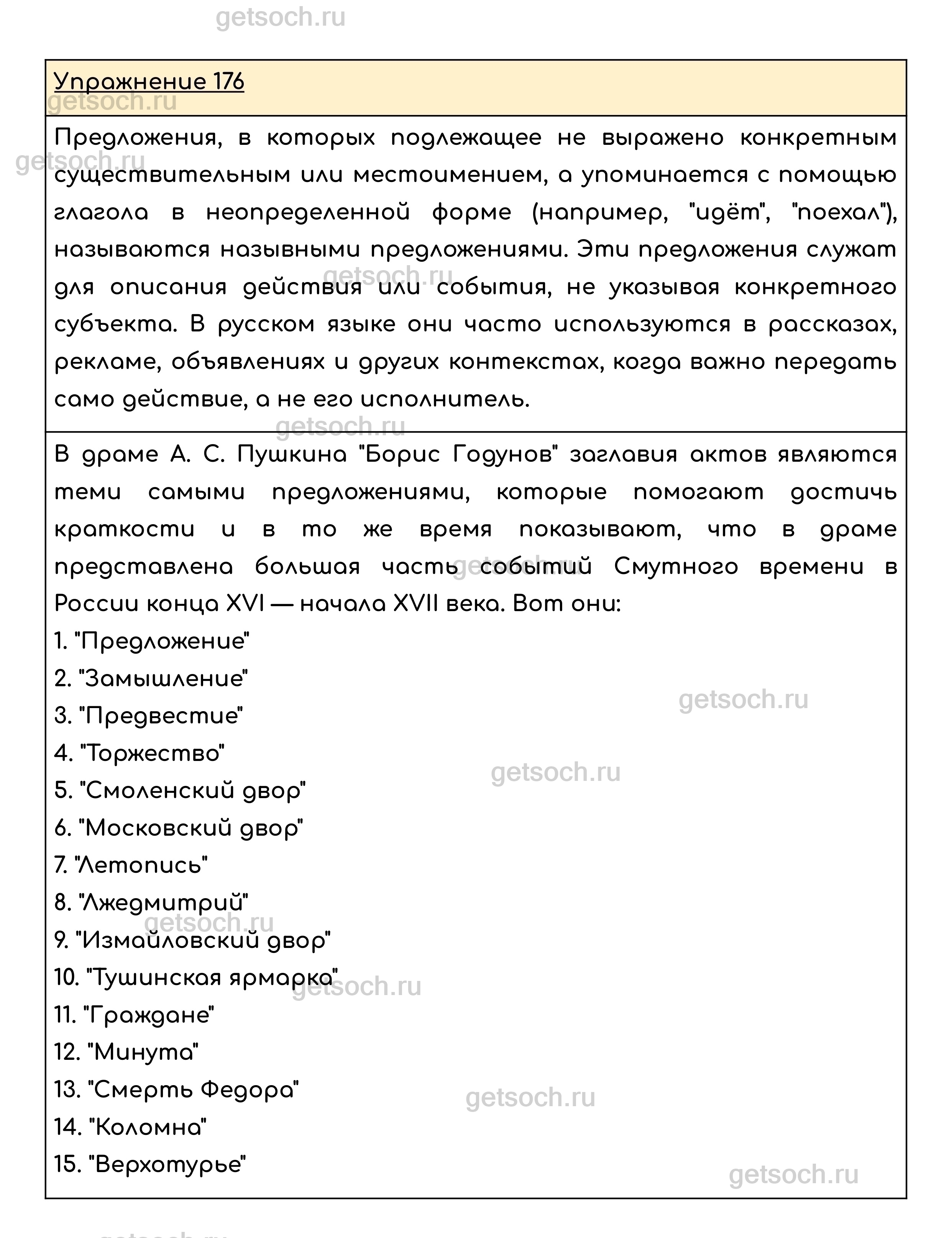 Упражнение 176. В пьесах и сценариях обычно кратко указывают на место, время событий, на героев и окружающую их обстановку. Прочитайте. Определите по заглавиям в драме А. Пушкина «Борис Годунов», какие предложения помогают достичь краткости и в то же время показать, что в драме представлена большая часть событий Смутного времени в России конца XVI – начала XVII века.