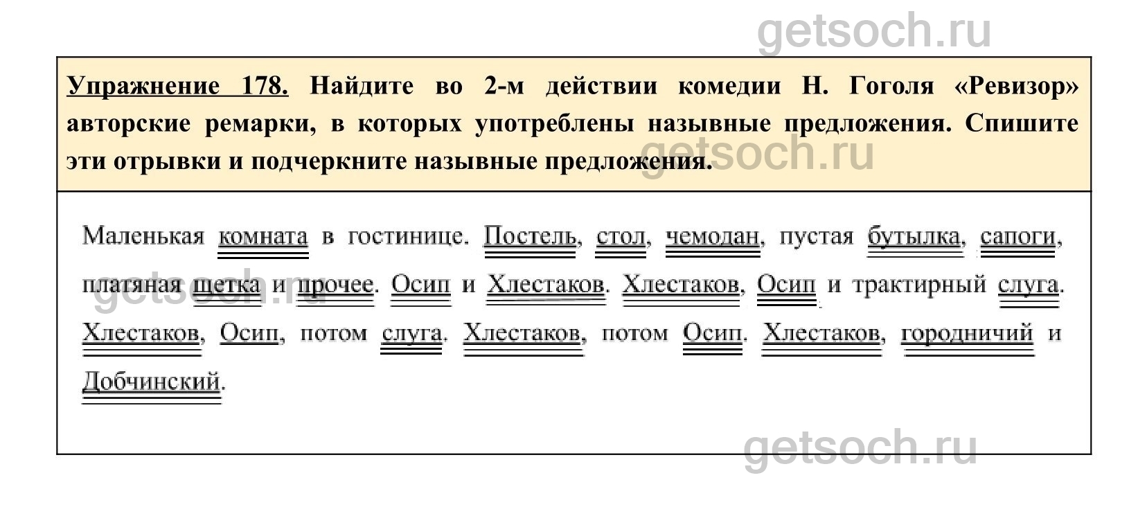 Упражнение 178. Найдите во 2-м действии комедии Н. Гоголя «Ревизор» авторские ремарки, в которых употреблены назывные предложения. Спишите эти отрывки и подчеркните назывные предложения.