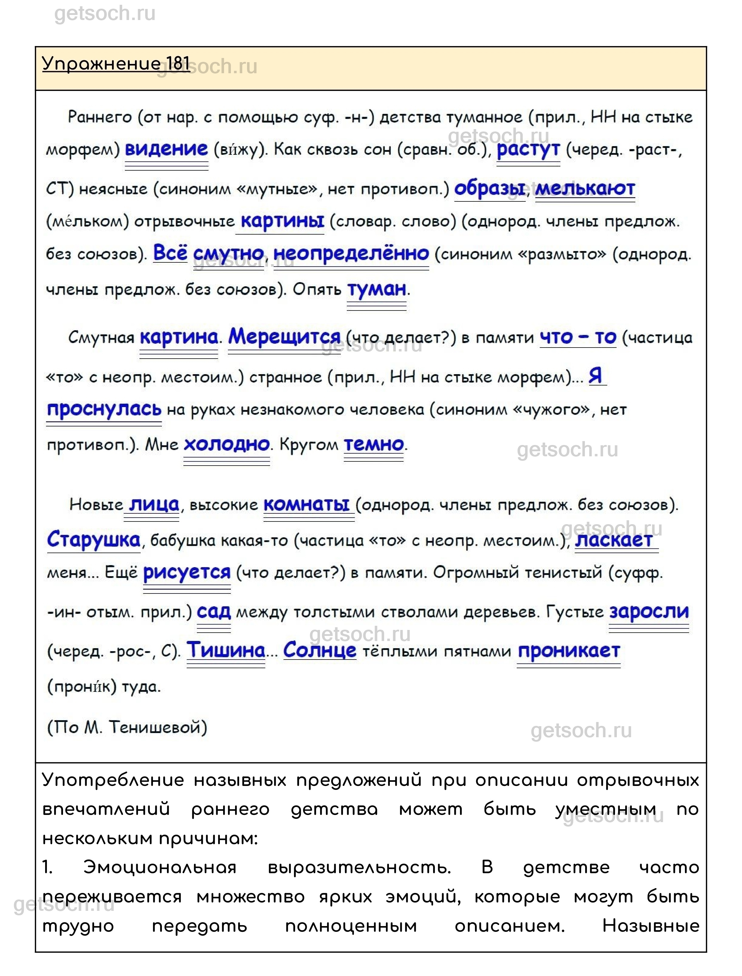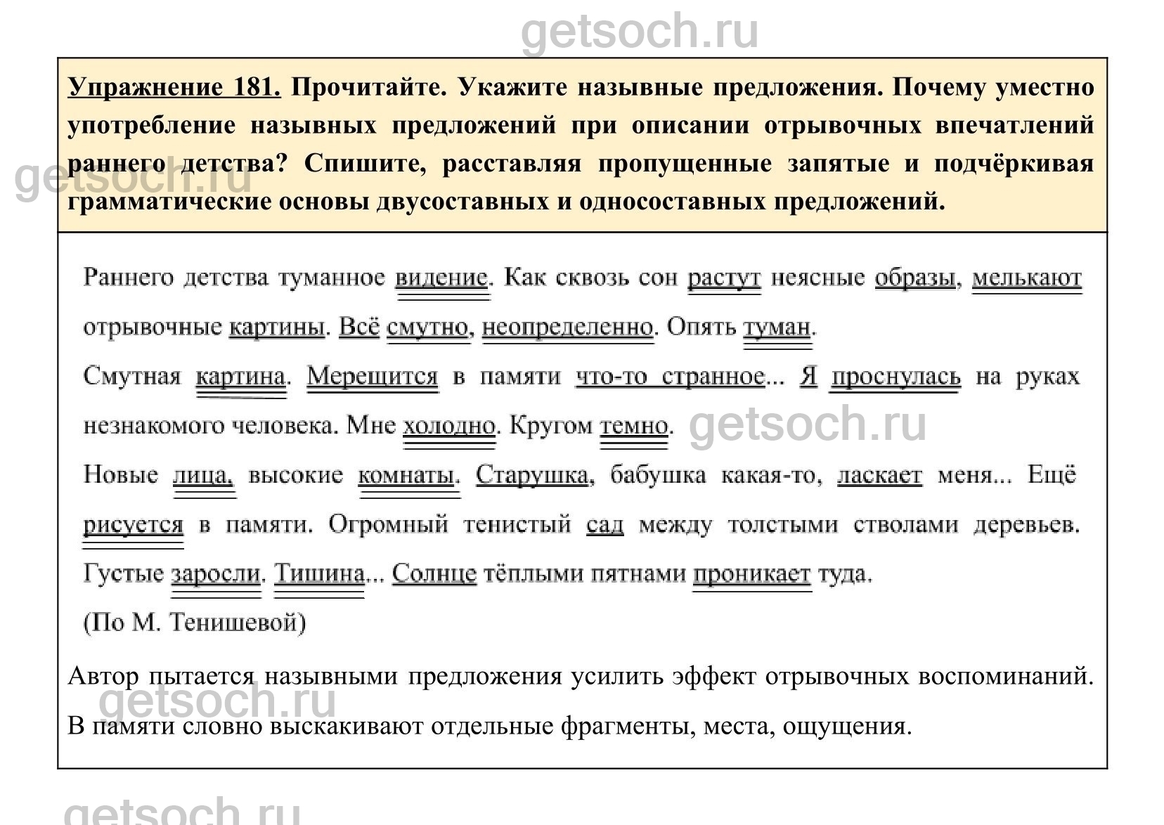 Упражнение 181. Прочитайте. Укажите назывные предложения. Почему уместно употребление назывных предложений при описании отрывочных впечатлений раннего детства? Спишите, расставляя пропущенные запятые и подчёркивая грамматические основы двусоставных и односоставных предложений.