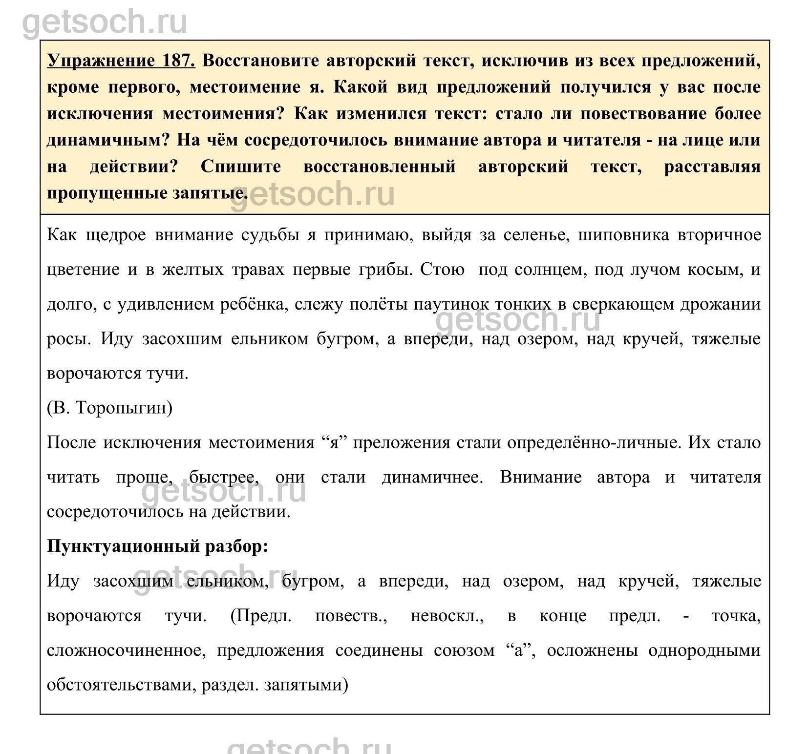 Упражнение 187. Восстановите авторский текст, исключив из всех предложений, кроме первого, местоимение я. Какой вид предложений получился у вас после исключения местоимения? Как изменился текст: стало ли повествование более динамичным? На чём сосредоточилось внимание автора и читателя – на лице или на действии? Спишите восстановленный авторский текст, расставляя пропущенные запятые.