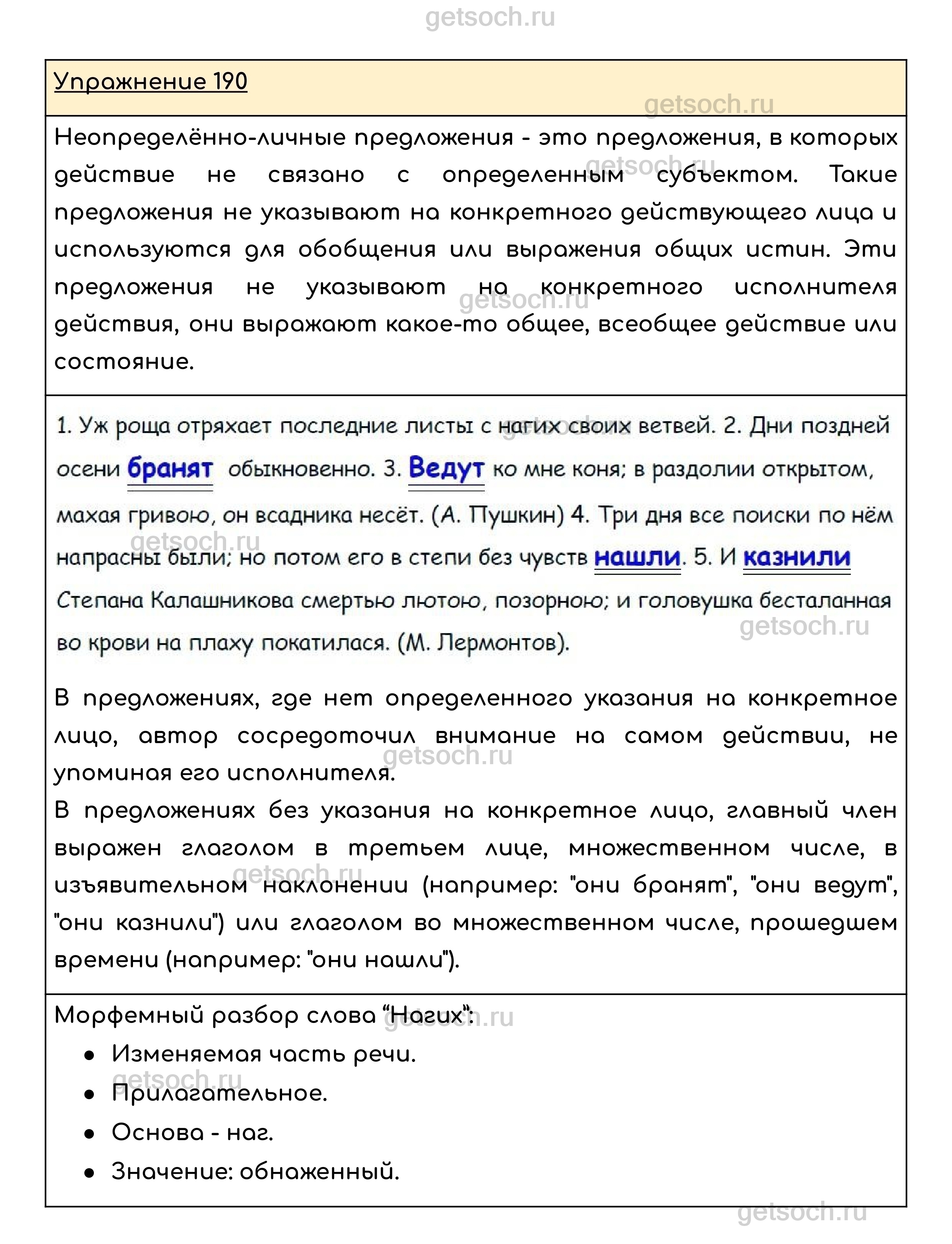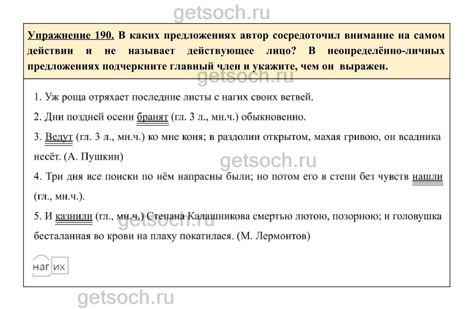 Упражнение 190. В каких предложениях автор сосредоточил внимание на самом действии и не называет действующее лицо? В неопределённо-личных предложениях подчеркните главный член и укажите, чем он выражен.