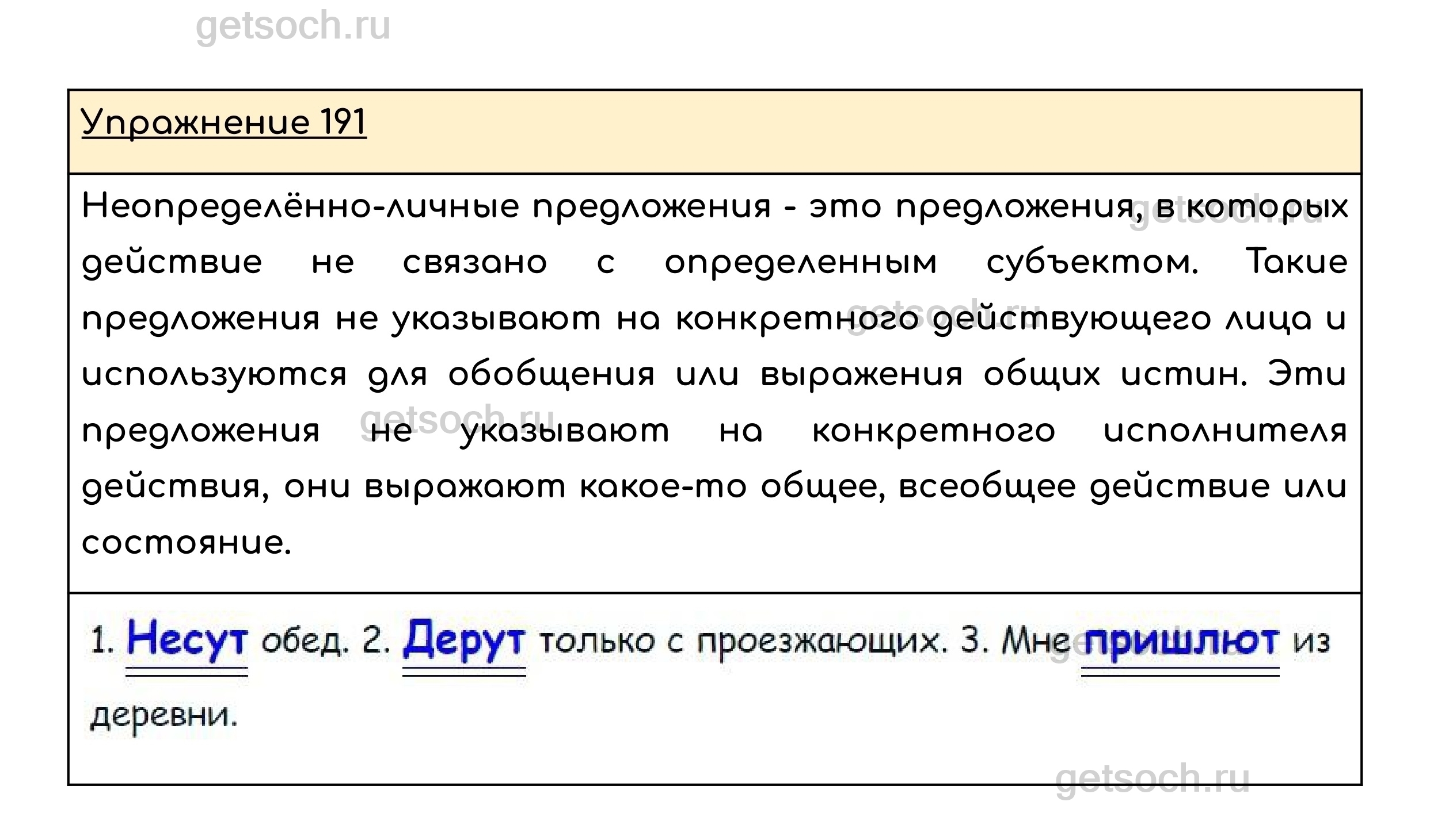Упражнение 191. Выпишите неопределённо-личные предложения из 2-го действия комедии Н. Гоголя «Ревизор» или из любого другого художественного произведения. Подчеркните главный член неопределённо-личных предложений.