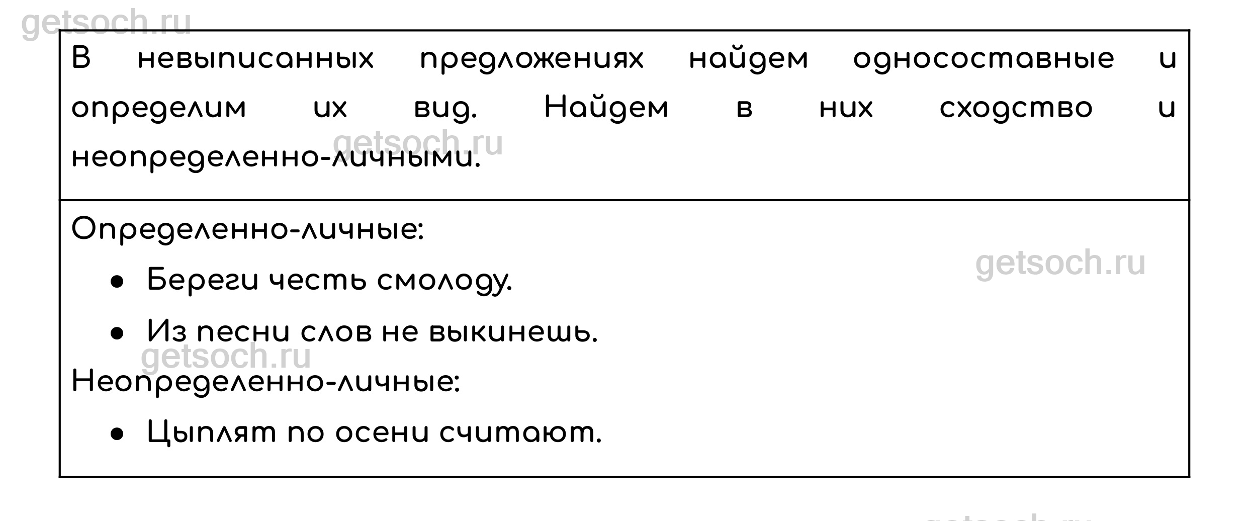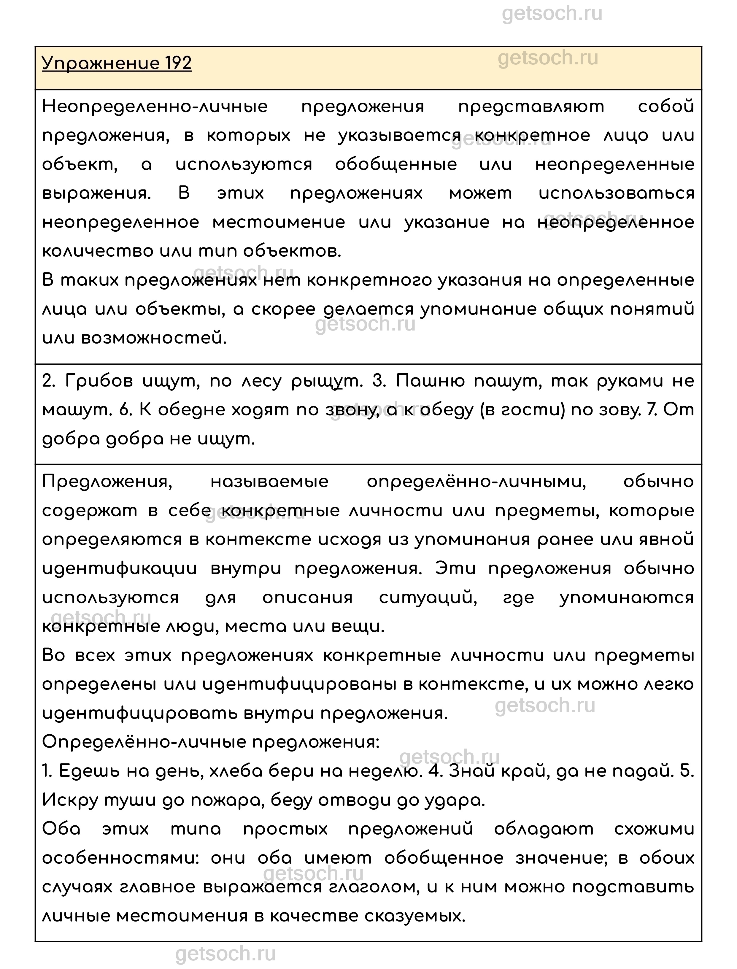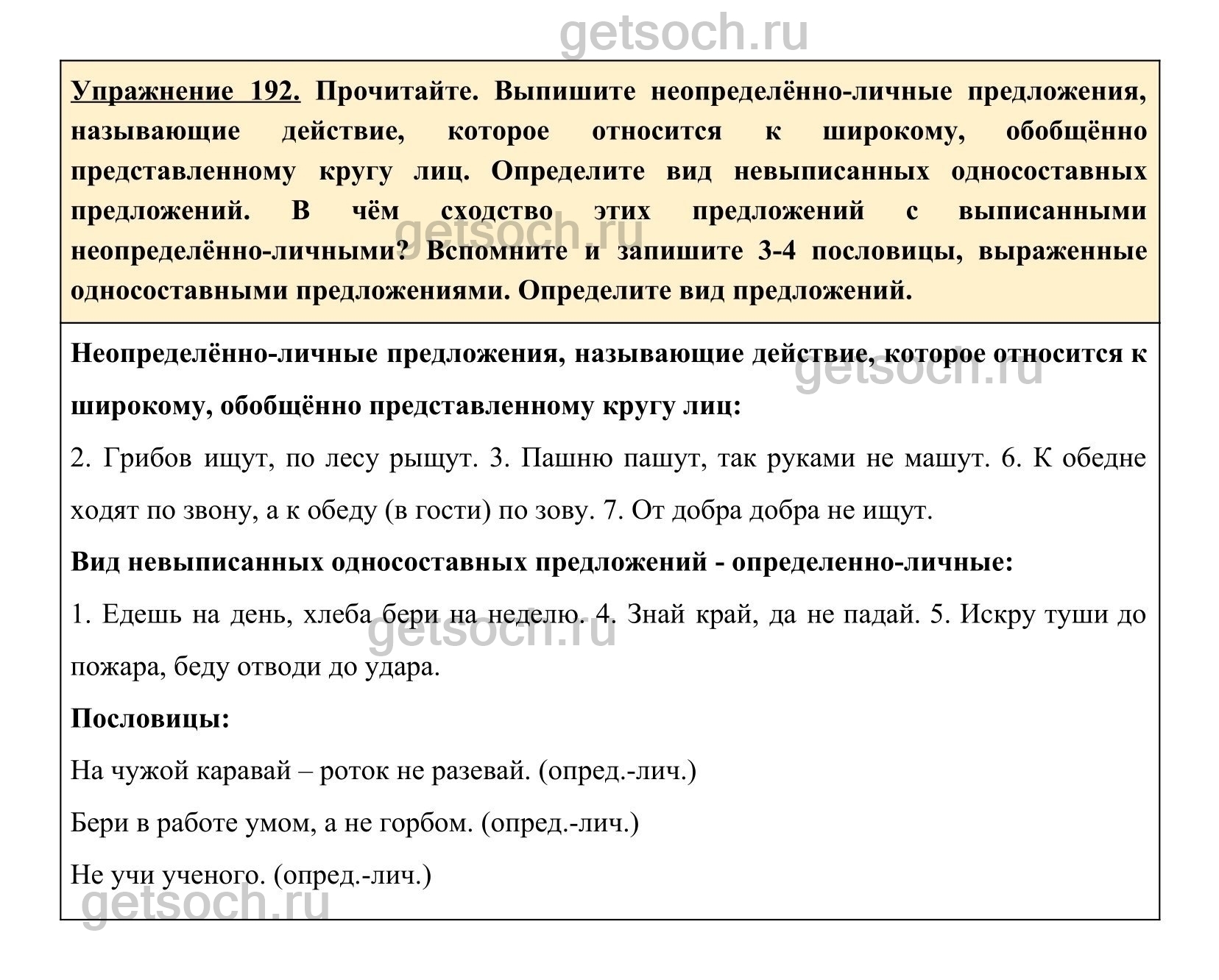 Упражнение 192. Прочитайте. Выпишите неопределённо-личные предложения, называющие действие, которое относится к широкому, обобщённо представленному кругу лиц. Определите вид невыписанных односоставных предложений. В чём сходство этих предложений с выписанными неопределённо-личными? Вспомните и запишите 3-4 пословицы, выраженные односоставными предложениями. Определите вид предложений.