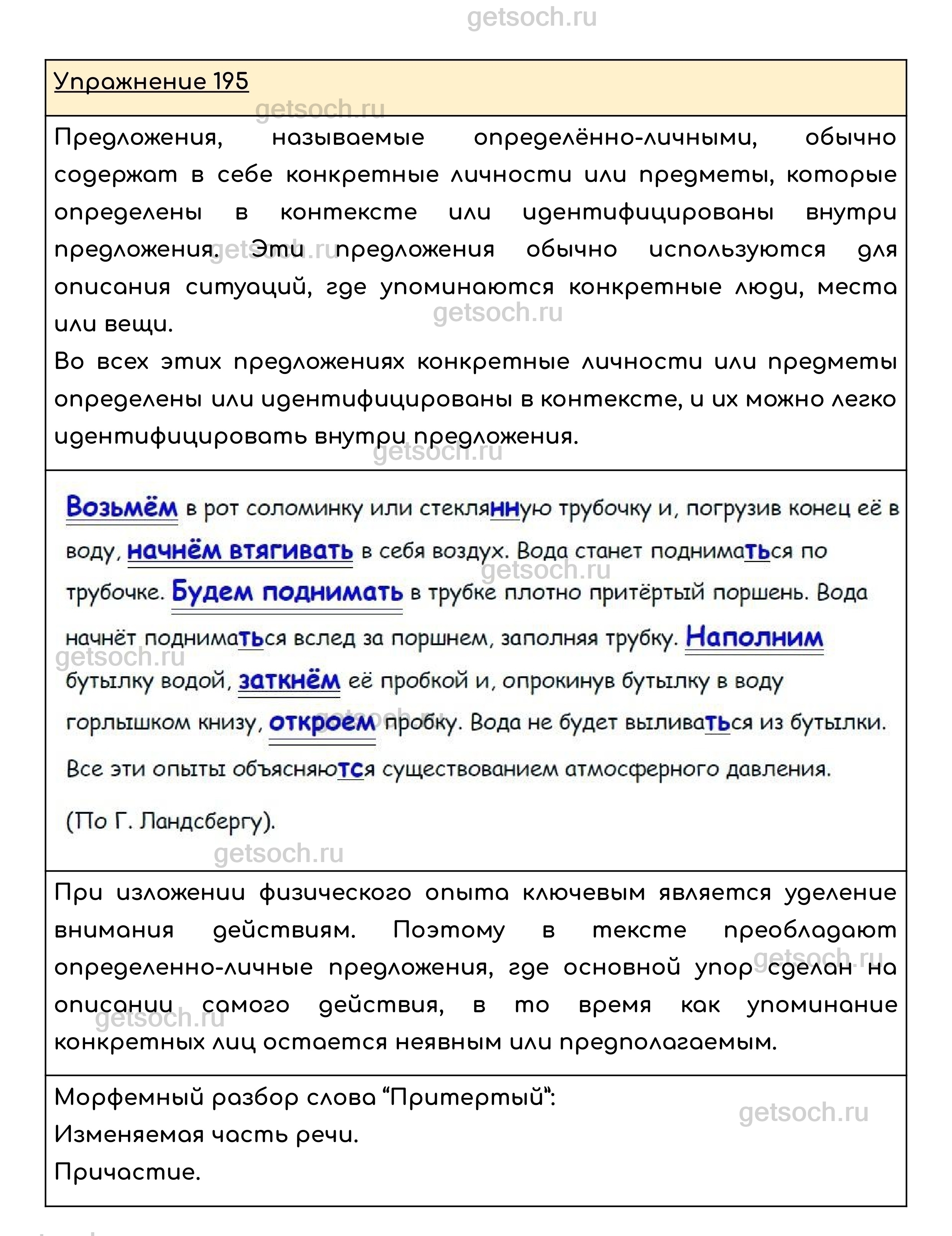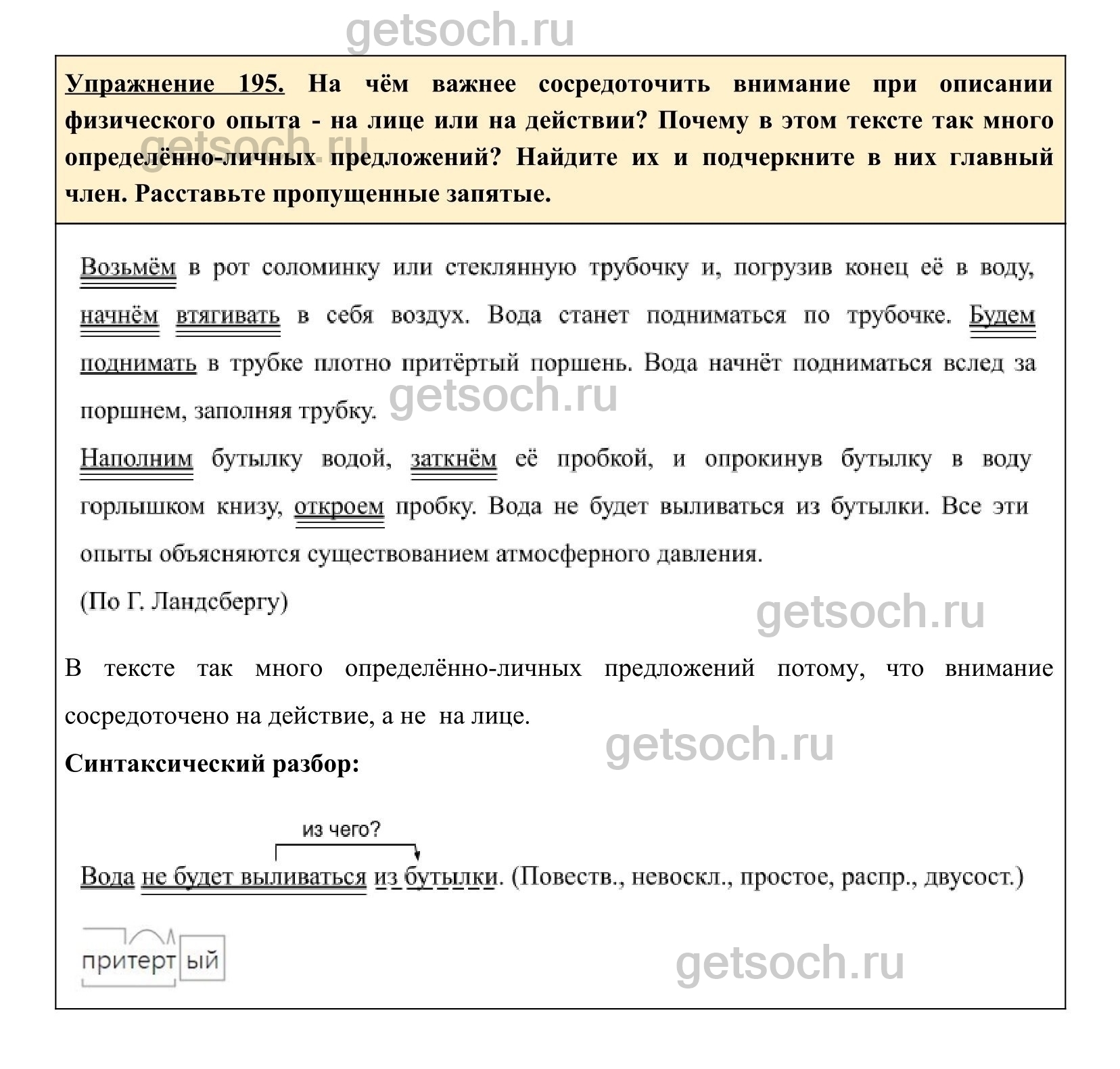Упражнение 195. На чём важнее сосредоточить внимание при описании физического опыта – на лице или на действии? Почему в этом тексте так много определённо-личных предложений? Найдите их и подчеркните в них главный член. Расставьте пропущенные запятые.