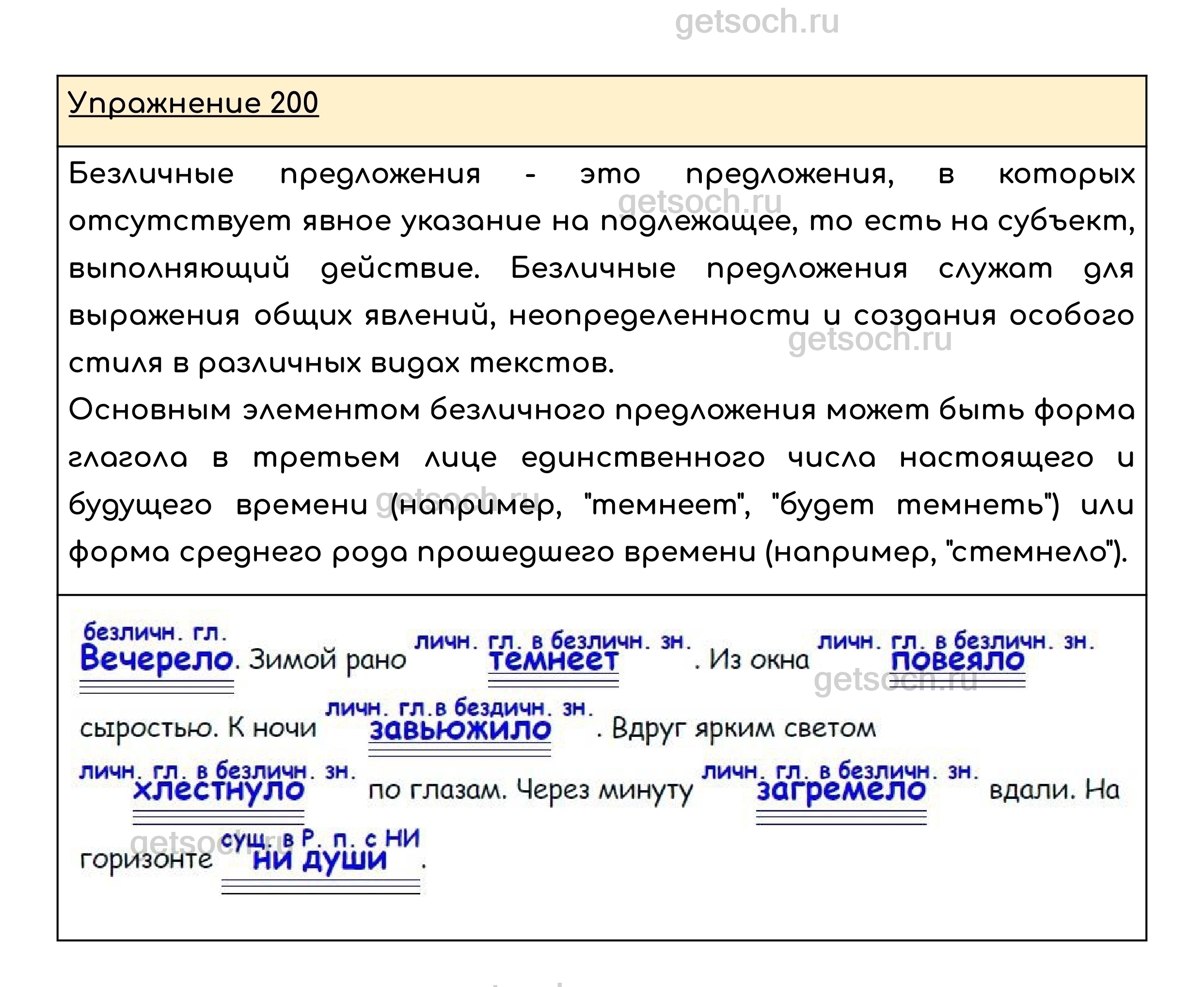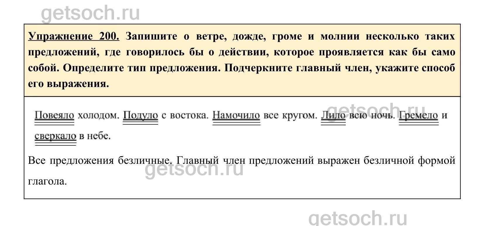 Упражнение 200. Запишите о ветре, дожде, громе и молнии несколько таких предложений, где говорилось бы о действии, которое проявляется как бы само собой. Определите тип предложения. Подчеркните главный член, укажите способ его выражения.