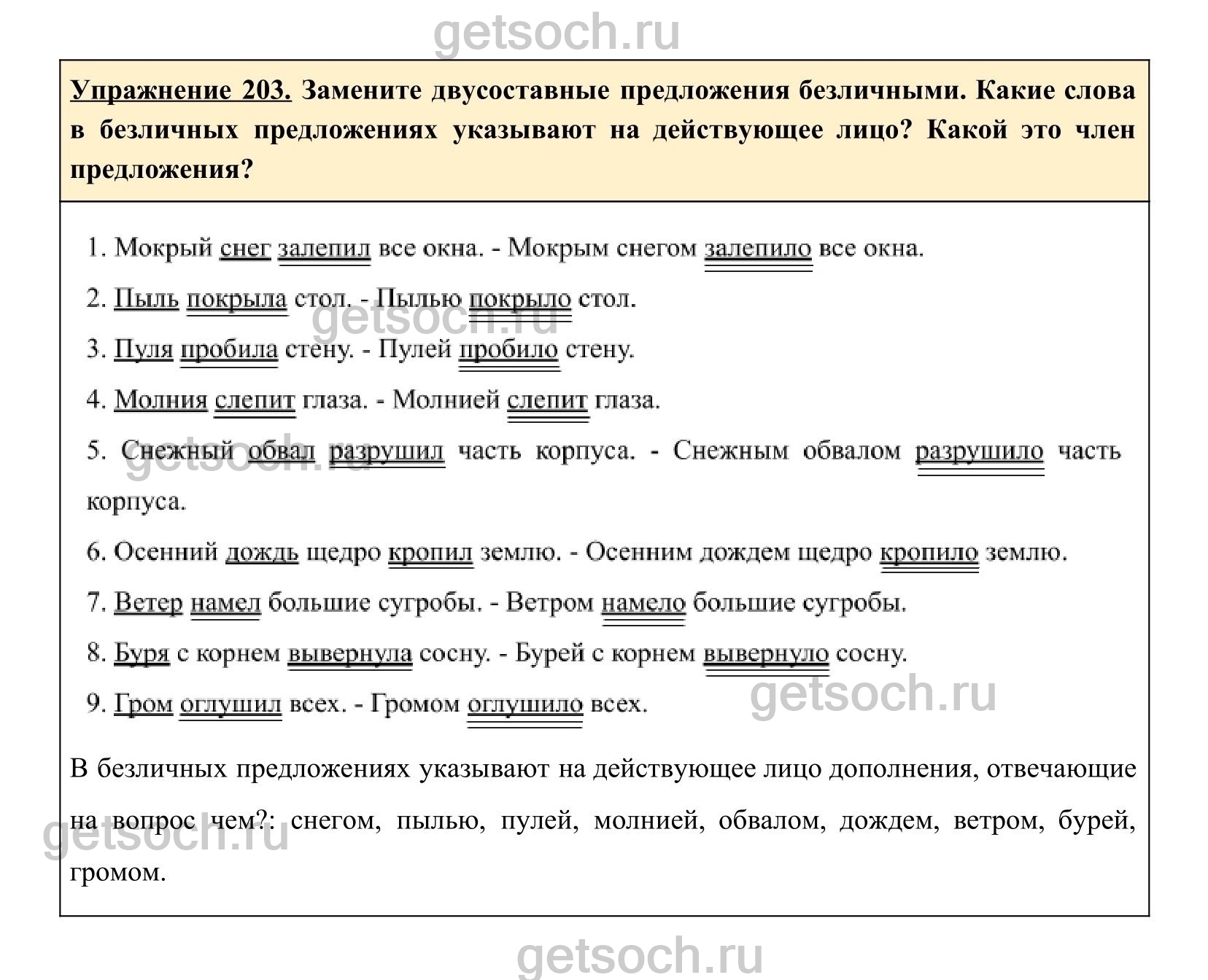 Упражнение 203. Замените двусоставные предложения безличными. Какие слова в безличных предложениях указывают на действующее лицо? Какой это член предложения?
