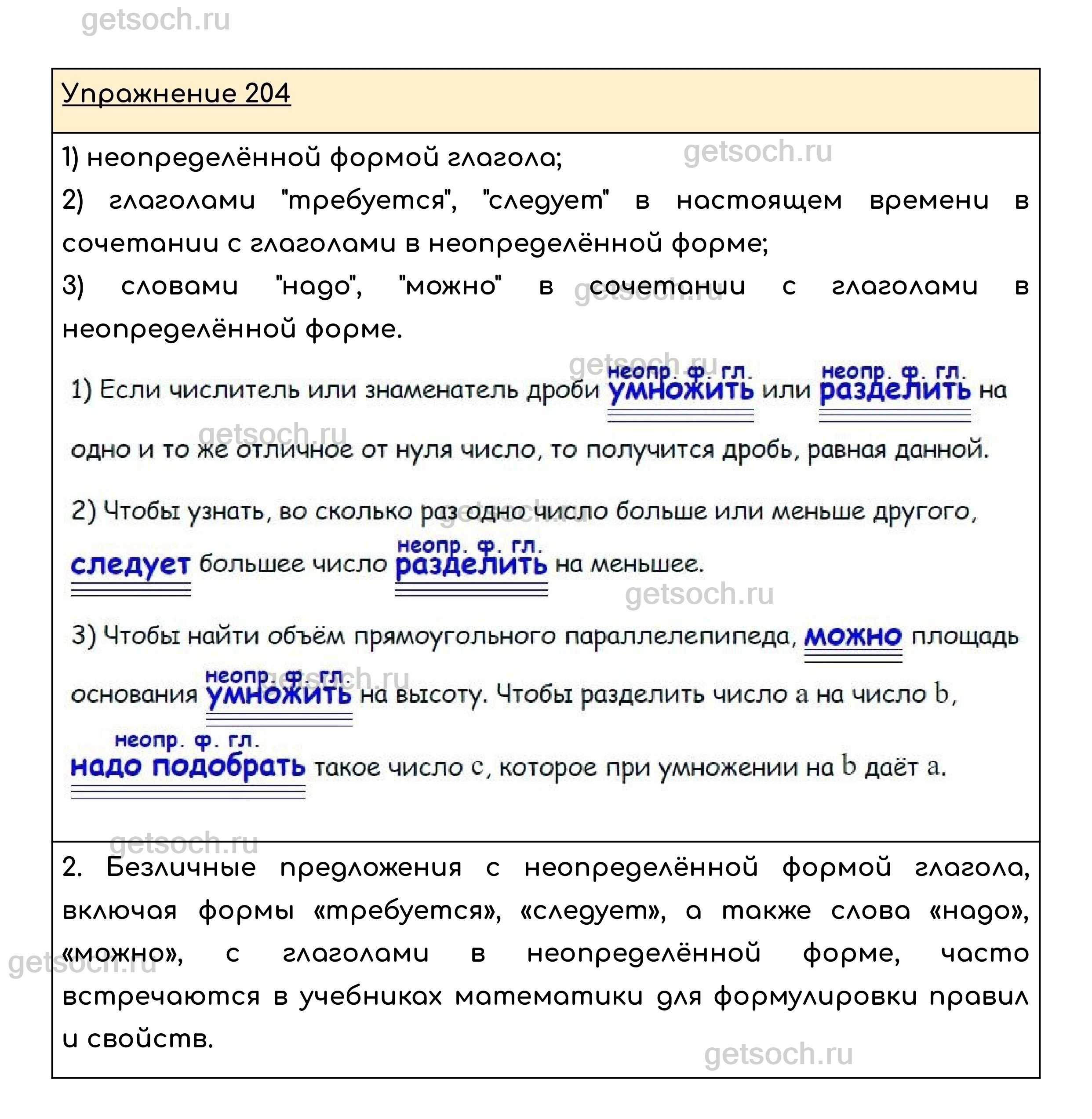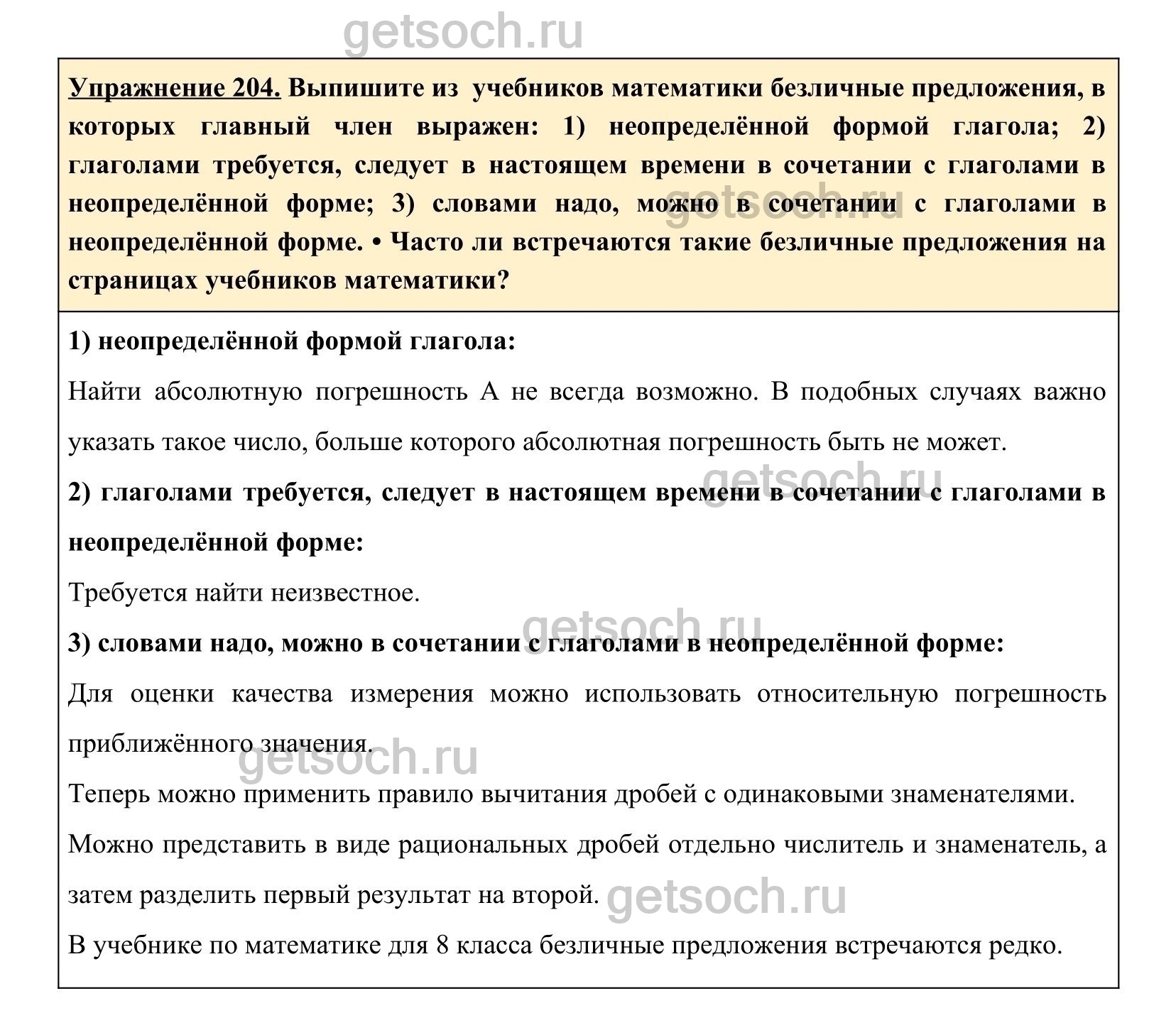 Упражнение 204. Выпишите из учебников математики безличные предложения, в которых главный член выражен: 1) неопределённой формой глагола; 2) глаголами требуется, следует в настоящем времени в сочетании с глаголами в неопределённой форме; 3) словами надо, можно в сочетании с глаголами в неопределённой форме. • Часто ли встречаются такие безличные предложения на страницах учебников математики?