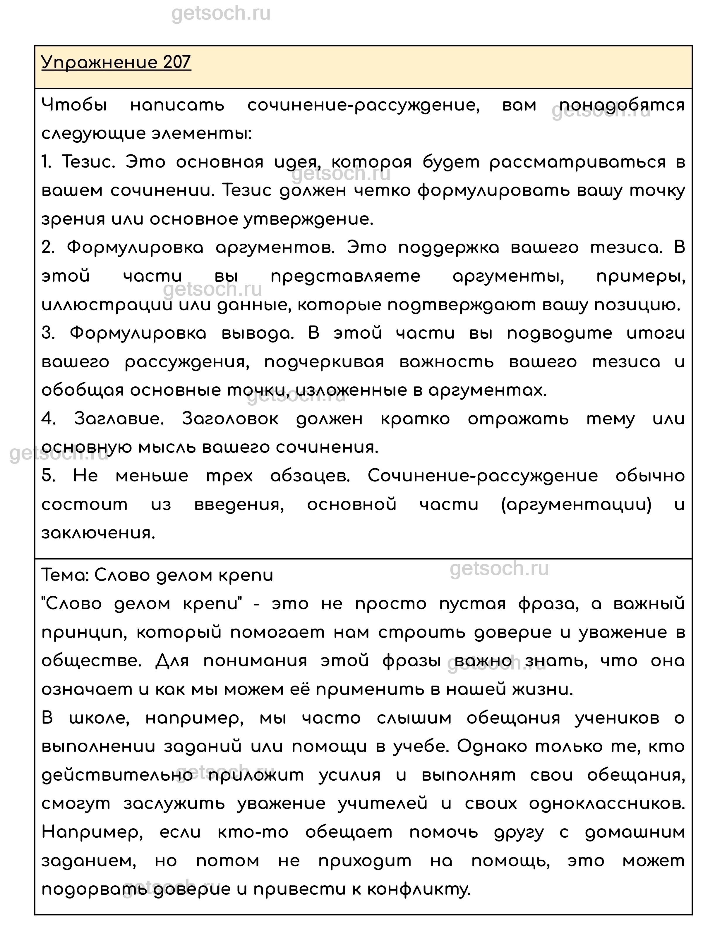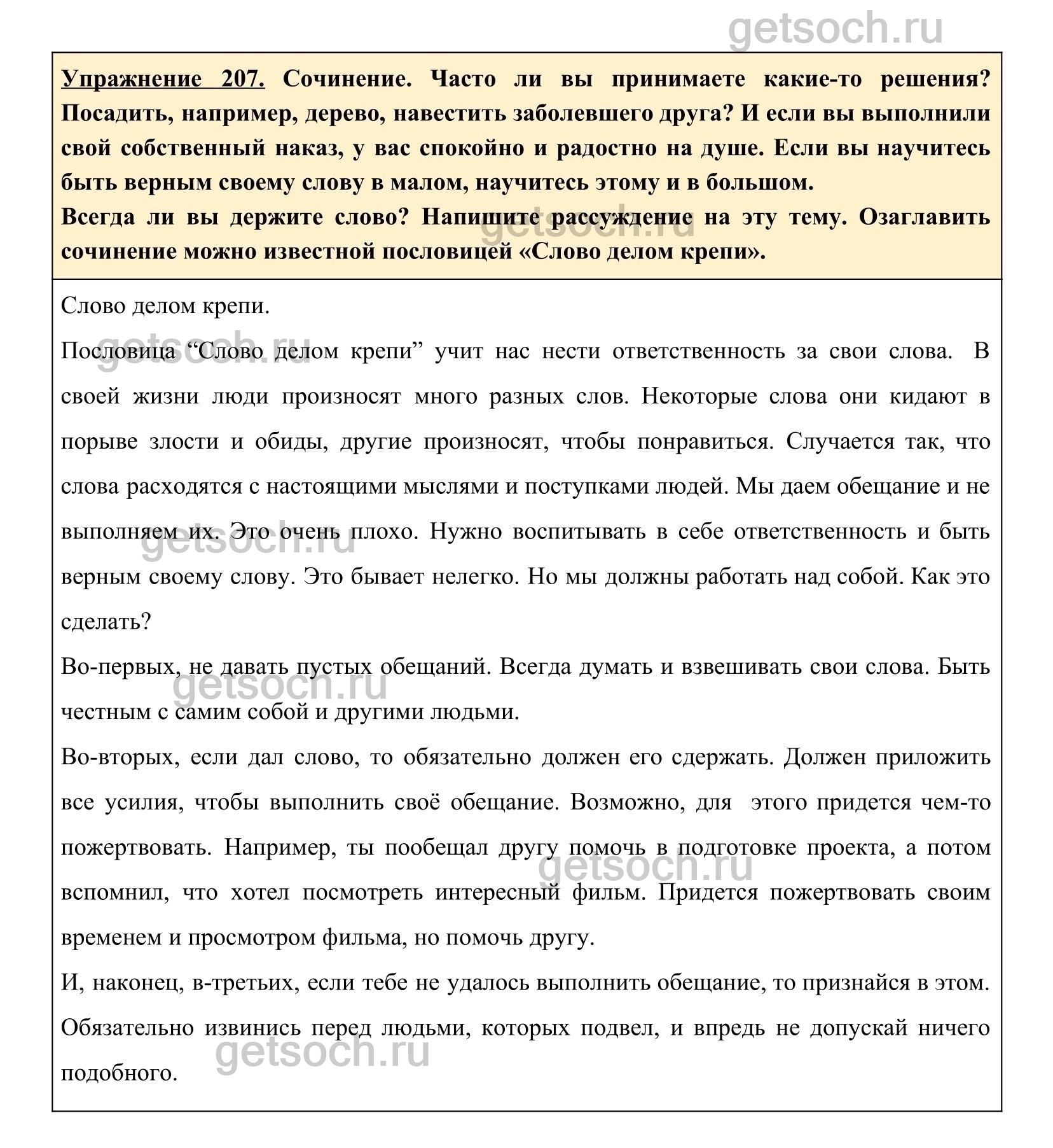 Упражнение 207. Сочинение. Часто ли вы принимаете какие-то решения? Посадить, например, дерево, навестить заболевшего друга? И если вы выполнили свой собственный наказ, у вас спокойно и радостно на душе. Если вы научитесь быть верным своему слову в малом, научитесь этому и в большом.