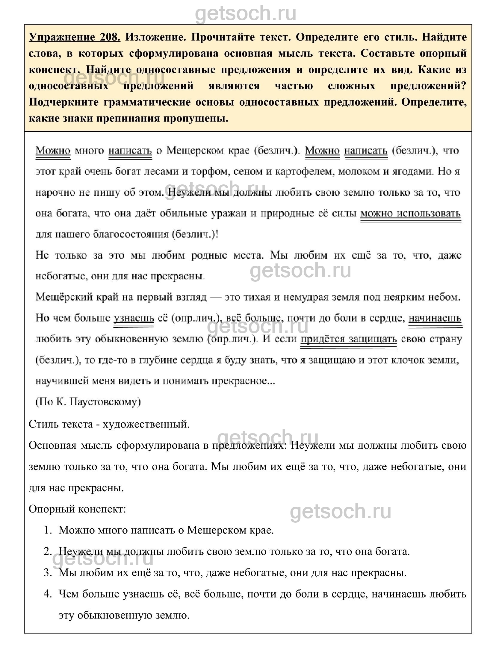 Упражнение 208. Изложение. Прочитайте текст. Определите его стиль. Найдите слова, в которых сформулирована основная мысль текста. Составьте опорный конспект. Найдите односоставные предложения и определите их вид. Какие из односоставных предложений являются частью сложных предложений? Подчеркните грамматические основы односоставных предложений. Определите, какие знаки препинания пропущены.