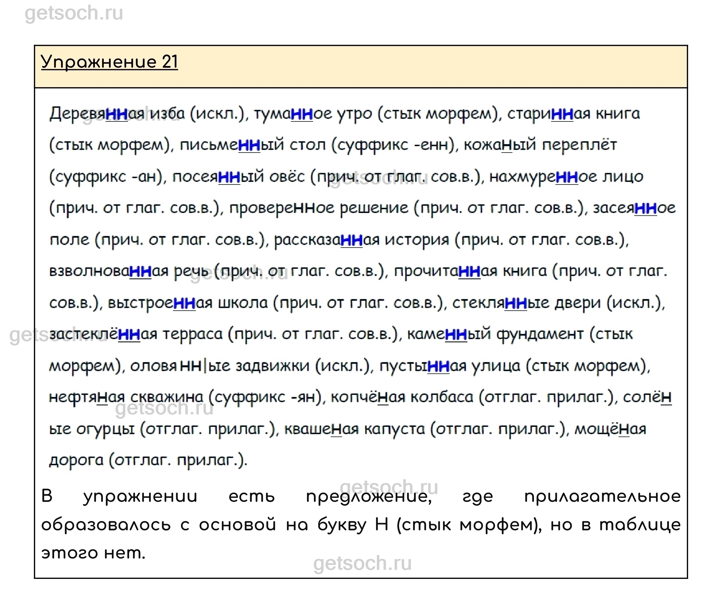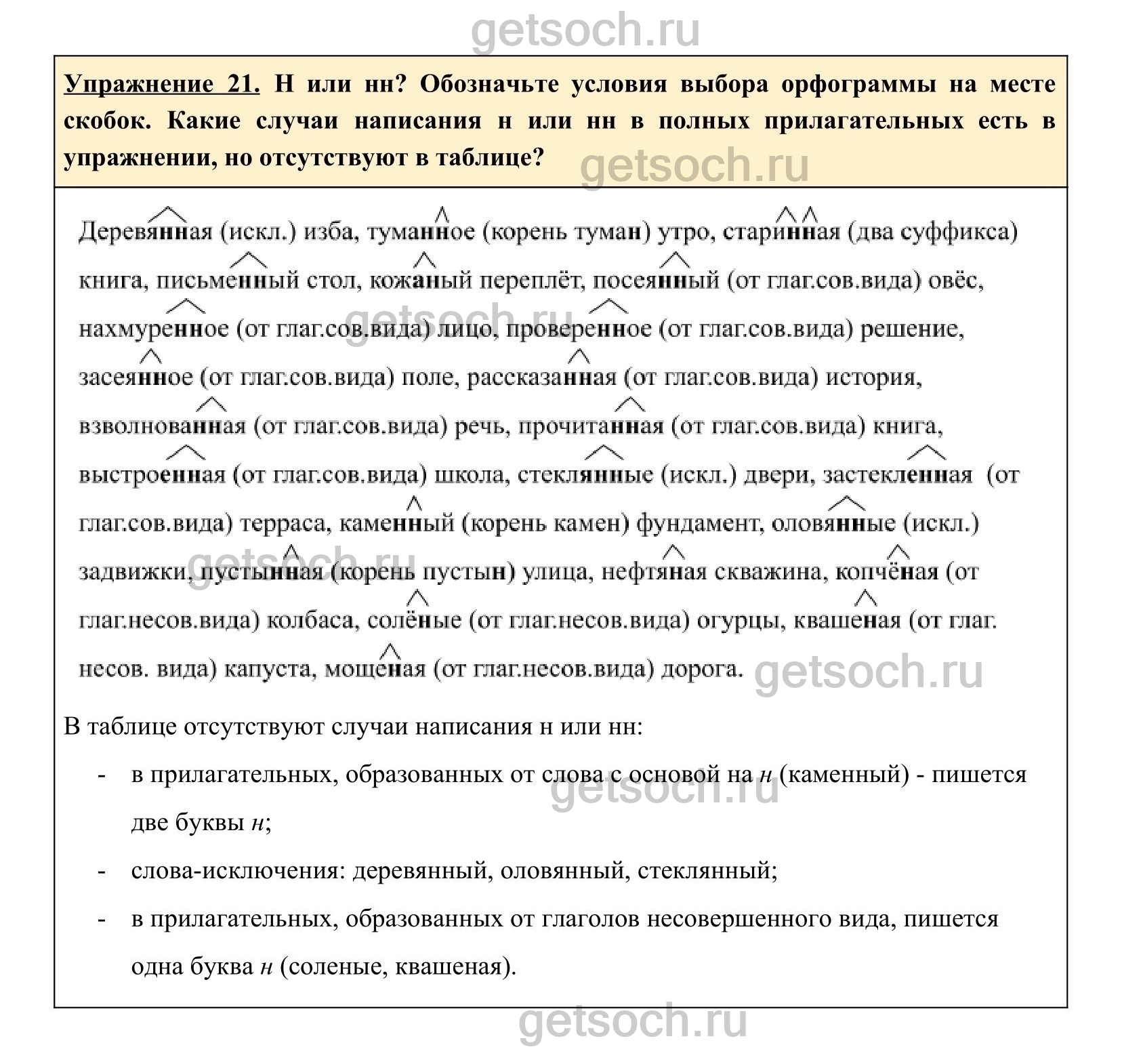 Упражнение 21. Н или нн? Обозначьте условия выбора орфограммы на месте скобок. Какие случаи написания н или нн в полных прилагательных есть в упражнении, но отсутствуют в таблице?