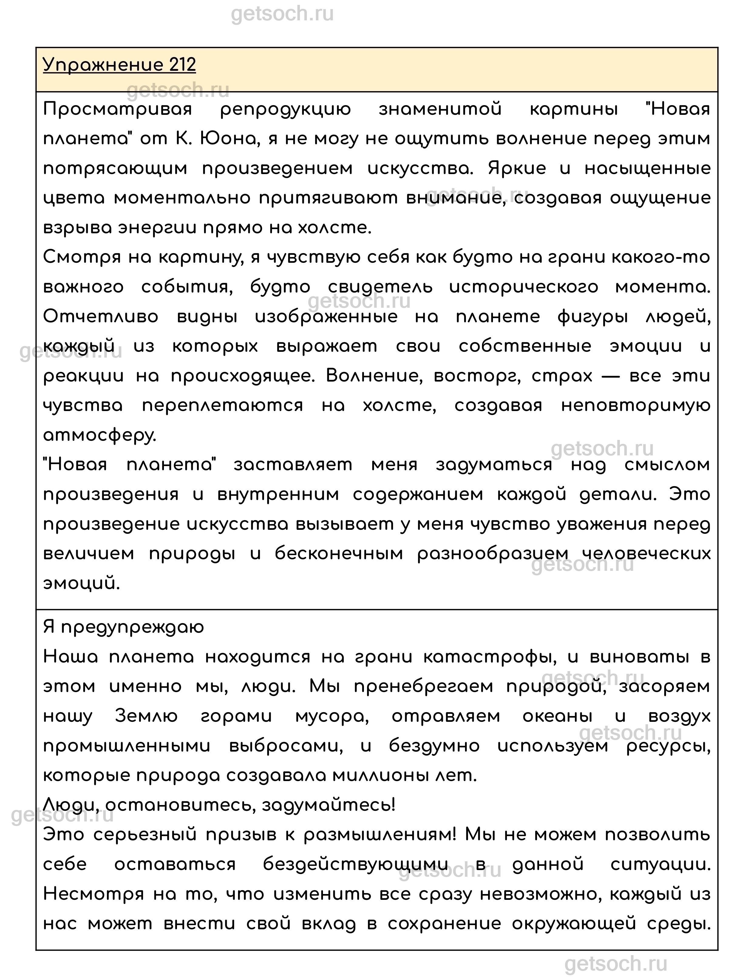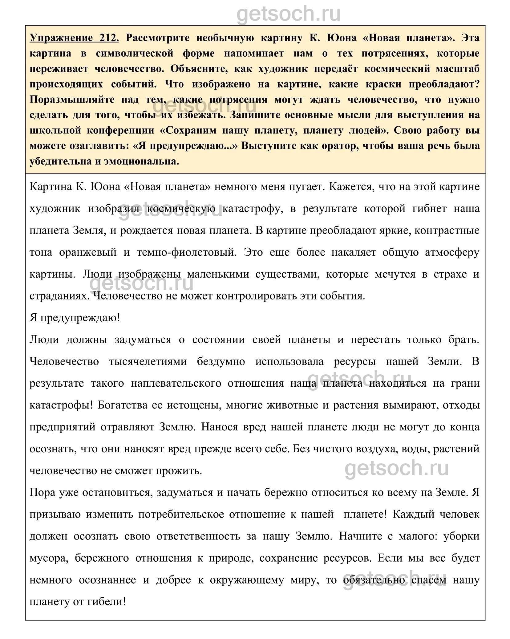 Упражнение 212. Рассмотрите необычную картину К. Юона «Новая планета». Эта картина в символической форме напоминает нам о тех потрясениях, которые переживает человечество. Объясните, как художник передаёт космический масштаб происходящих событий. Что изображено на картине, какие краски преобладают? Поразмышляйте над тем, какие потрясения могут ждать человечество, что нужно сделать для того, чтобы их избежать. Запишите основные мысли для выступления на школьной конференции «Сохраним нашу планету, планету людей». Свою работу вы можете озаглавить: «Я предупреждаю…» Выступите как оратор, чтобы ваша речь была убедительна и эмоциональна.