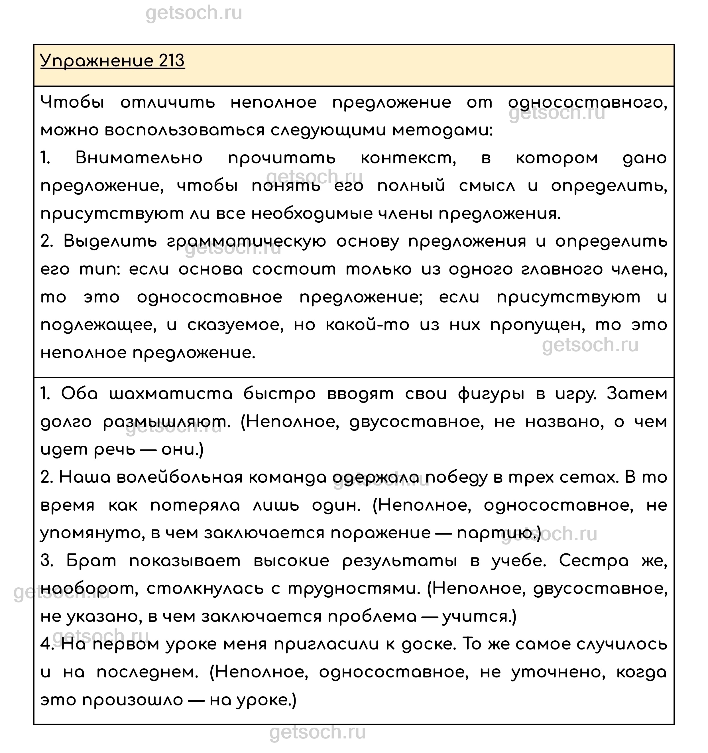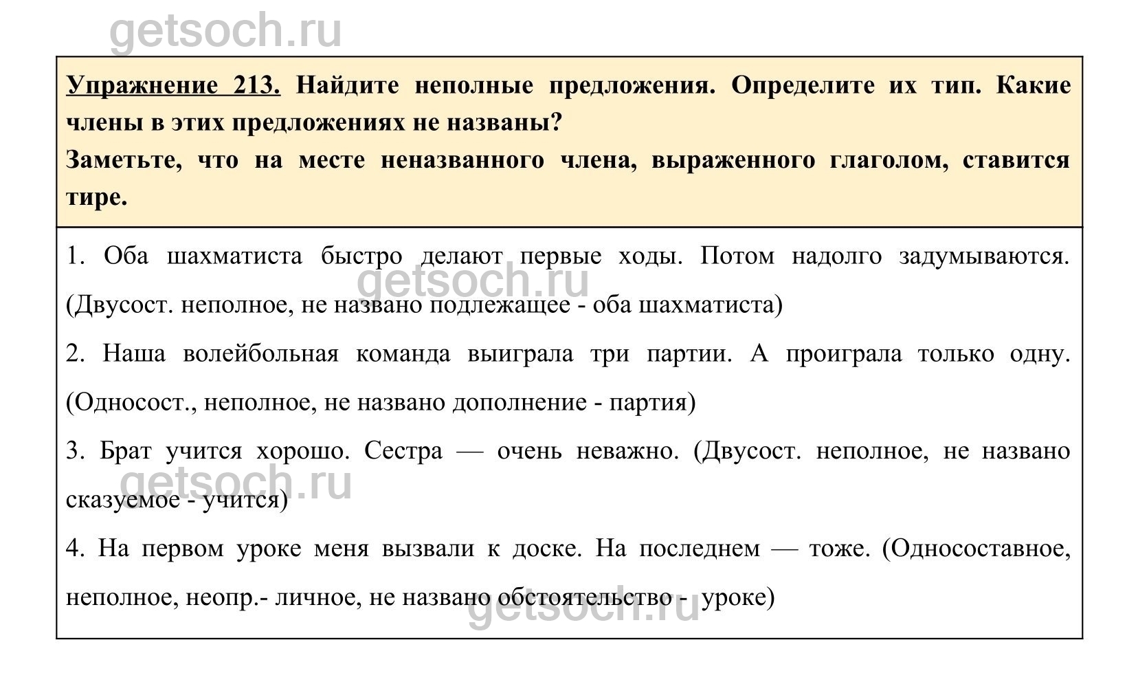 Упражнение 213. Найдите неполные предложения. Определите их тип. Какие члены в этих предложениях не названы?