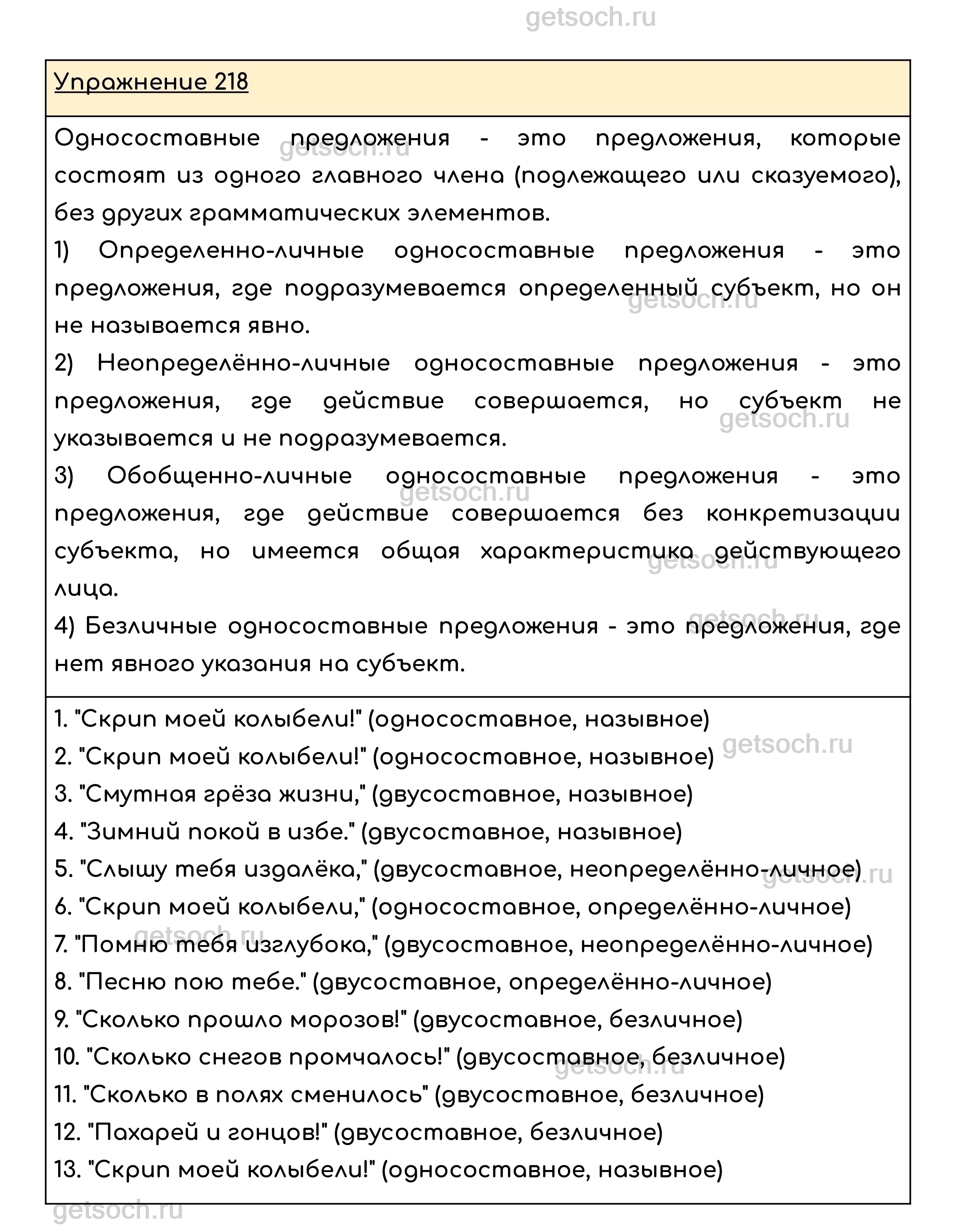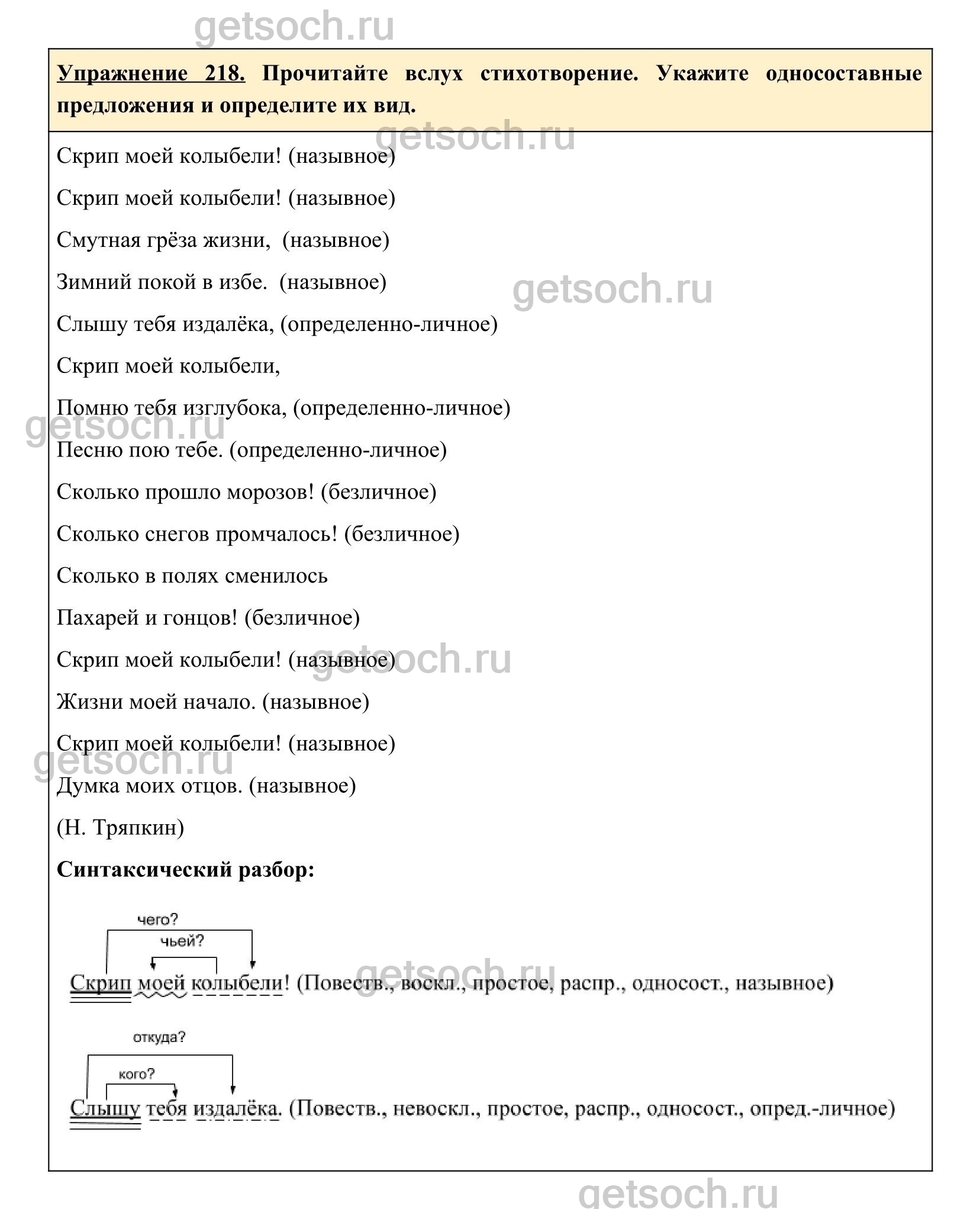 Упражнение 218. Прочитайте вслух стихотворение. Укажите односоставные предложения и определите их вид.