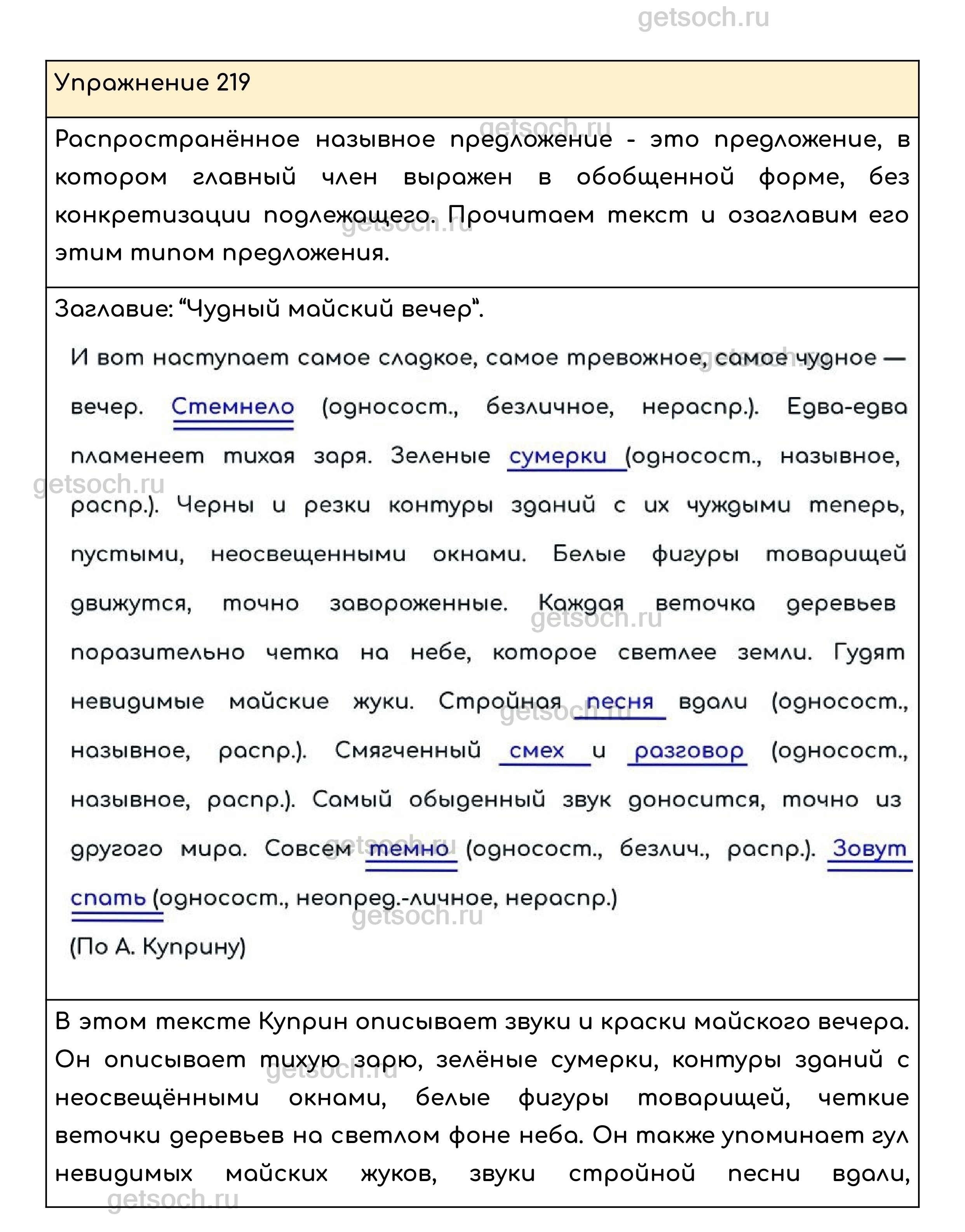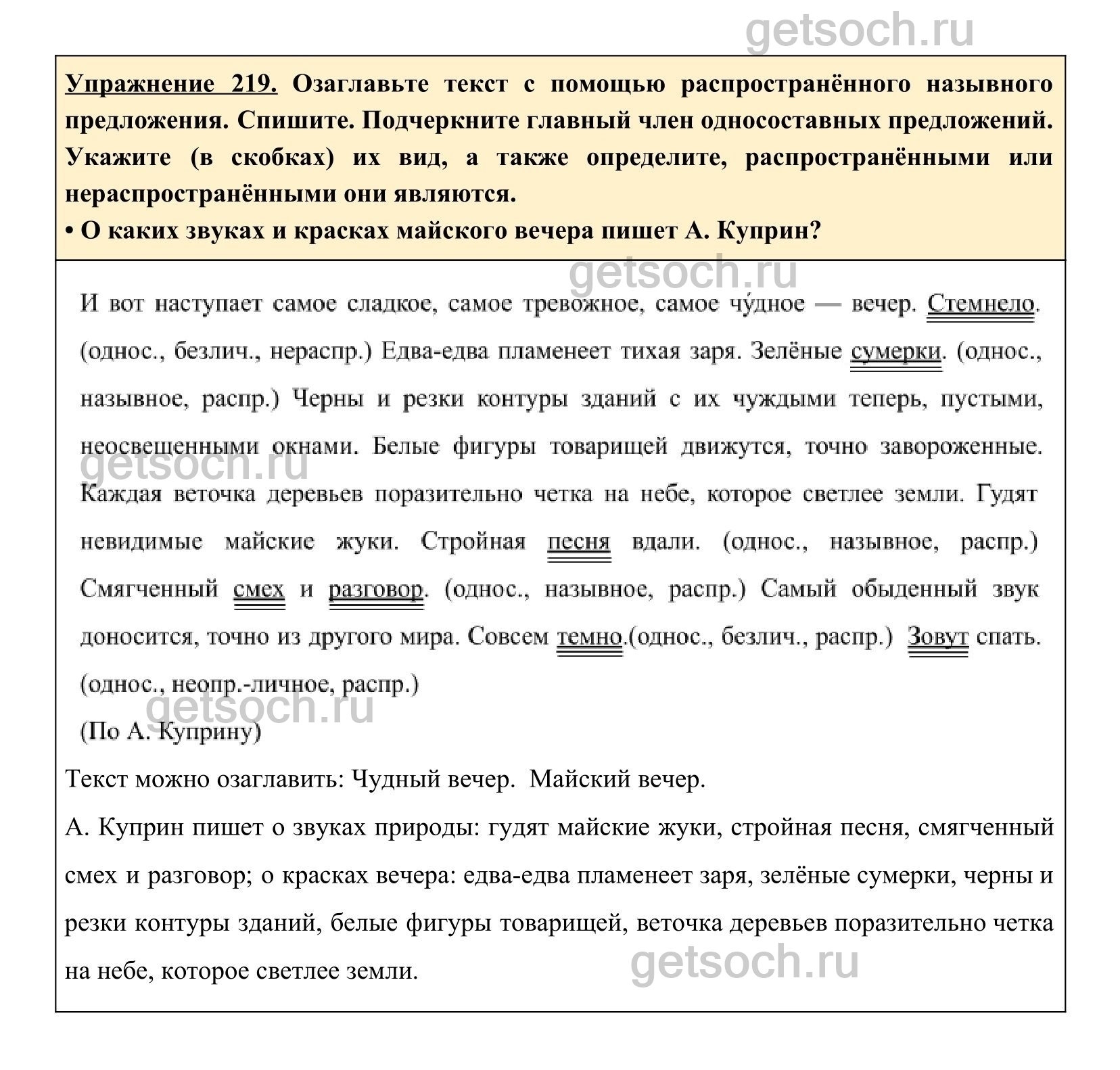 Упражнение 219. Озаглавьте текст с помощью распространённого назывного предложения. Спишите. Подчеркните главный член односоставных предложений. Укажите (в скобках) их вид, а также определите, распространёнными или нераспространёнными они являются.