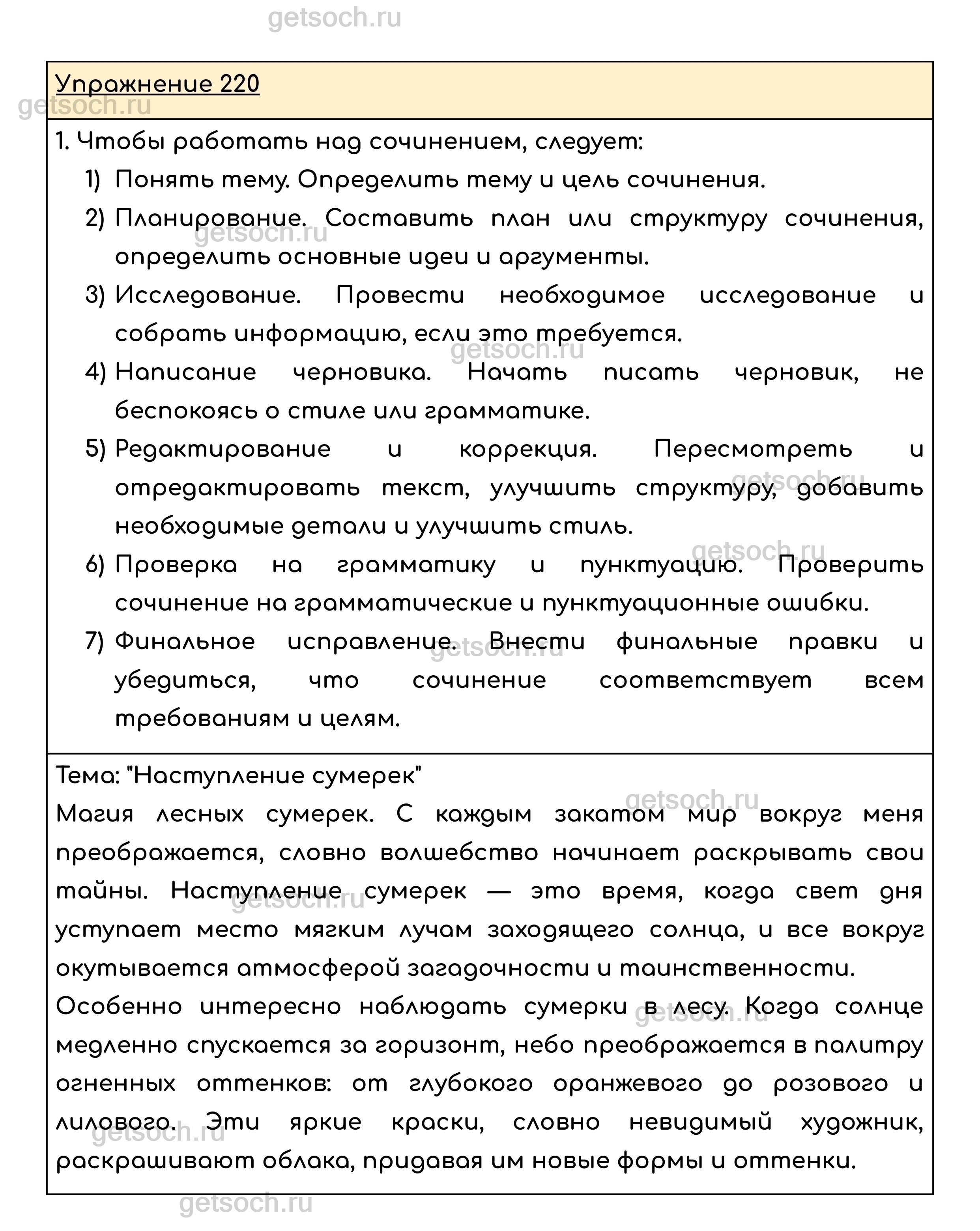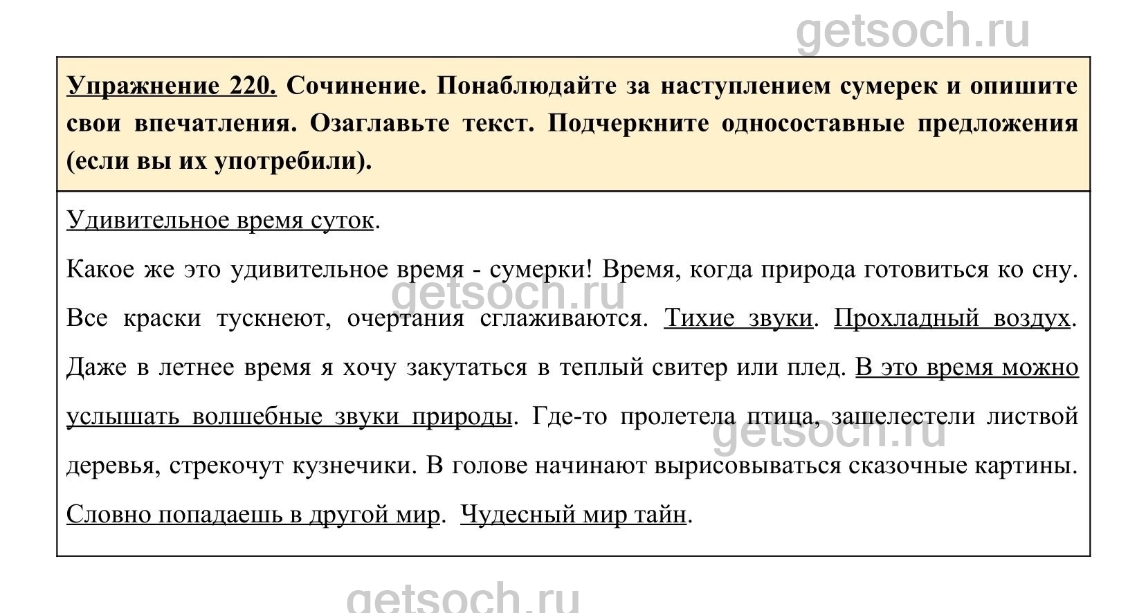 Упражнение 220. Сочинение. Понаблюдайте за наступлением сумерек и опишите свои впечатления. Озаглавьте текст. Подчеркните односоставные предложения (если вы их употребили).