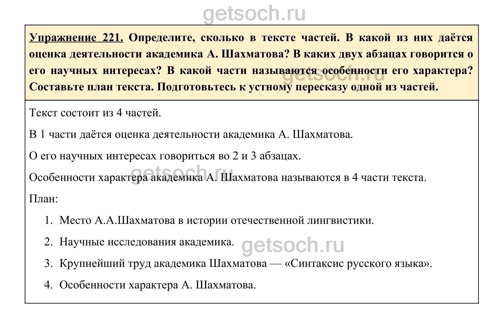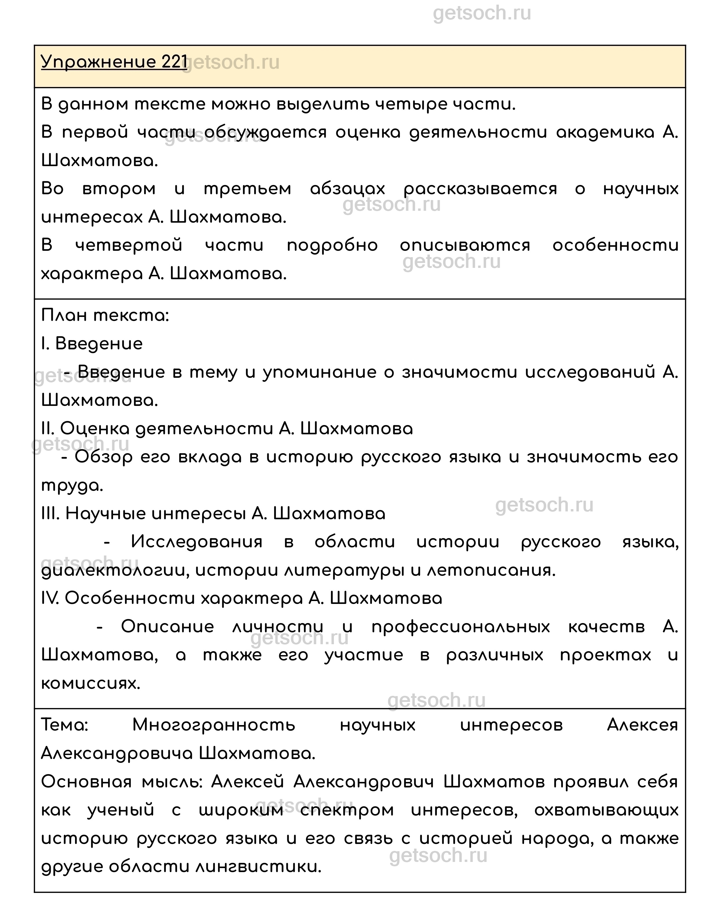 Упражнение 221. Определите, сколько в тексте частей. В какой из них даётся оценка деятельности академика А. Шахматова? В каких двух абзацах говорится о его научных интересах? В какой части называются особенности его характера? Составьте план текста. Подготовьтесь к устному пересказу одной из частей.