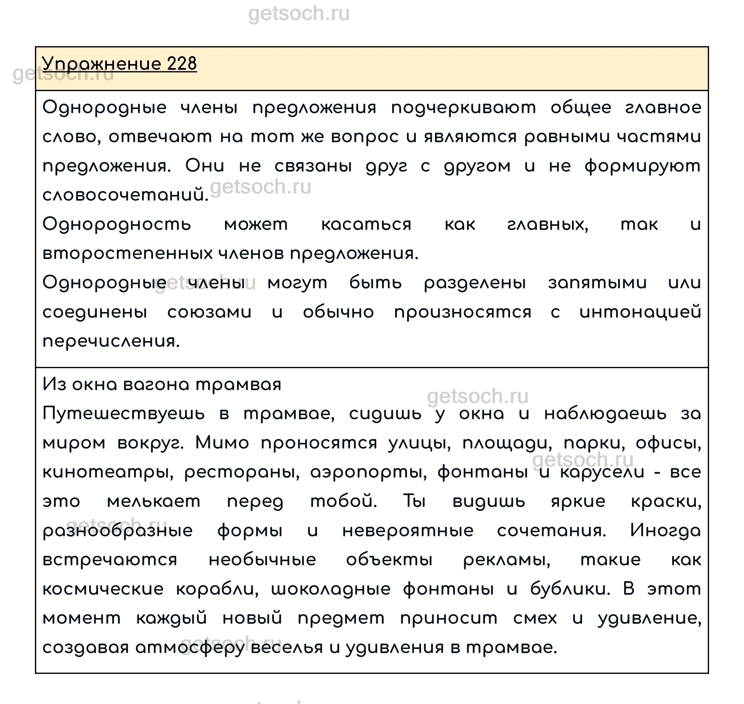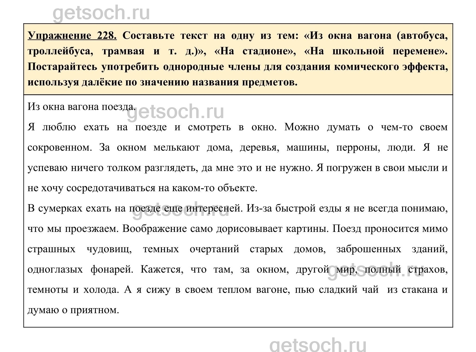 Упражнение 228. Составьте текст на одну из тем: «Из окна вагона (автобуса, троллейбуса, трамвая и т. д.)», «На стадионе», «На школьной перемене». Постарайтесь употребить однородные члены для создания комического эффекта, используя далёкие по значению названия предметов.