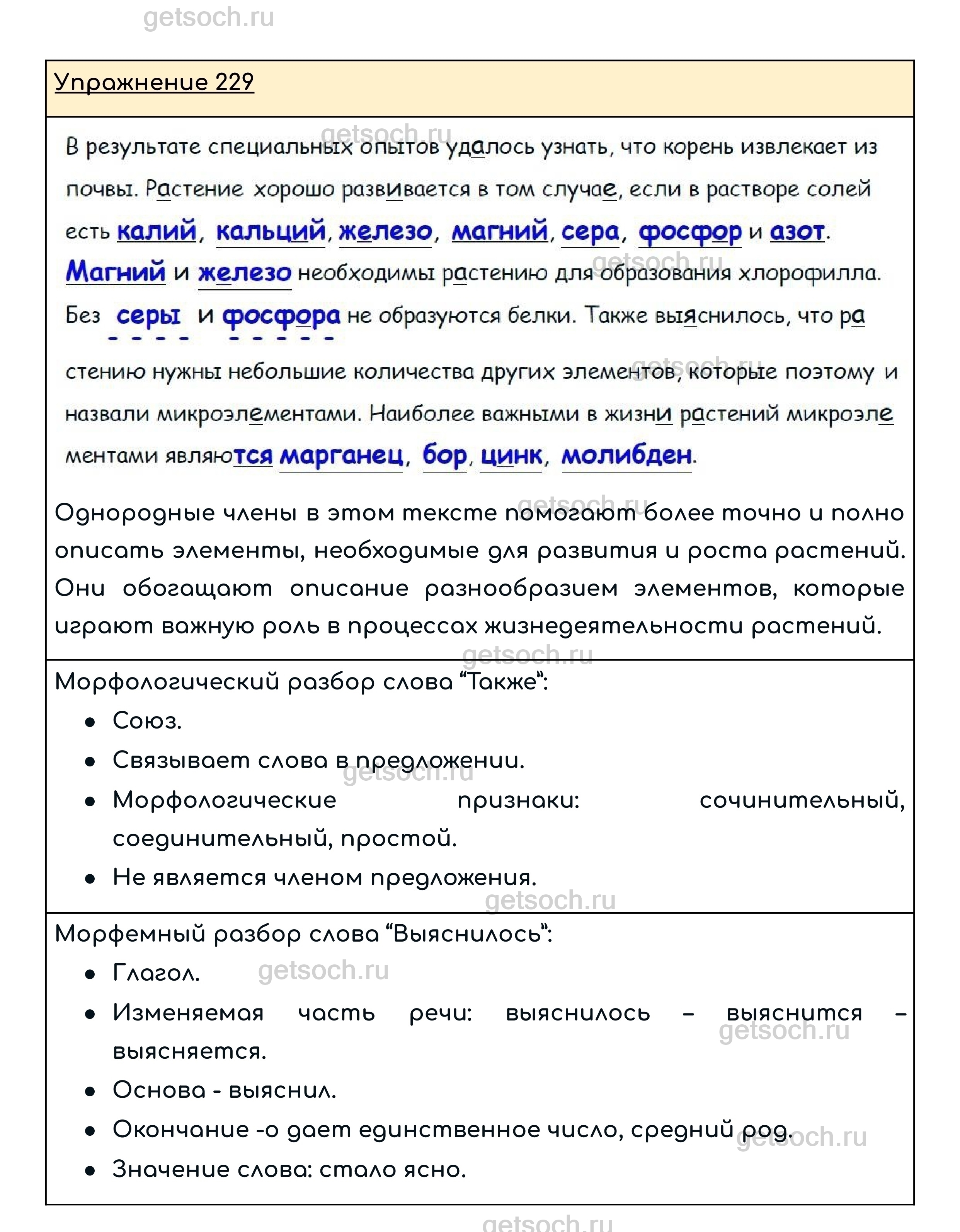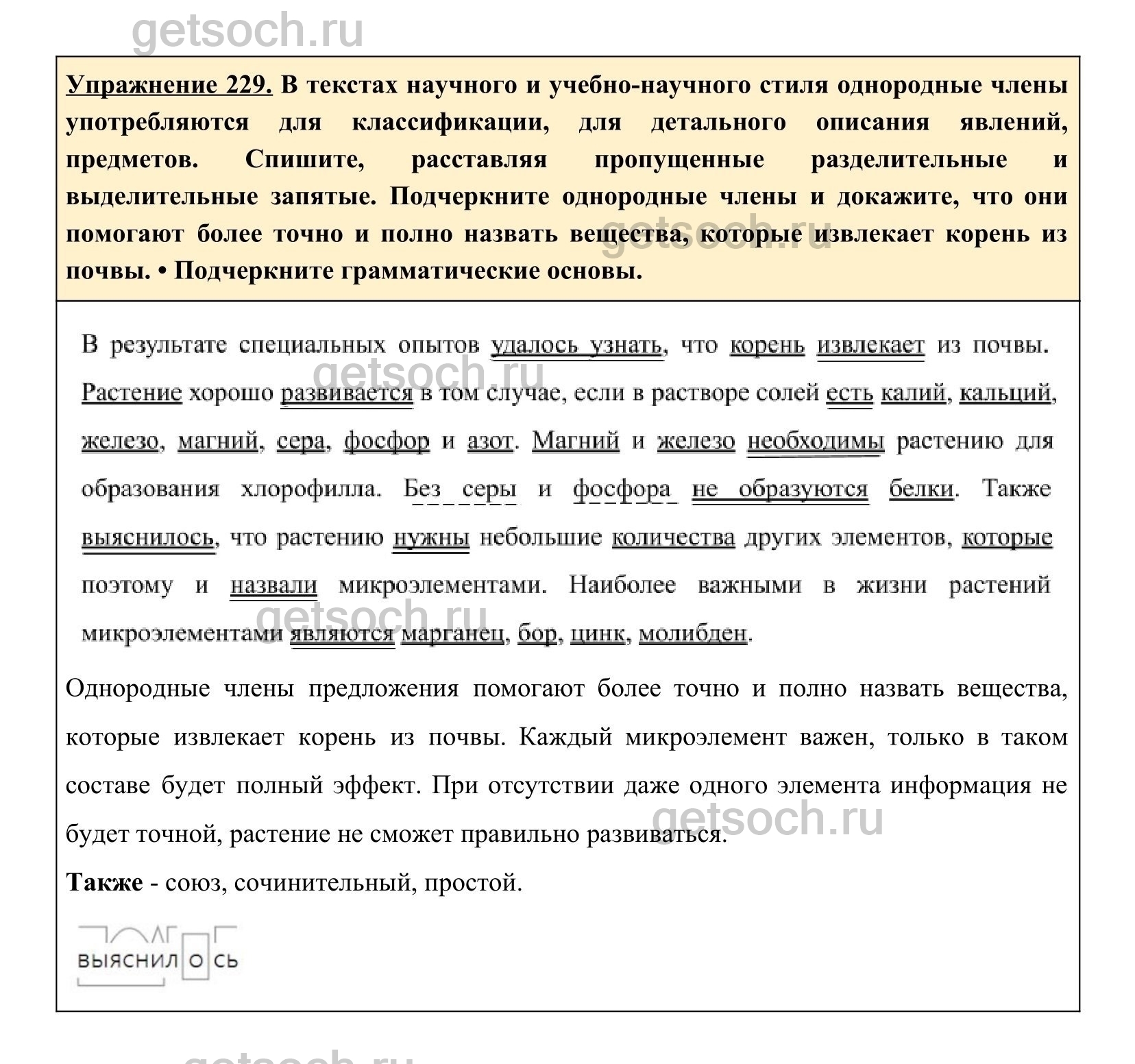 Упражнение 229. В текстах научного и учебно-научного стиля однородные члены употребляются для классификации, для детального описания явлений, предметов. Спишите, расставляя пропущенные разделительные и выделительные запятые. Подчеркните однородные члены и докажите, что они помогают более точно и полно назвать вещества, которые извлекает корень из почвы. • Подчеркните грамматические основы.