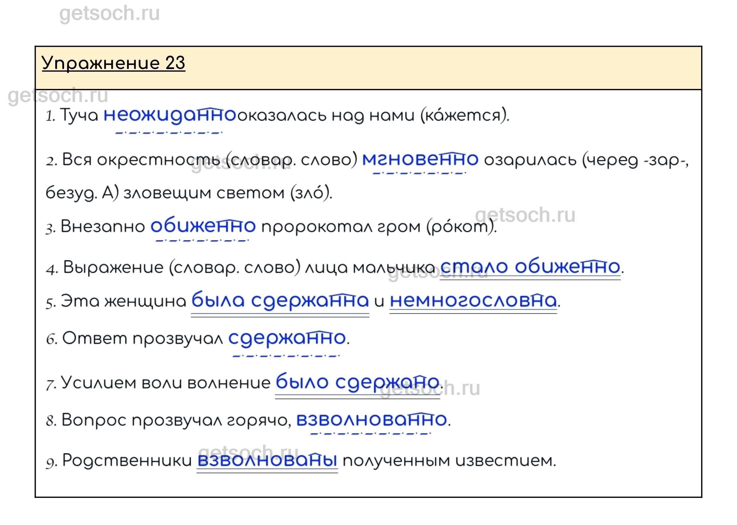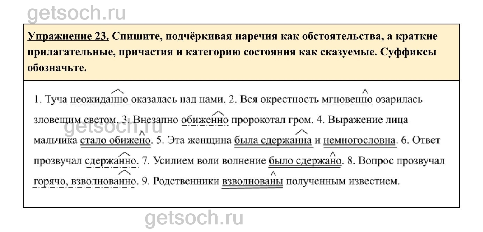 Упражнение 23. Спишите, подчёркивая наречия как обстоятельства, а краткие прилагательные, причастия и категорию состояния как сказуемые. Суффиксы обозначьте.