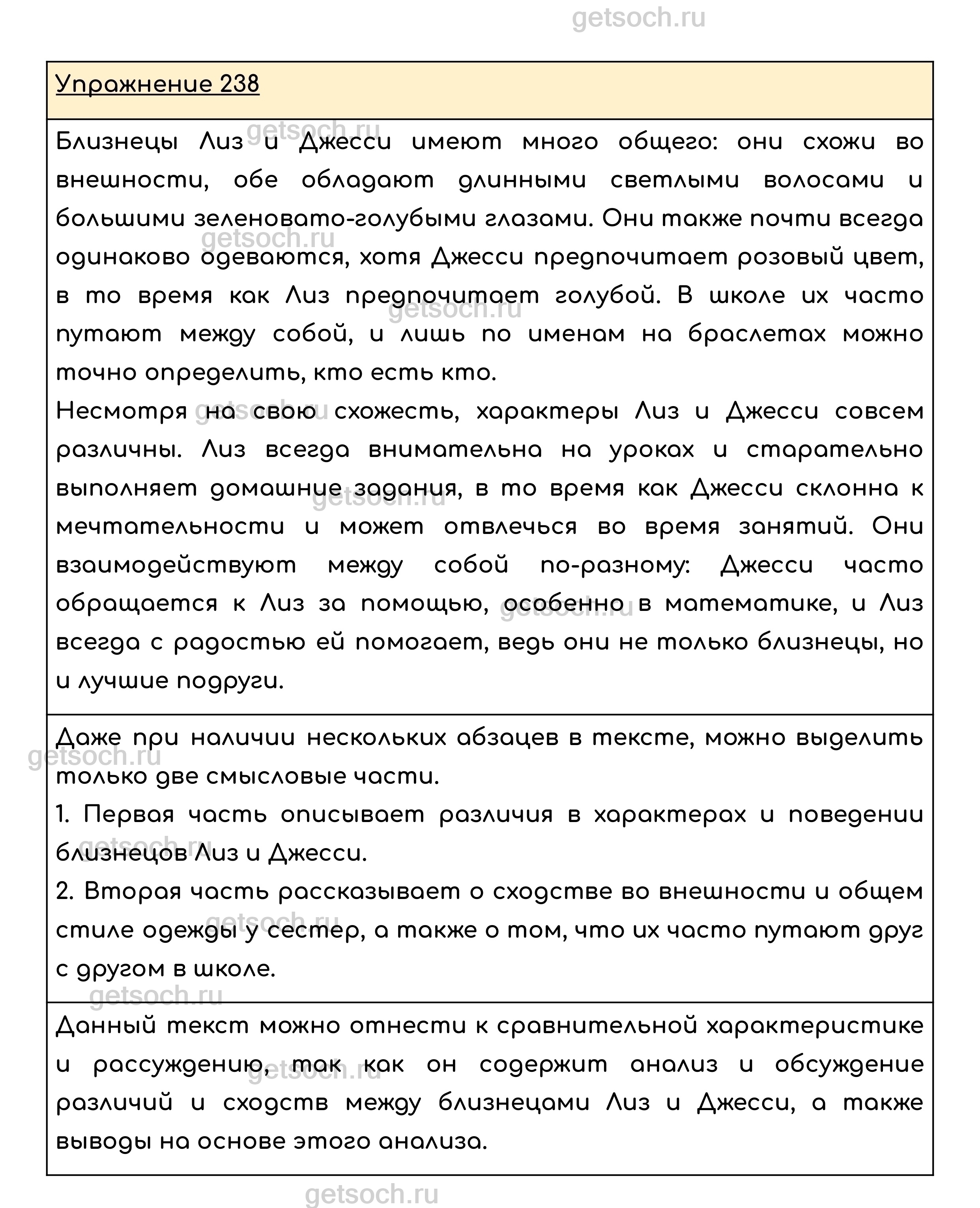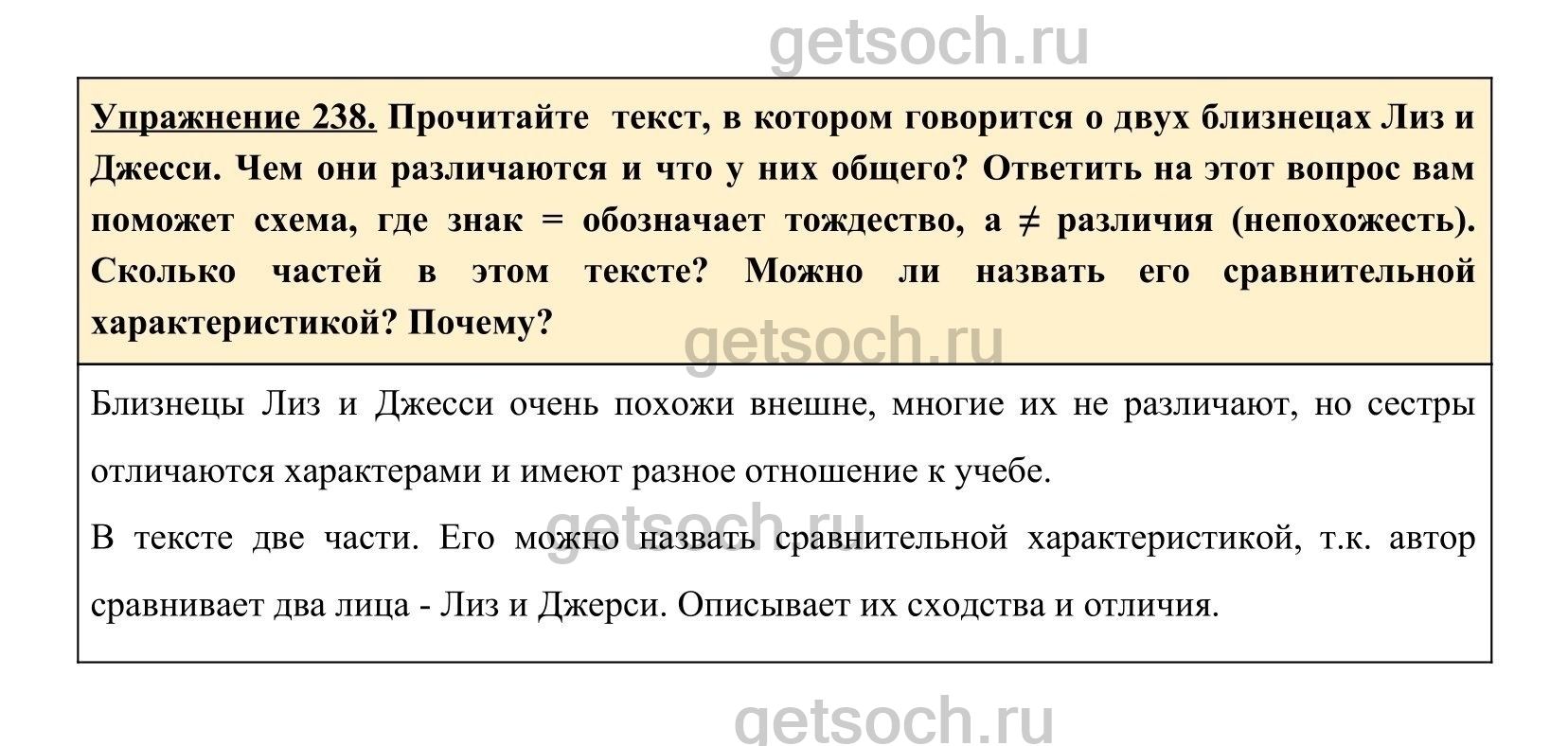 Упражнение 238. Прочитайте текст, в котором говорится о двух близнецах Лиз и Джесси. Чем они различаются и что у них общего? Ответить на этот вопрос вам поможет схема, где знак = обозначает тождество, а ≠ различия (непохожесть). Сколько частей в этом тексте? Можно ли назвать его сравнительной характеристикой? Почему?