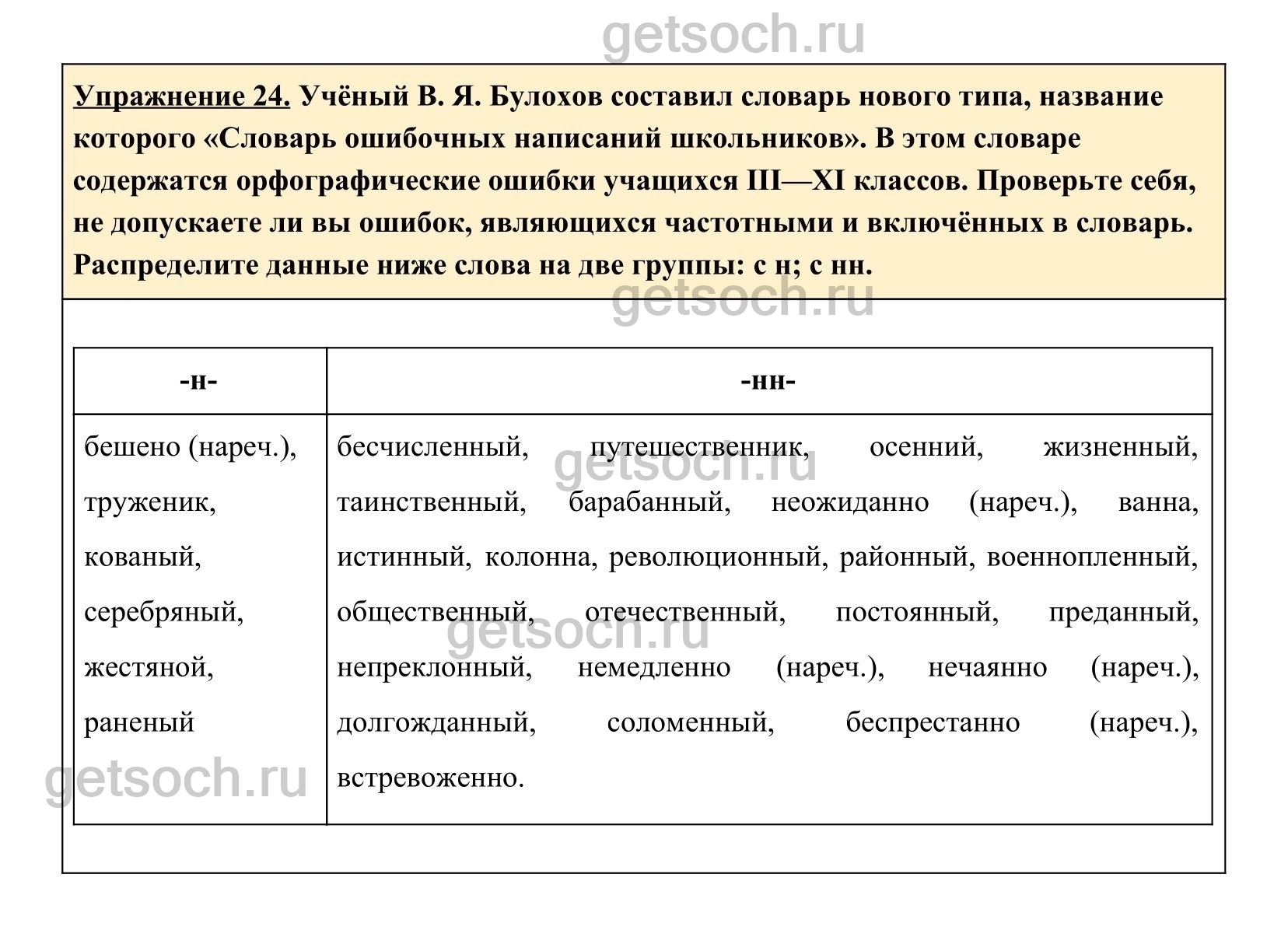Упражнение 24. Учёный В. Я. Булохов составил словарь нового типа, название которого «Словарь ошибочных написаний школьников». В этом словаре содержатся орфографические ошибки учащихся III—XI классов. Проверьте себя, не допускаете ли вы ошибок, являющихся частотными и включённых в словарь. Распределите данные ниже слова на две группы: с н; с нн.