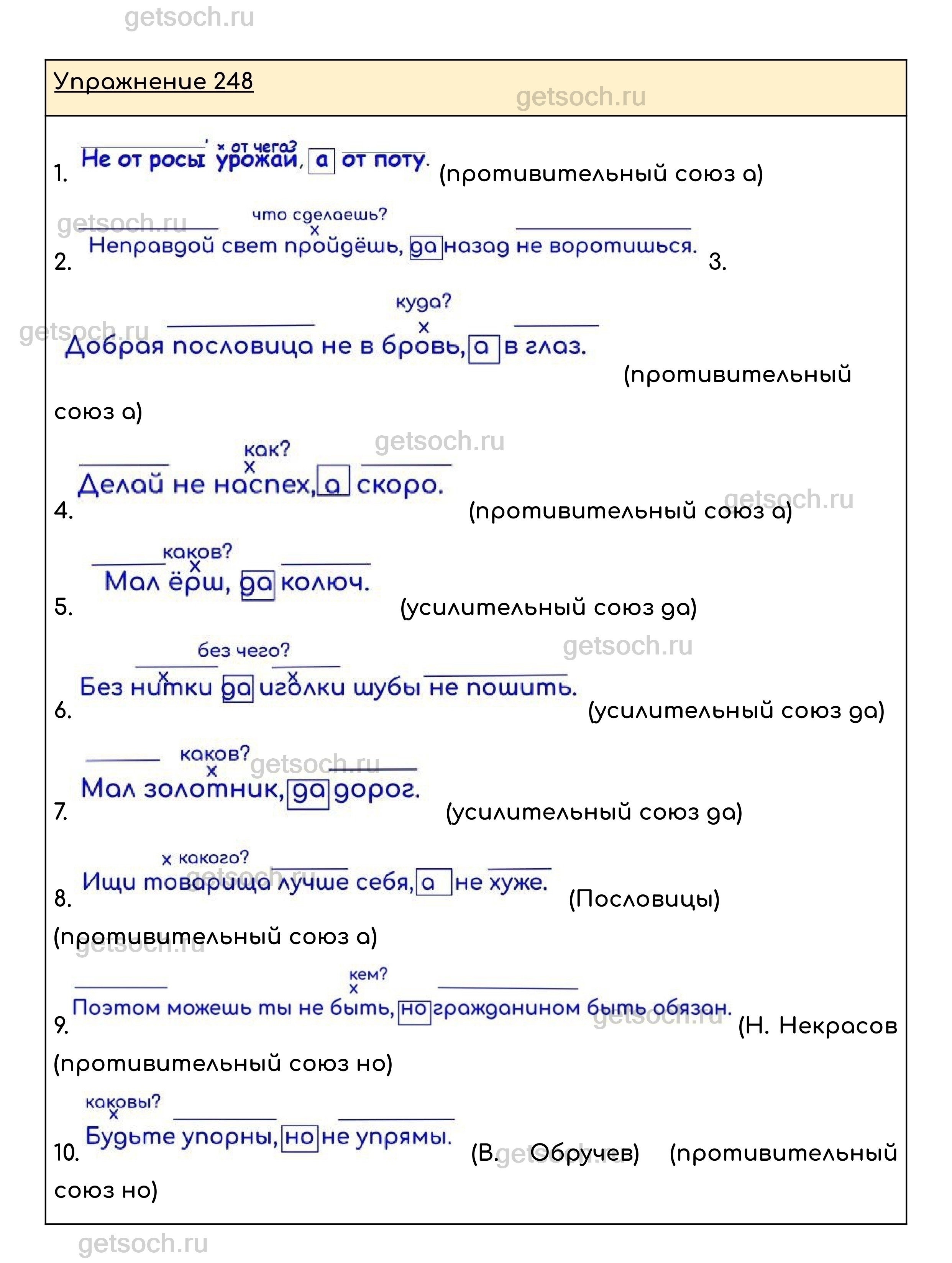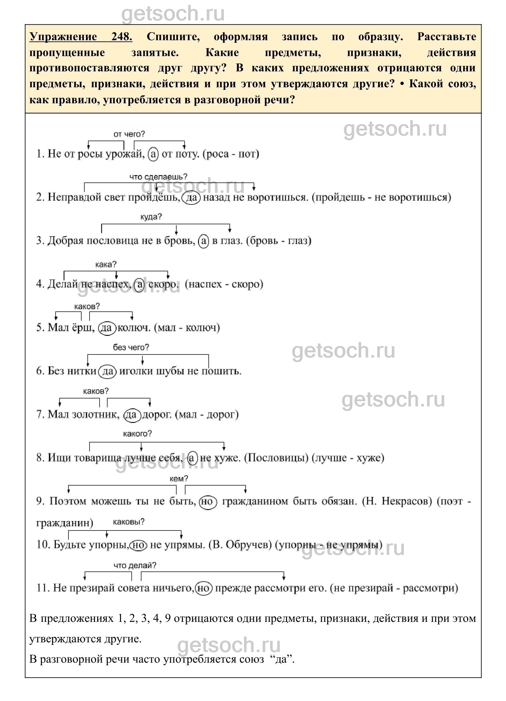 Упражнение 248. Спишите, оформляя запись по образцу. Расставьте пропущенные запятые. Какие предметы, признаки, действия противопоставляются друг другу? В каких предложениях отрицаются одни предметы, признаки, действия и при этом утверждаются другие? • Какой союз, как правило, употребляется в разговорной речи?