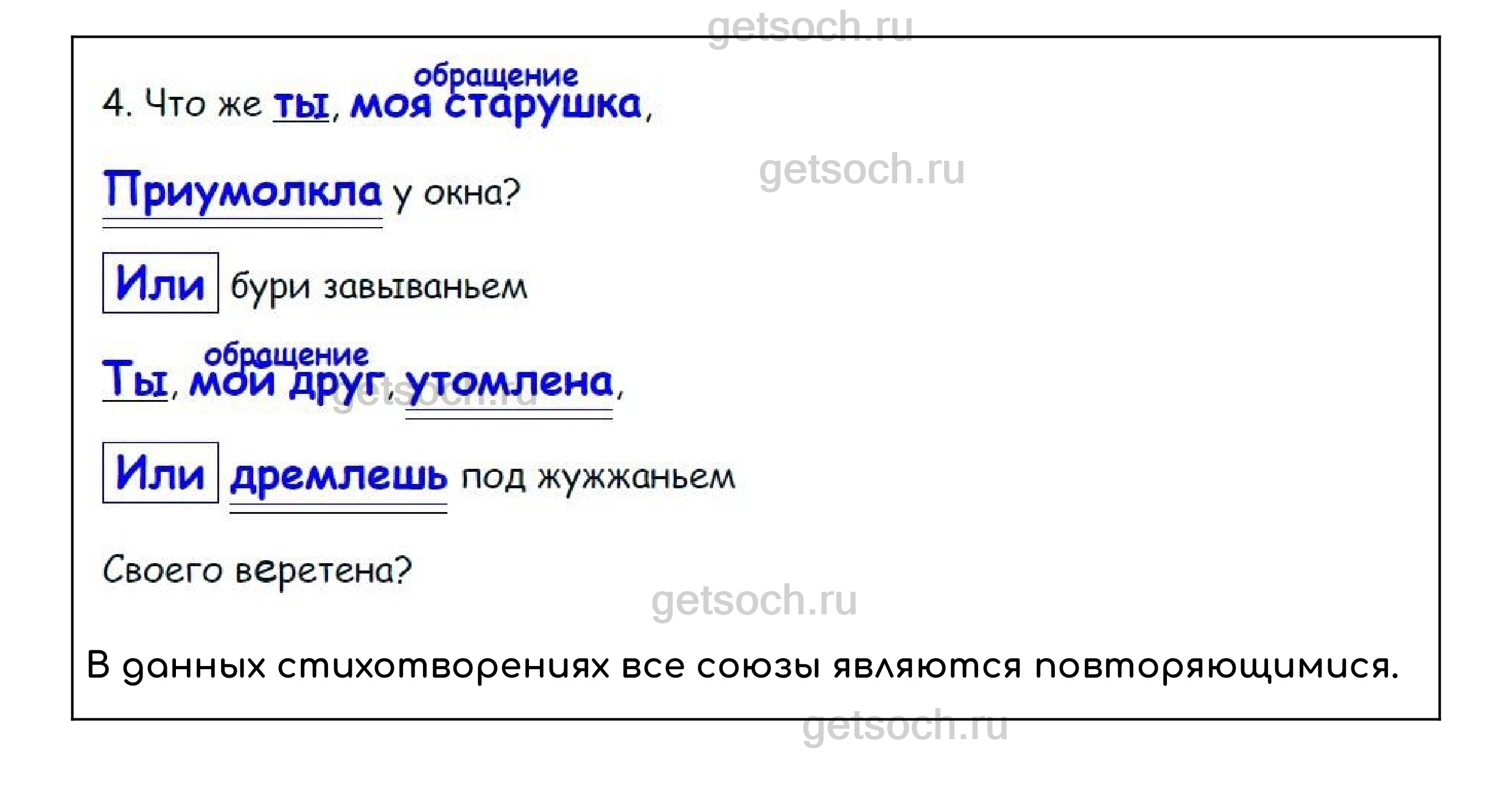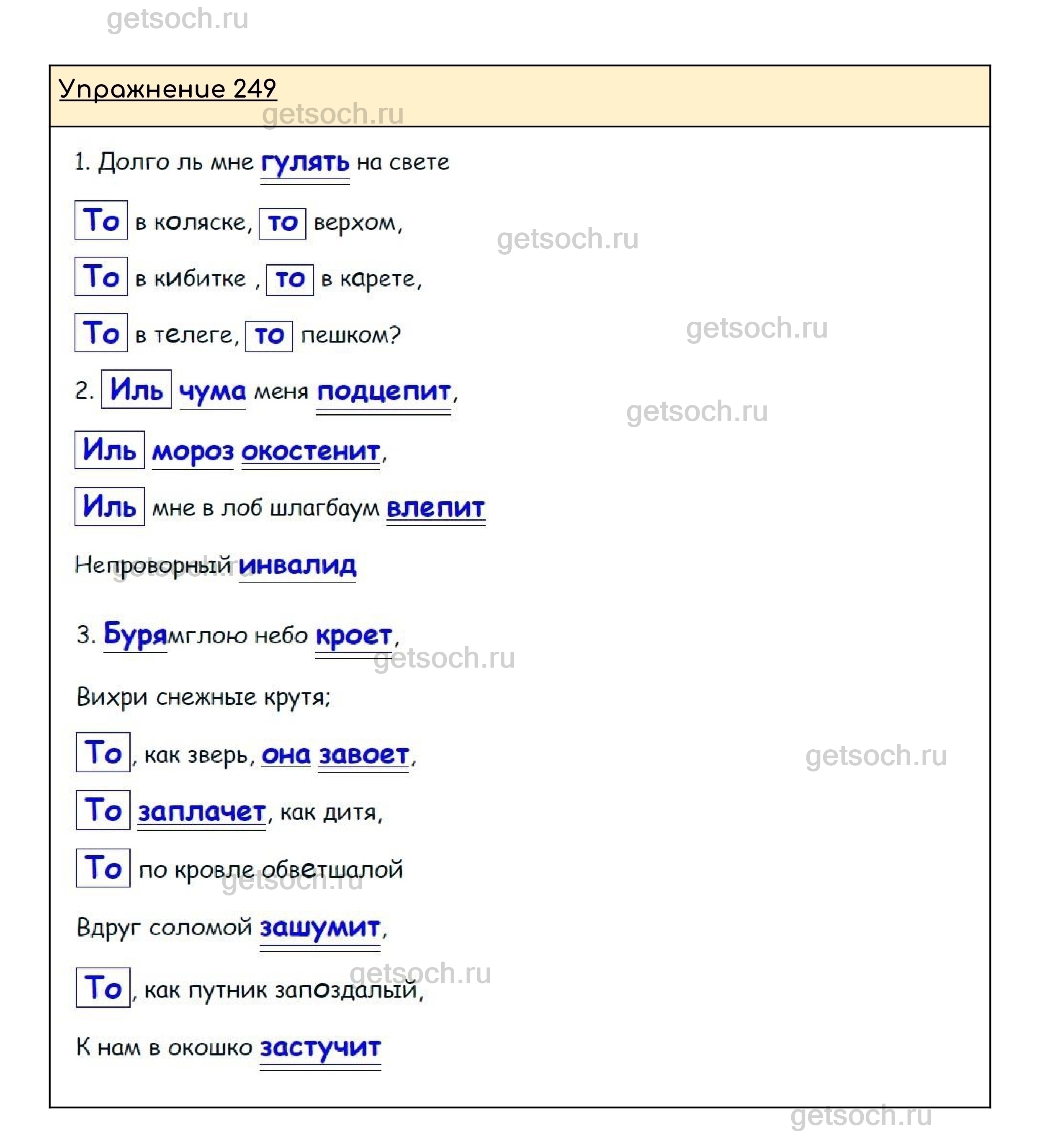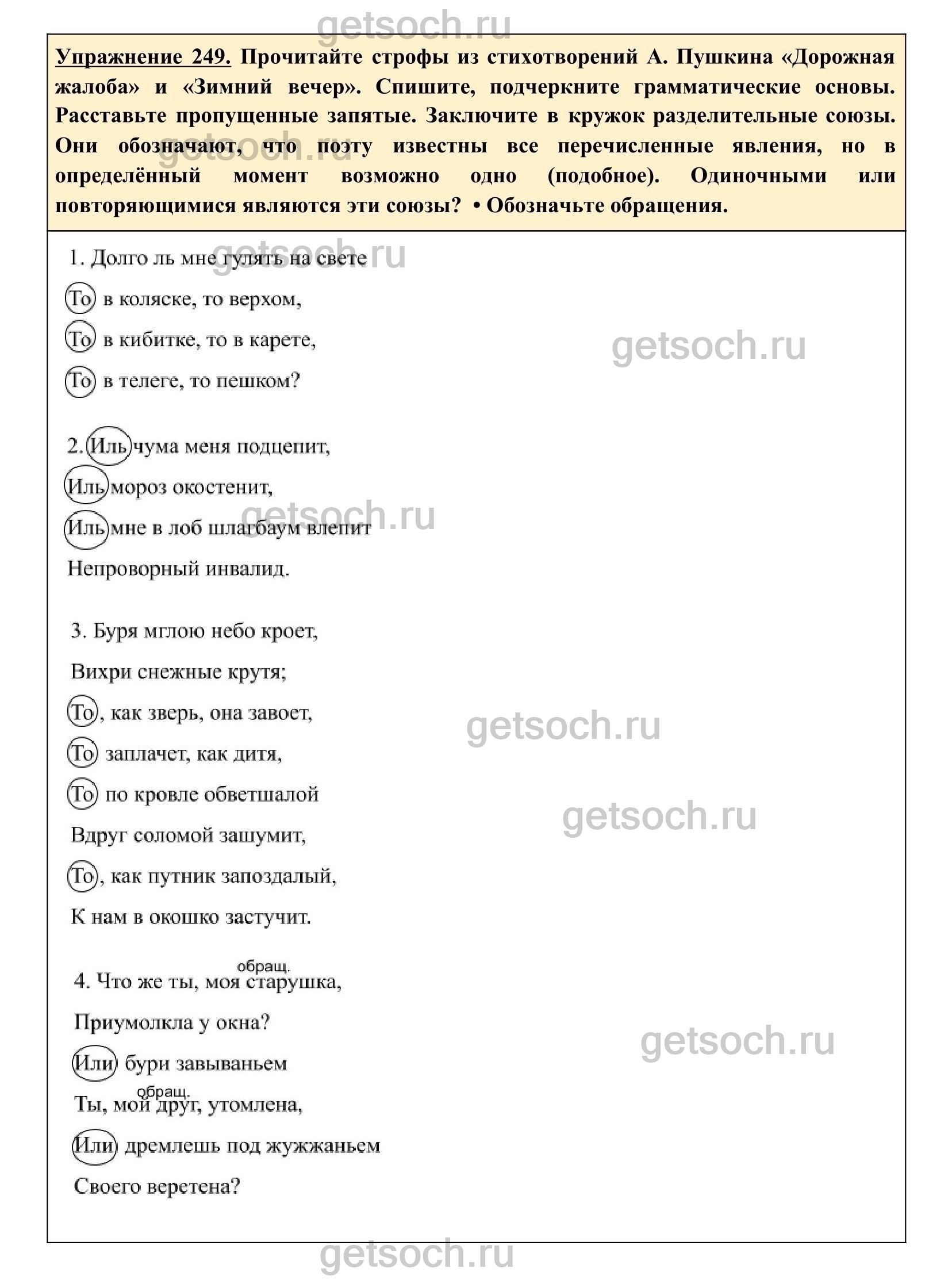 Упражнение 249. Прочитайте строфы из стихотворений А. Пушкина «Дорожная жалоба» и «Зимний вечер». Спишите, подчеркните грамматические основы. Расставьте пропущенные запятые. Заключите в кружок разделительные союзы. Они обозначают, что поэту известны все перечисленные явления, но в определённый момент возможно одно (подобное). Одиночными или повторяющимися являются эти союзы? • Обозначьте обращения.